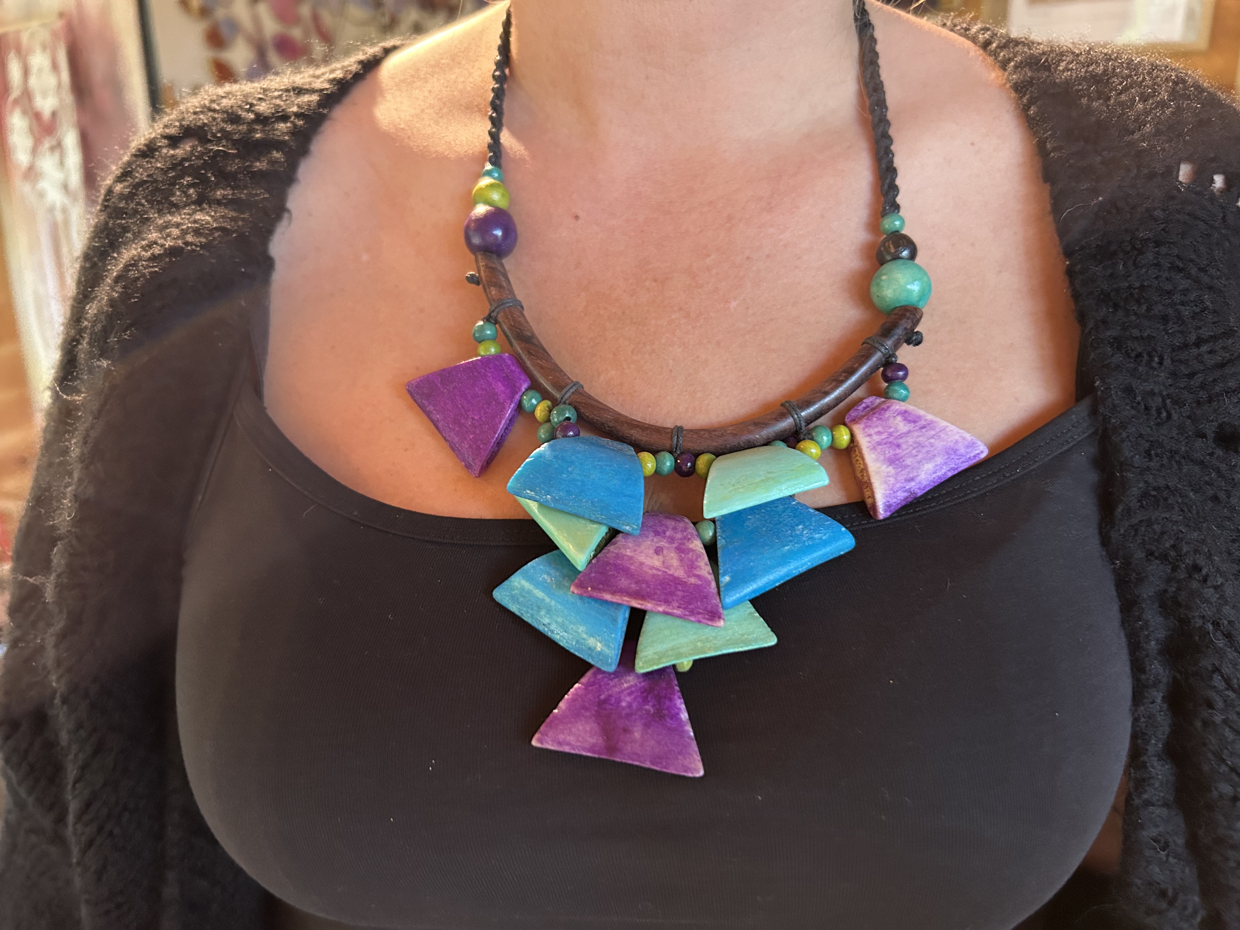 Le collier Artisanal Bleu Turquoise & Violet est une pièce spectaculaire et élégante, qui témoigne de l'excellence du savoir-faire artisanal indonésien. Ce bijou expressif est idéal pour ajouter une touche artistique et ethnique à n’importe quelle tenue.