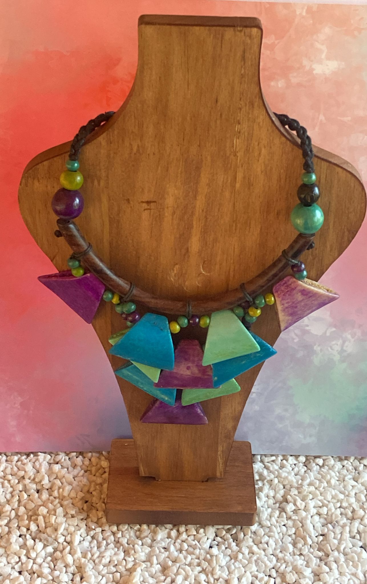 Couleurs : Violet profond, Bleu indigo, Turquoise, Teintes bois naturel et perles assorties