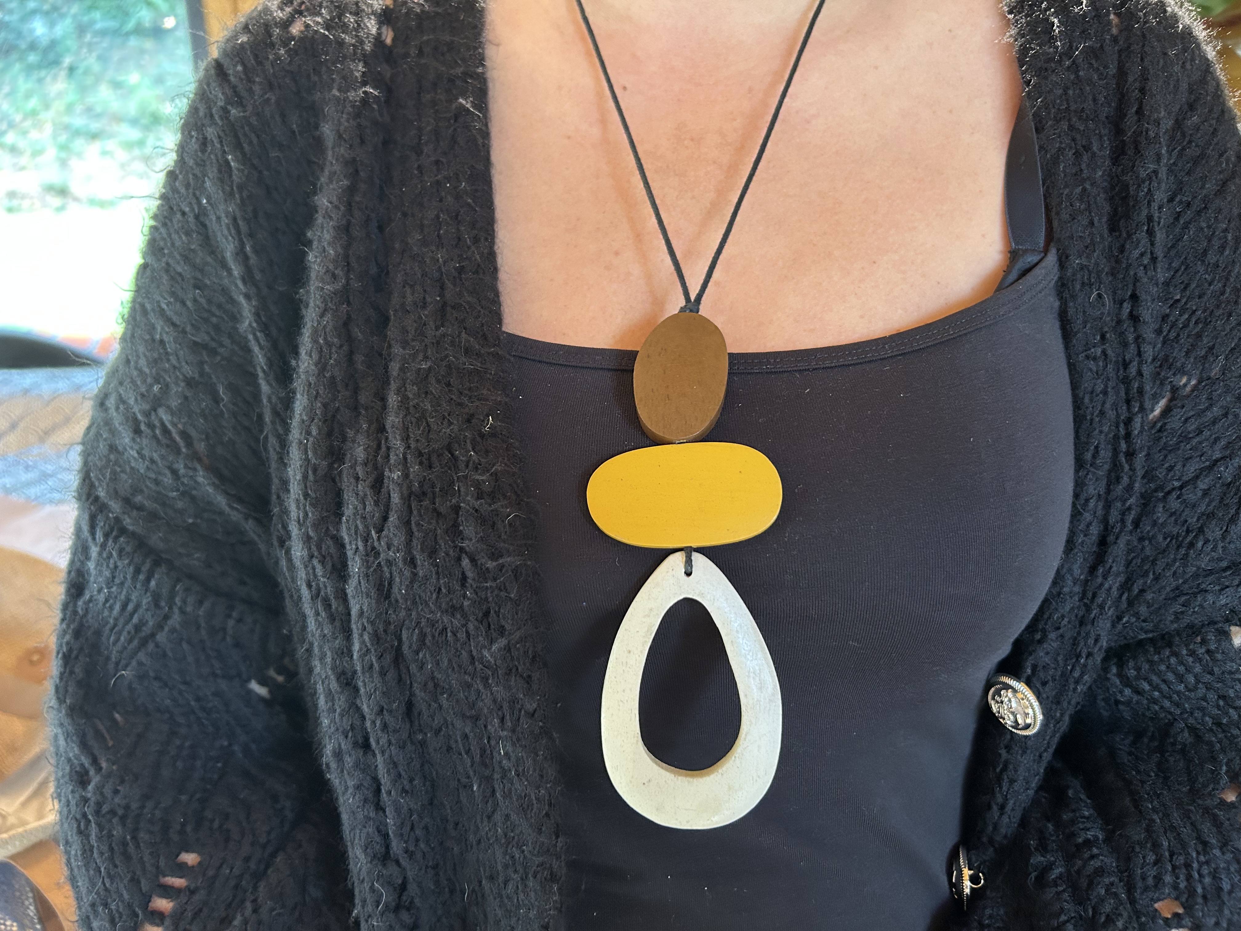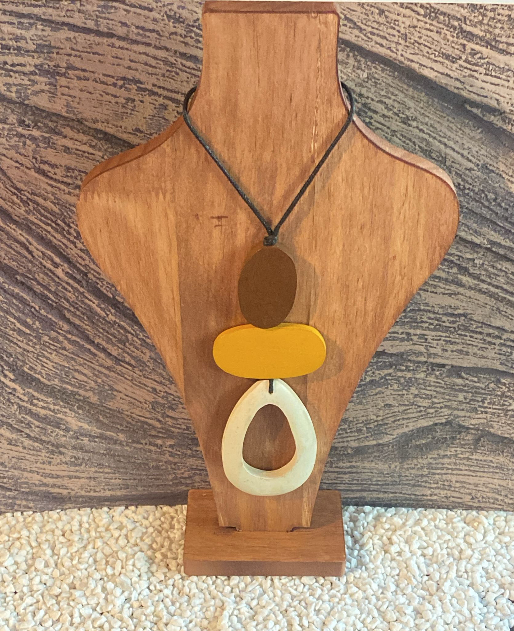 Ce collier met en scène une composition unique de trois pièces en bois naturel teinté, toutes façonnées et polies à la main :