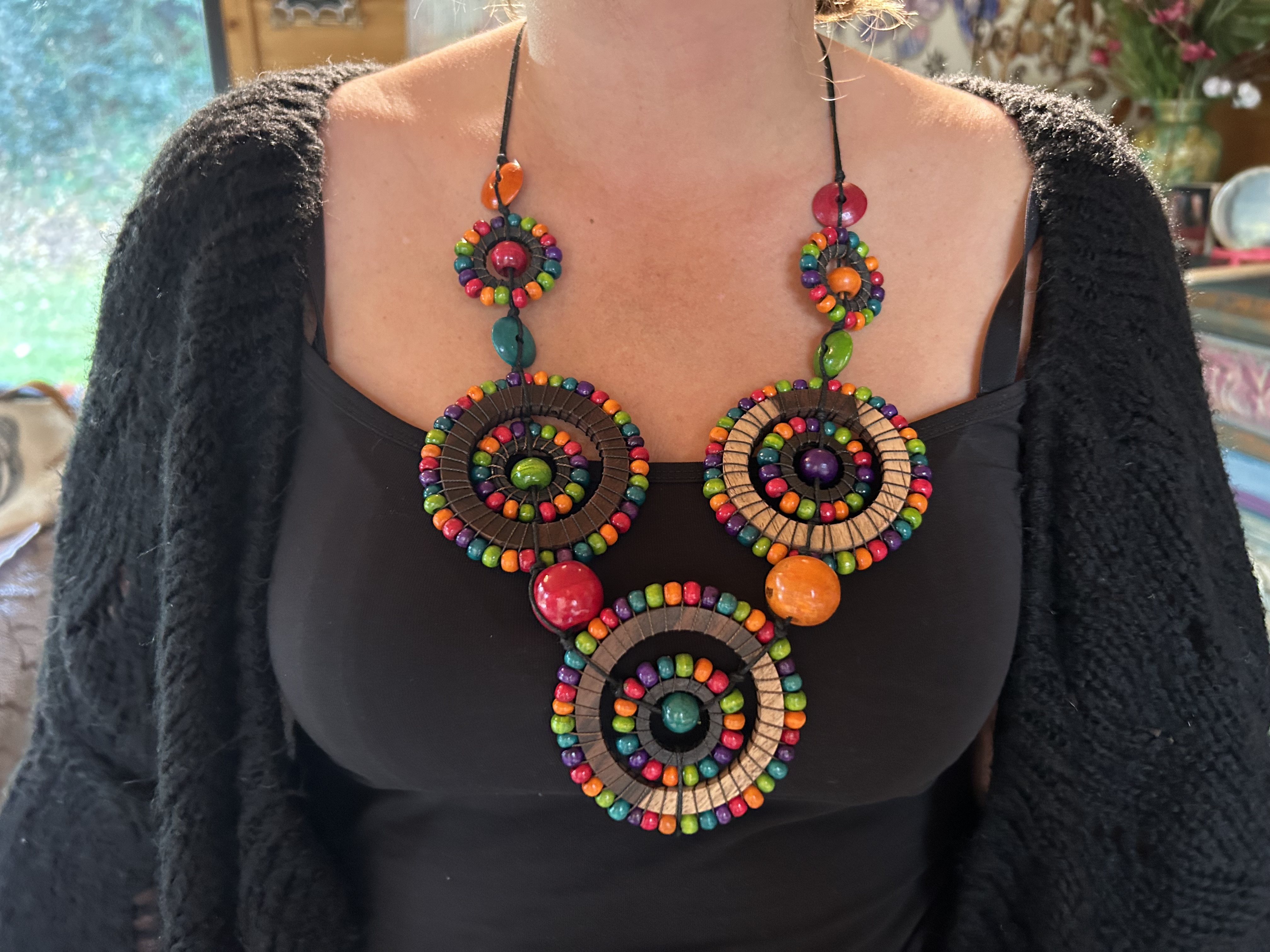 Découvrez un collier spectaculaire et unique, qui célèbre la joie et le savoir-faire ancestral. Le modèle Éventail de Spirales Multicolores est un bijou 100 % artisanal, entièrement réalisé en bois naturel et teinté à la main par des artisans indonésiens.