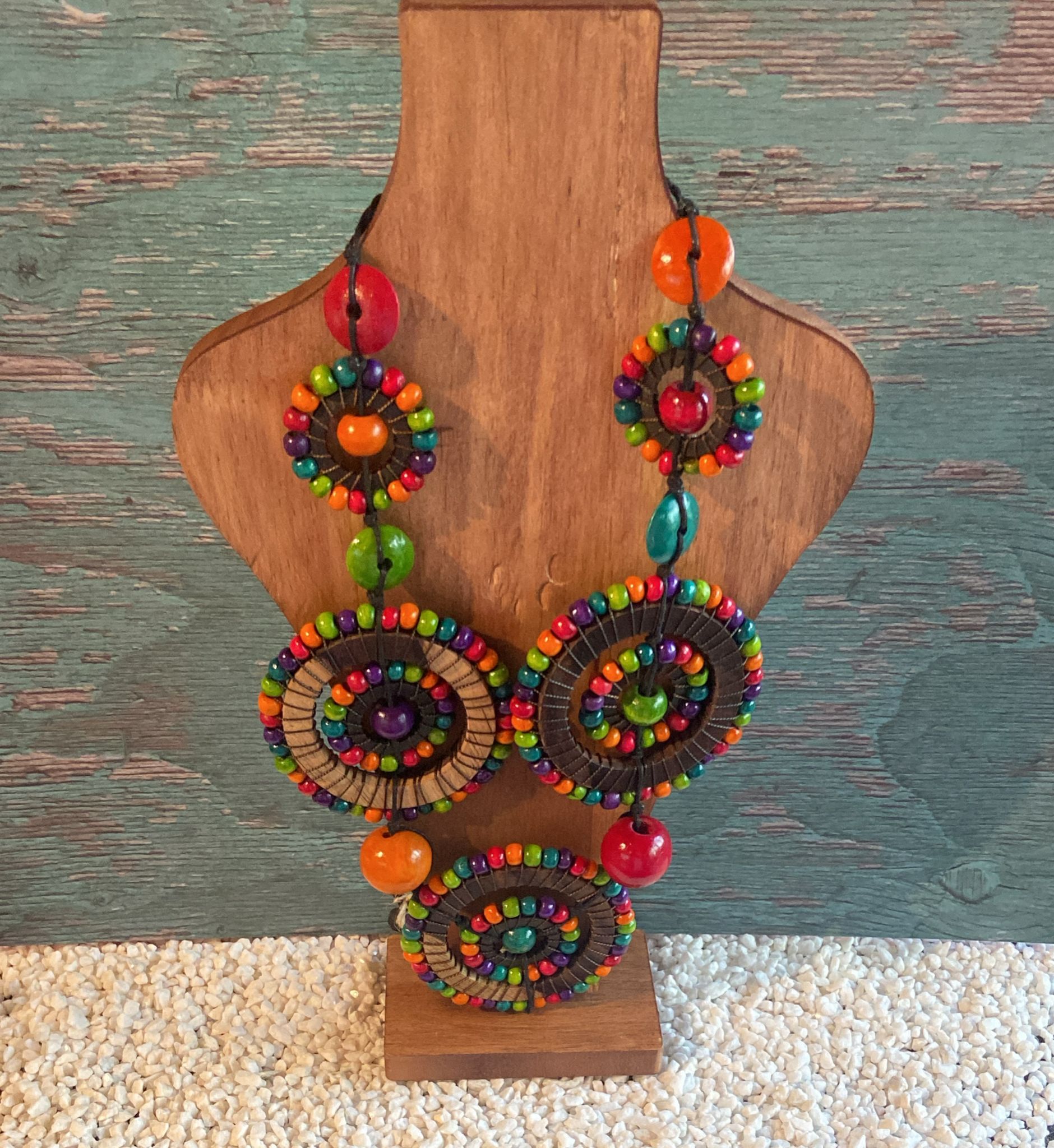 Ce collier se distingue par son motif central puissant : quatre grandes spirales centrales, magnifiquement ornées de perles colorées vives et lumineuses. Ces spirales sont associées à de petites spirales et à des perles rondes décoratives intercalées qui dynamisent l’ensemble, créant un éventail de couleurs et de formes qui captive le regard.