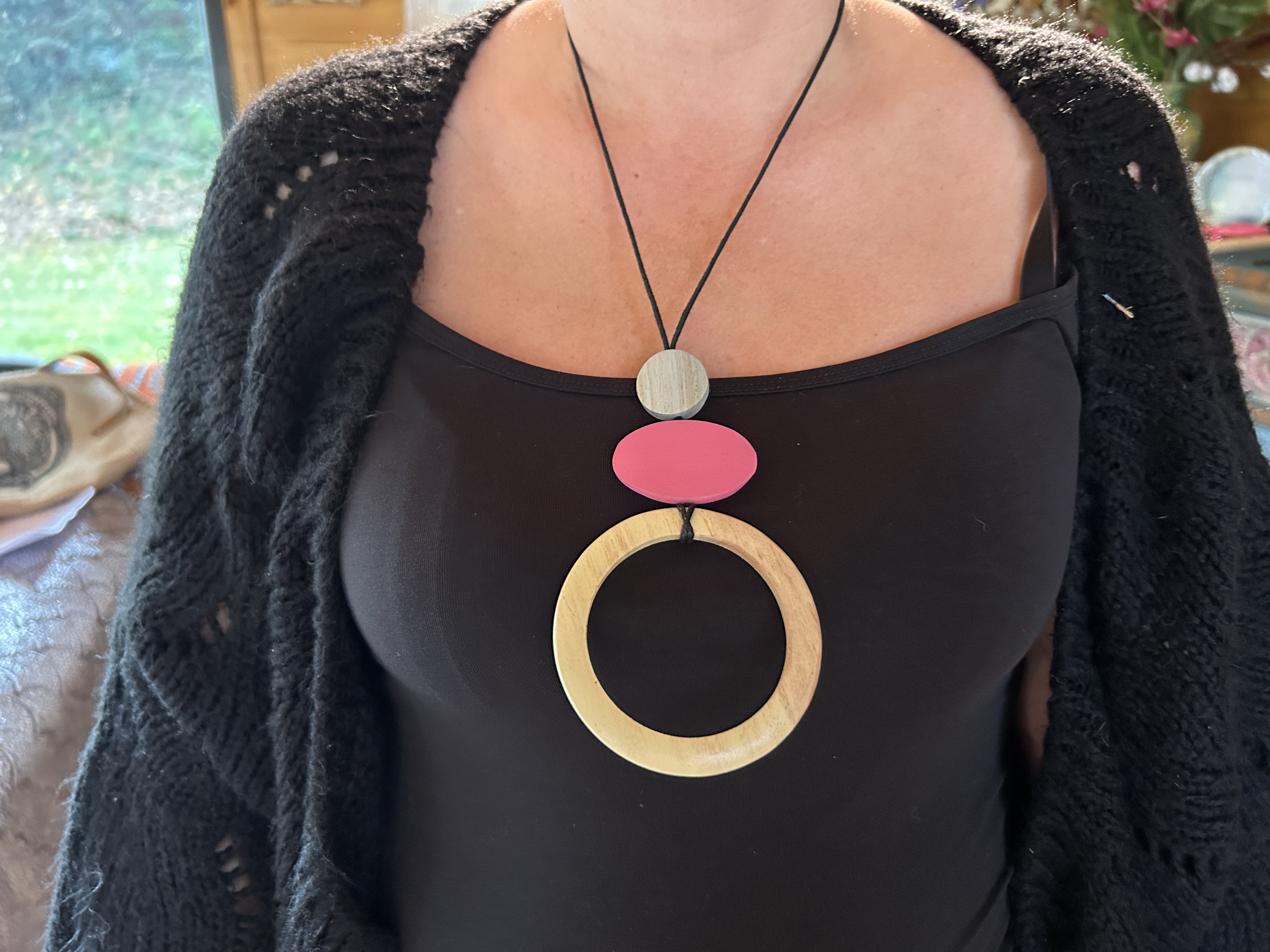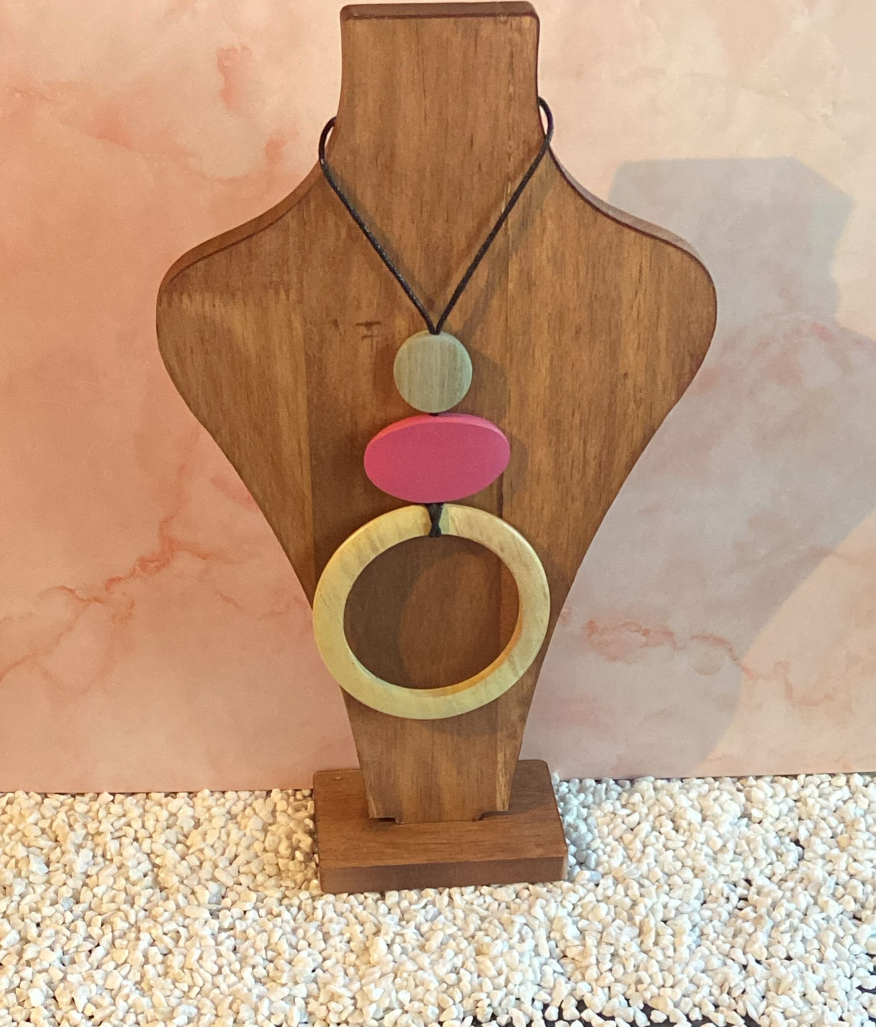Le collier est construit autour d'un grand anneau translucide couleur miel, qui apporte un éclat "cristal" à l'ensemble. Il est sublimé par deux éléments en bois sculpté et peint à la main :