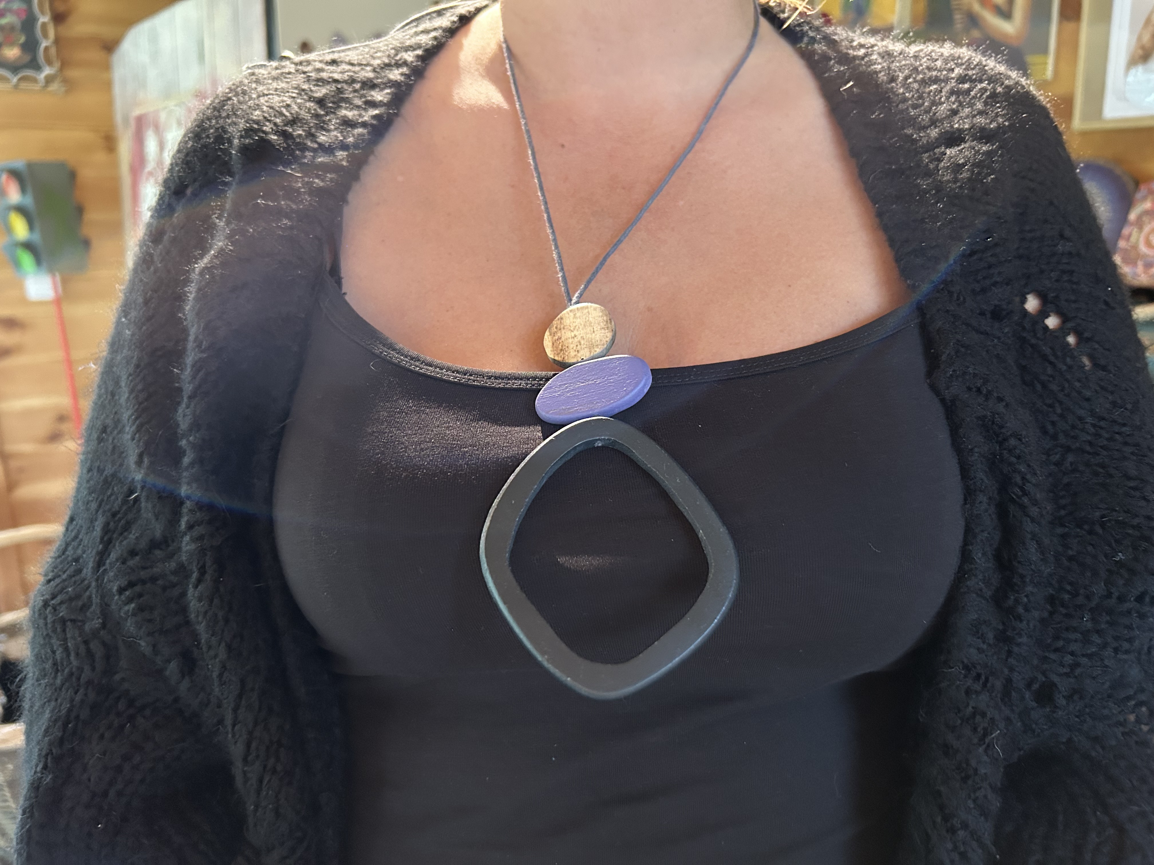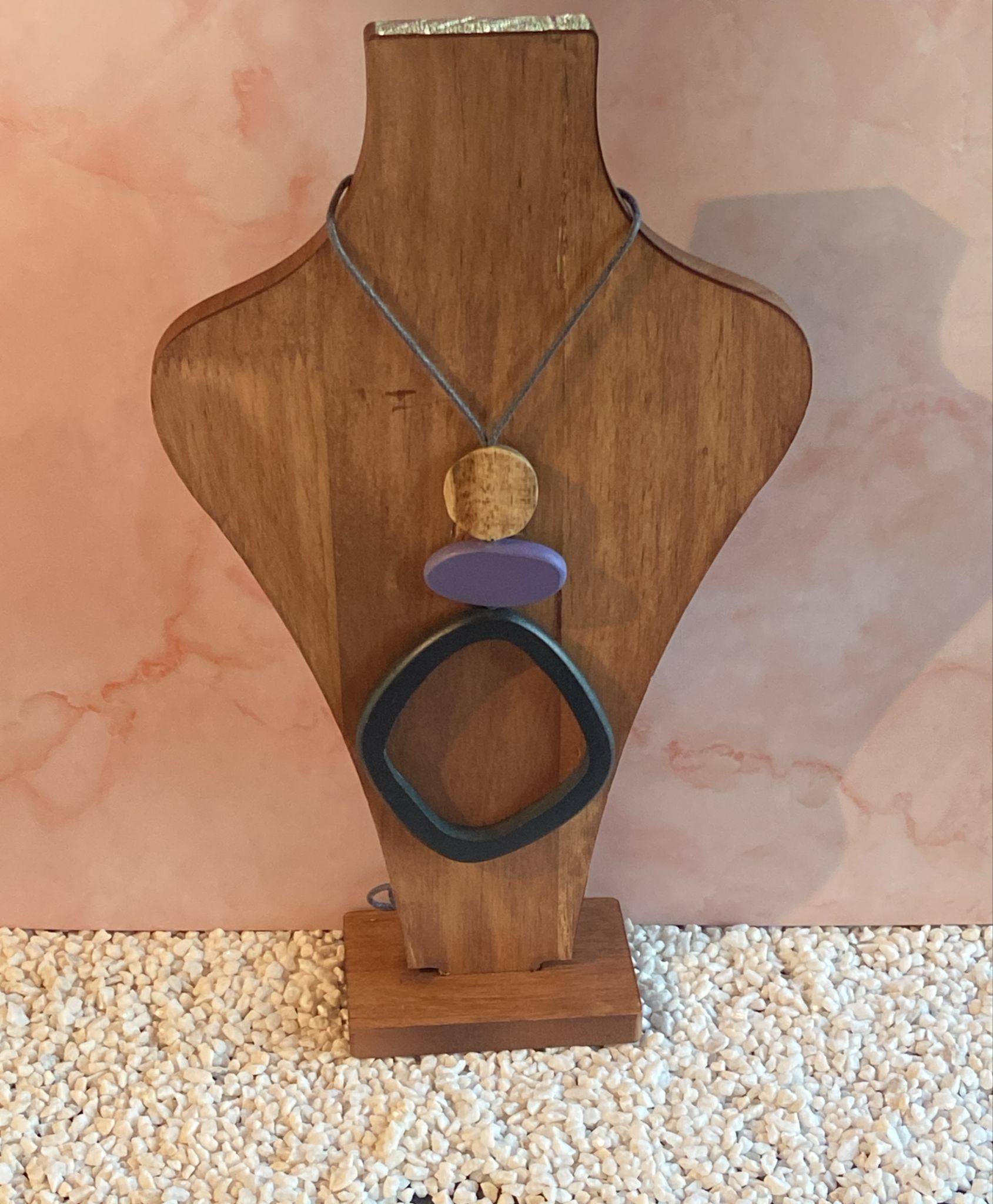 Le collier est composé d'un grand anneau noir profond à la forme organique, qui apporte une sophistication moderne. Il est associé à deux éléments, tous sculptés, poncés et peints à la main dans du bois naturel :