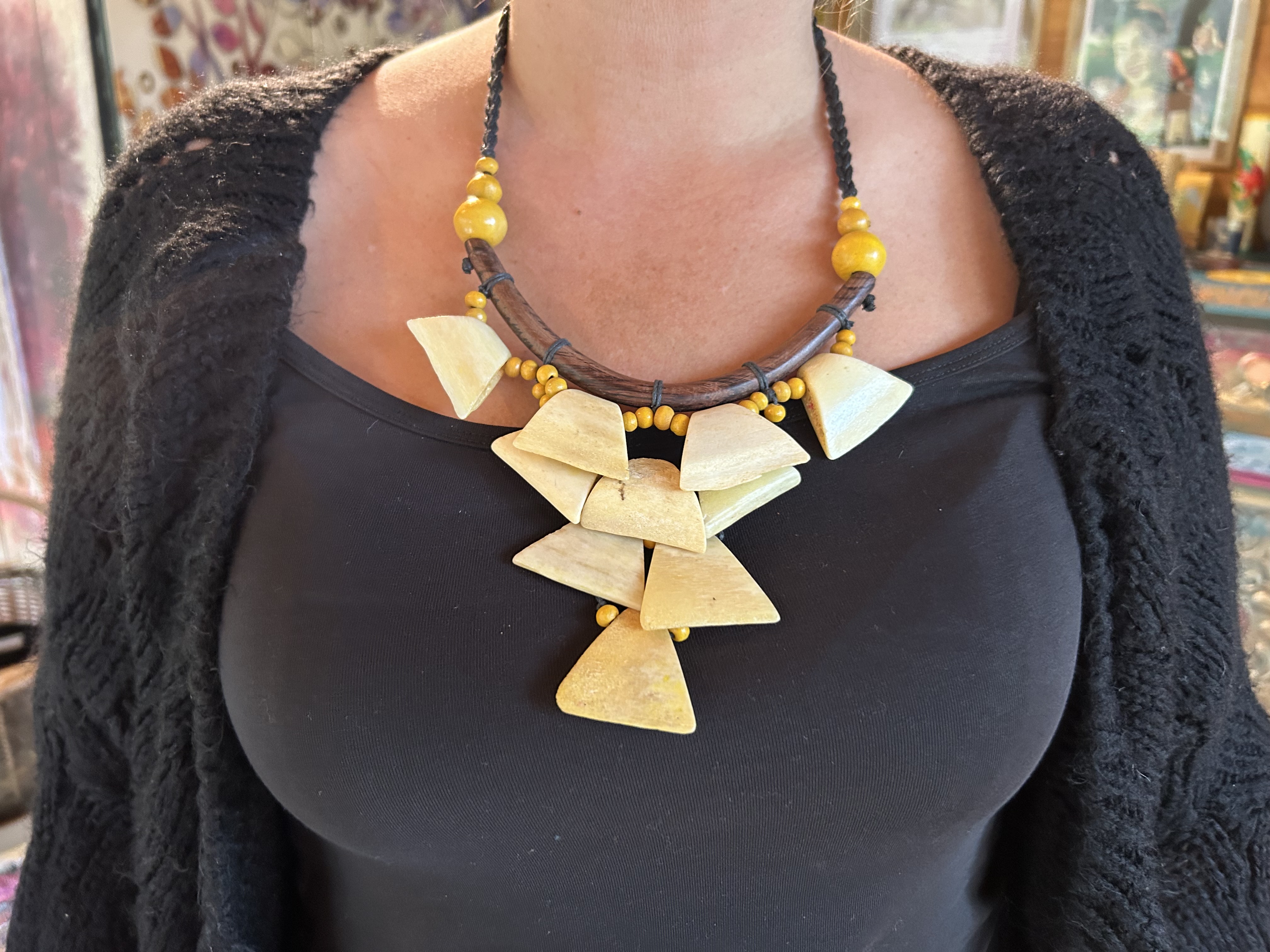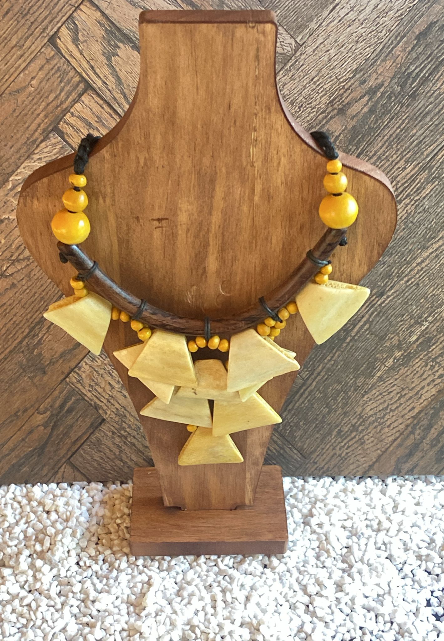 Le contraste entre les teintes naturelles du beige/ambre et le marron foncé du bois confère au bijou un caractère audacieux.
