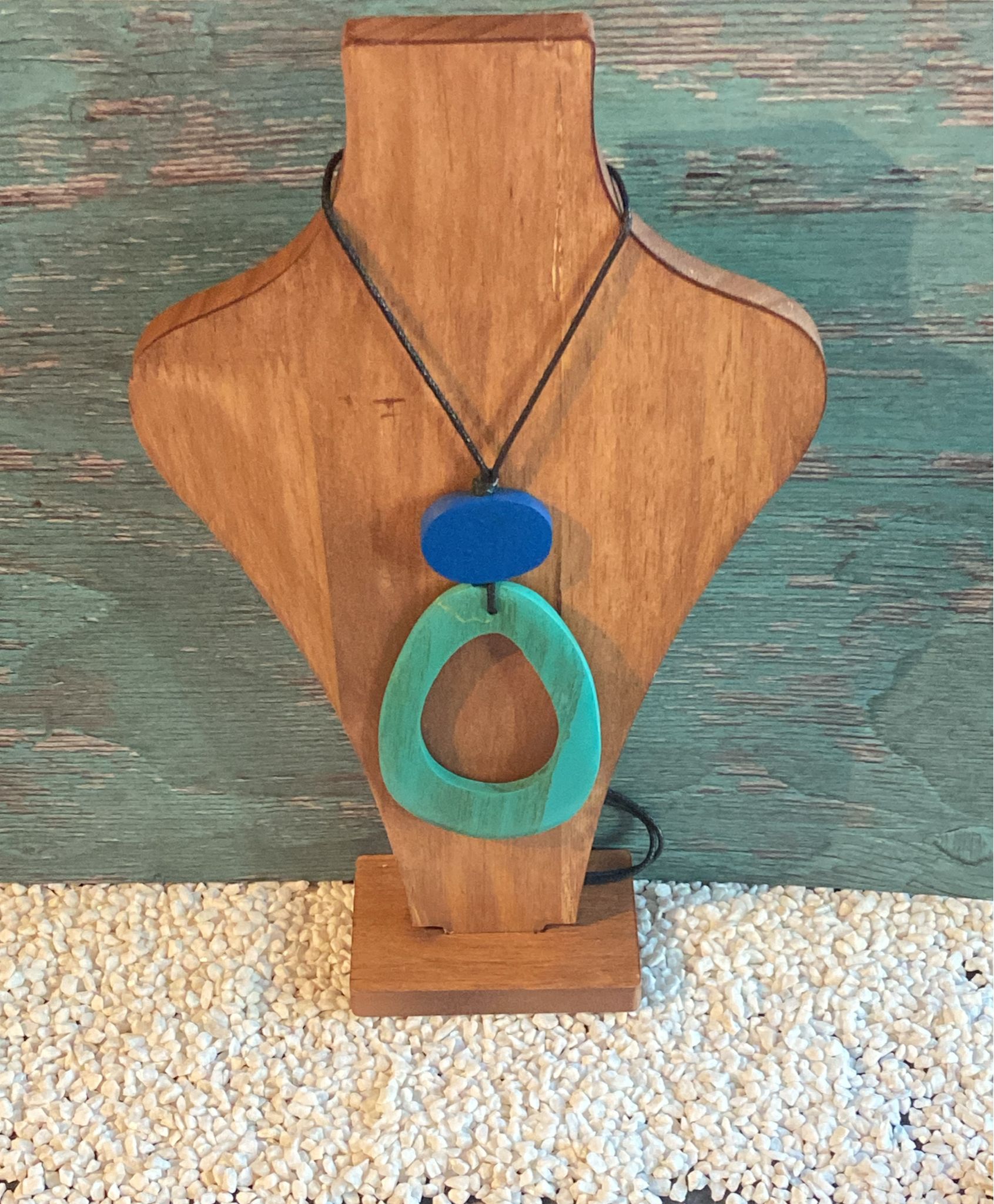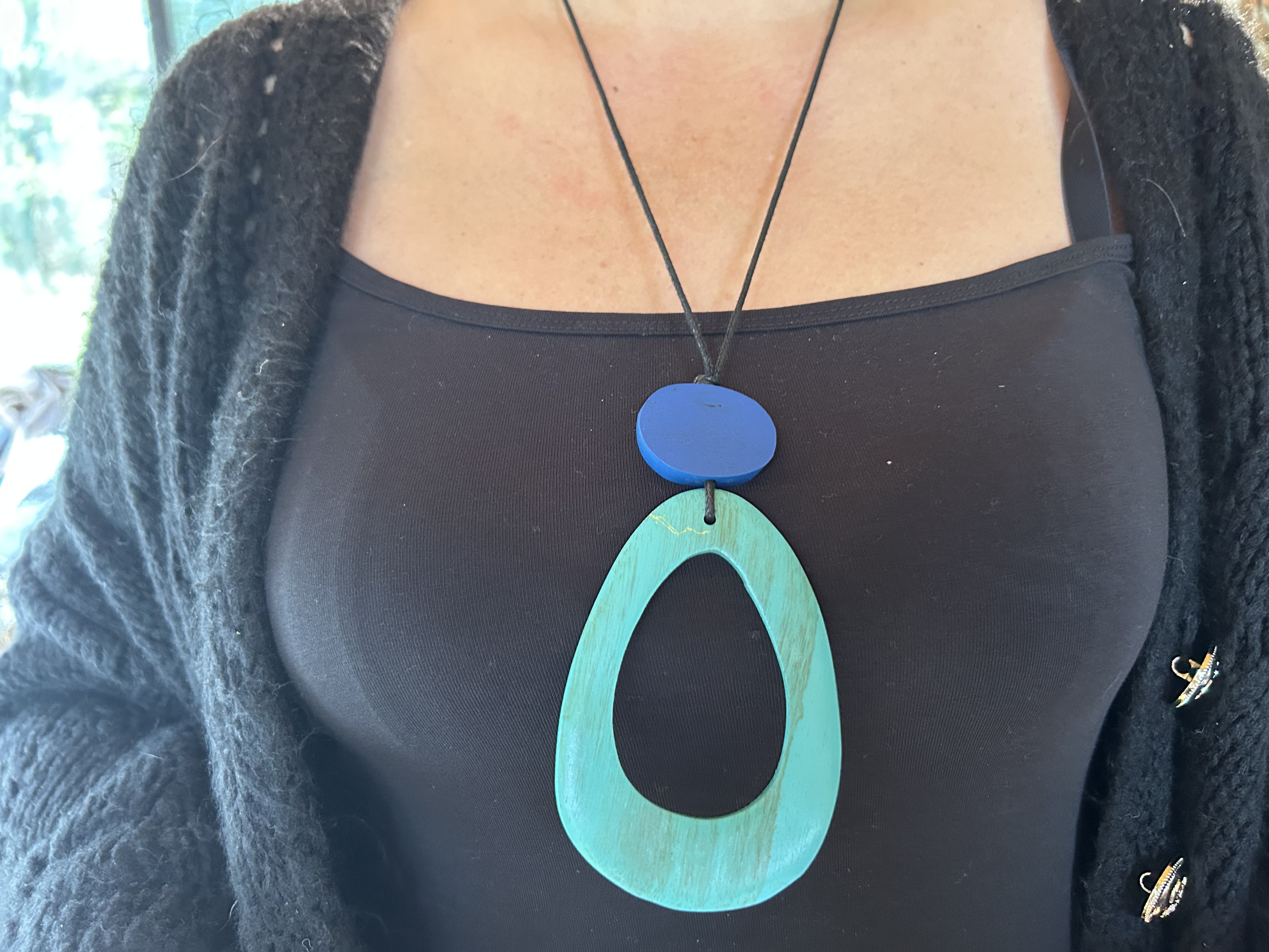 Ce collier est composé de deux éléments en bois naturel indonésien, taillés à la main :