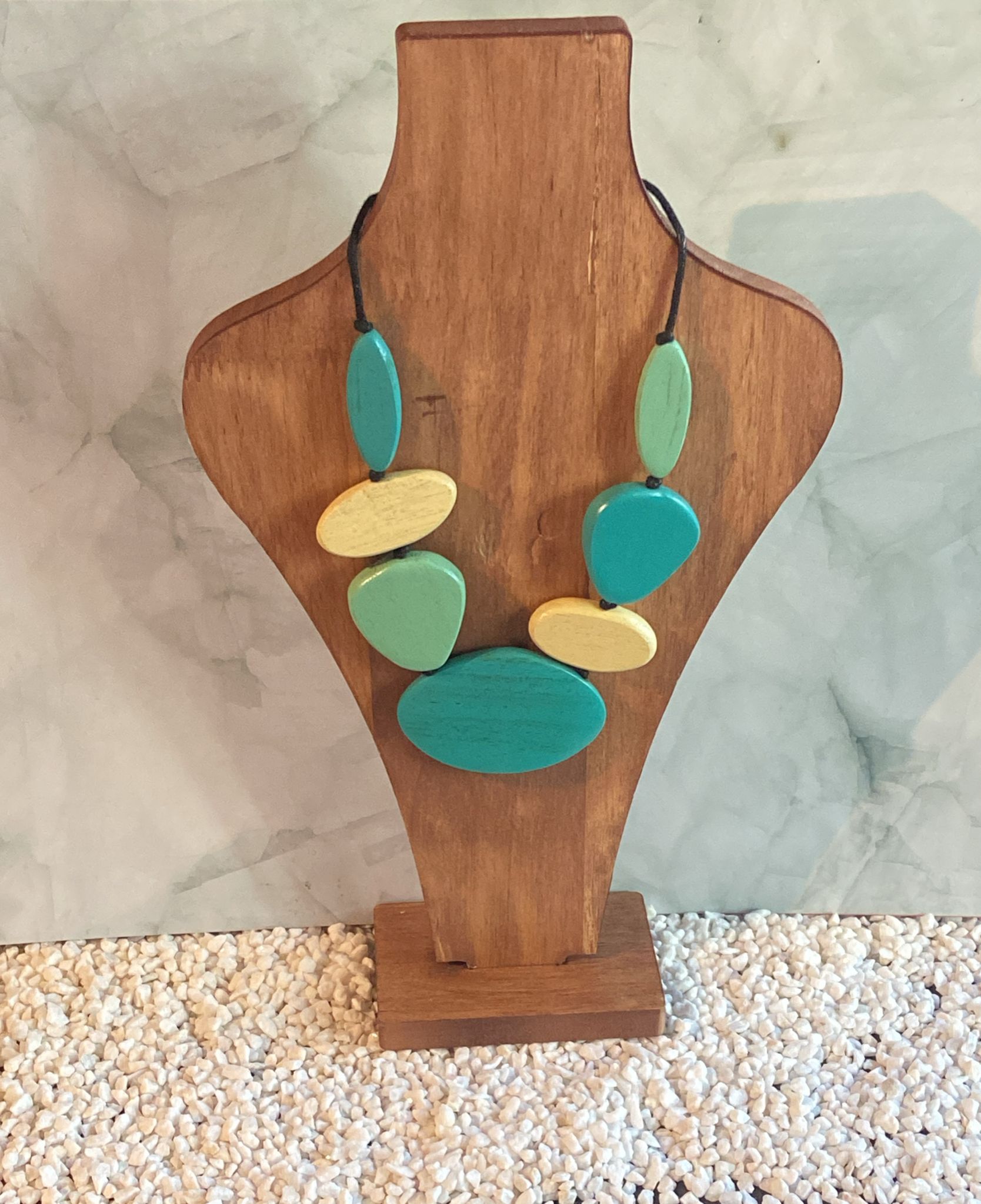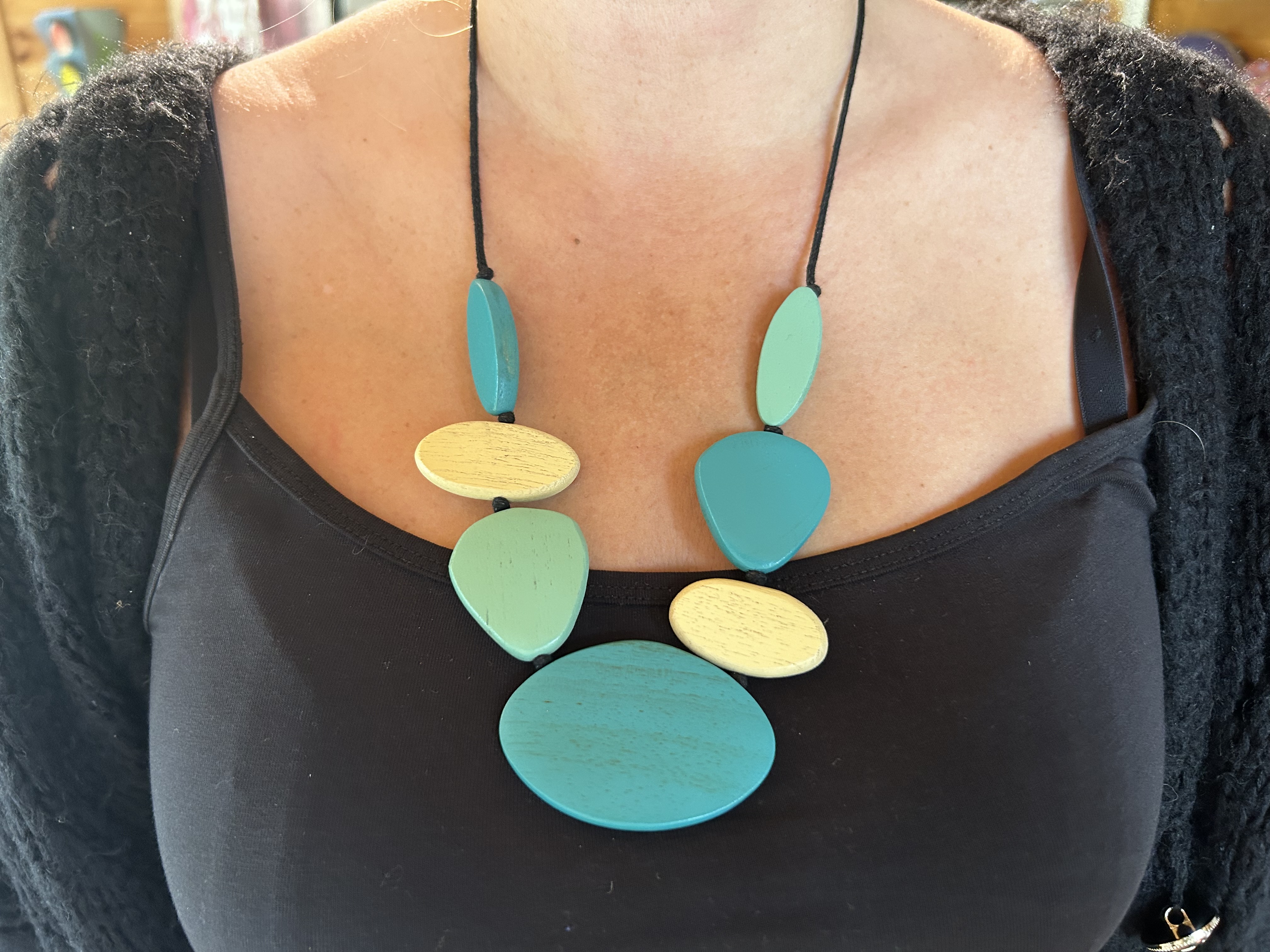 Ce magnifique collier met en valeur des formes de galets en bois naturel associés dans une composition harmonieuse. Chaque galet est façonné, poncé puis teinté à la main par des artisans indonésiens, offrant un nuancier sophistiqué : bleu turquoise profond, vert eucalyptus et bois naturel beige. Cette fabrication entièrement artisanale confère à chaque pièce un caractère unique, chaleureux et authentique.