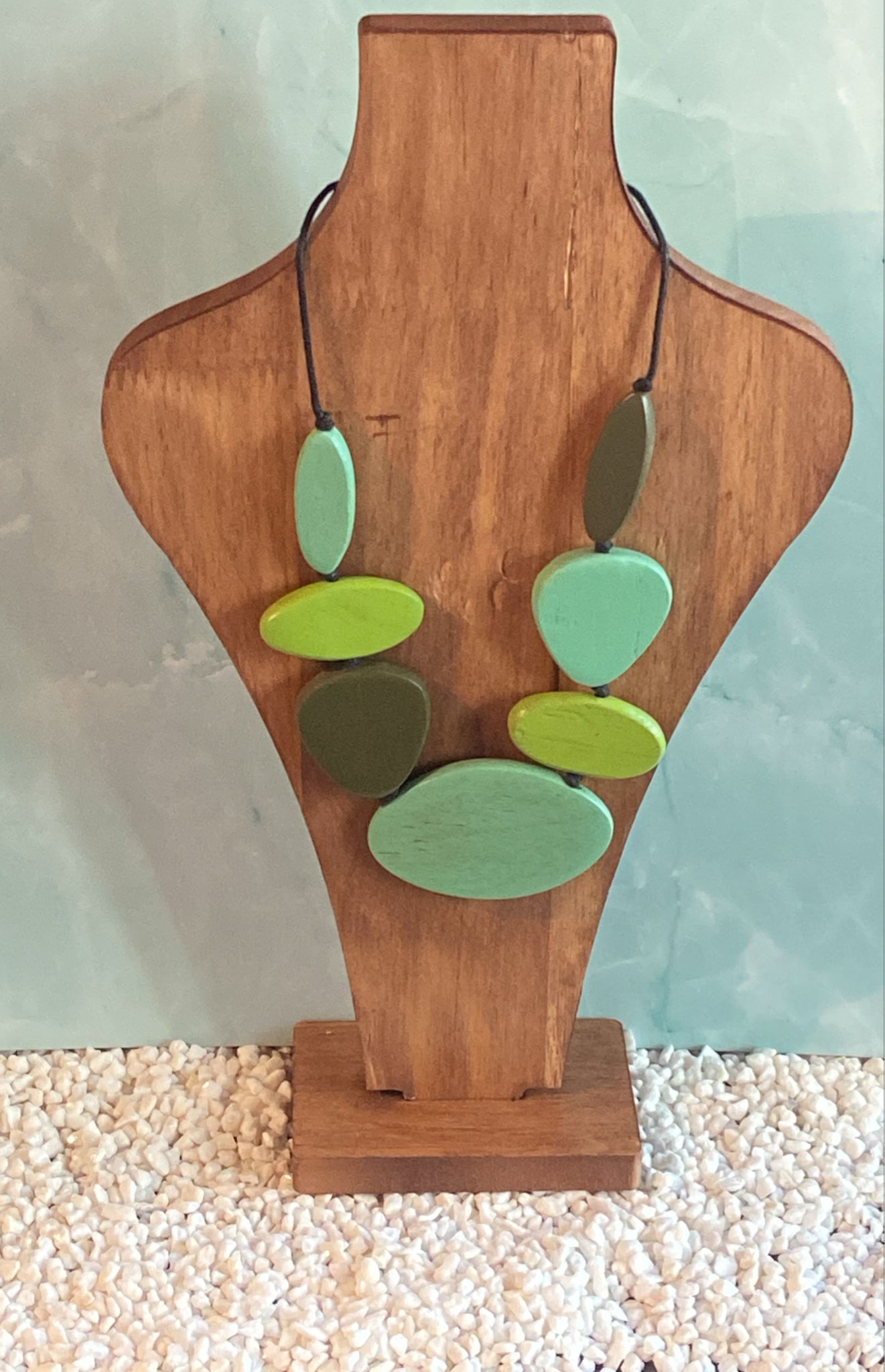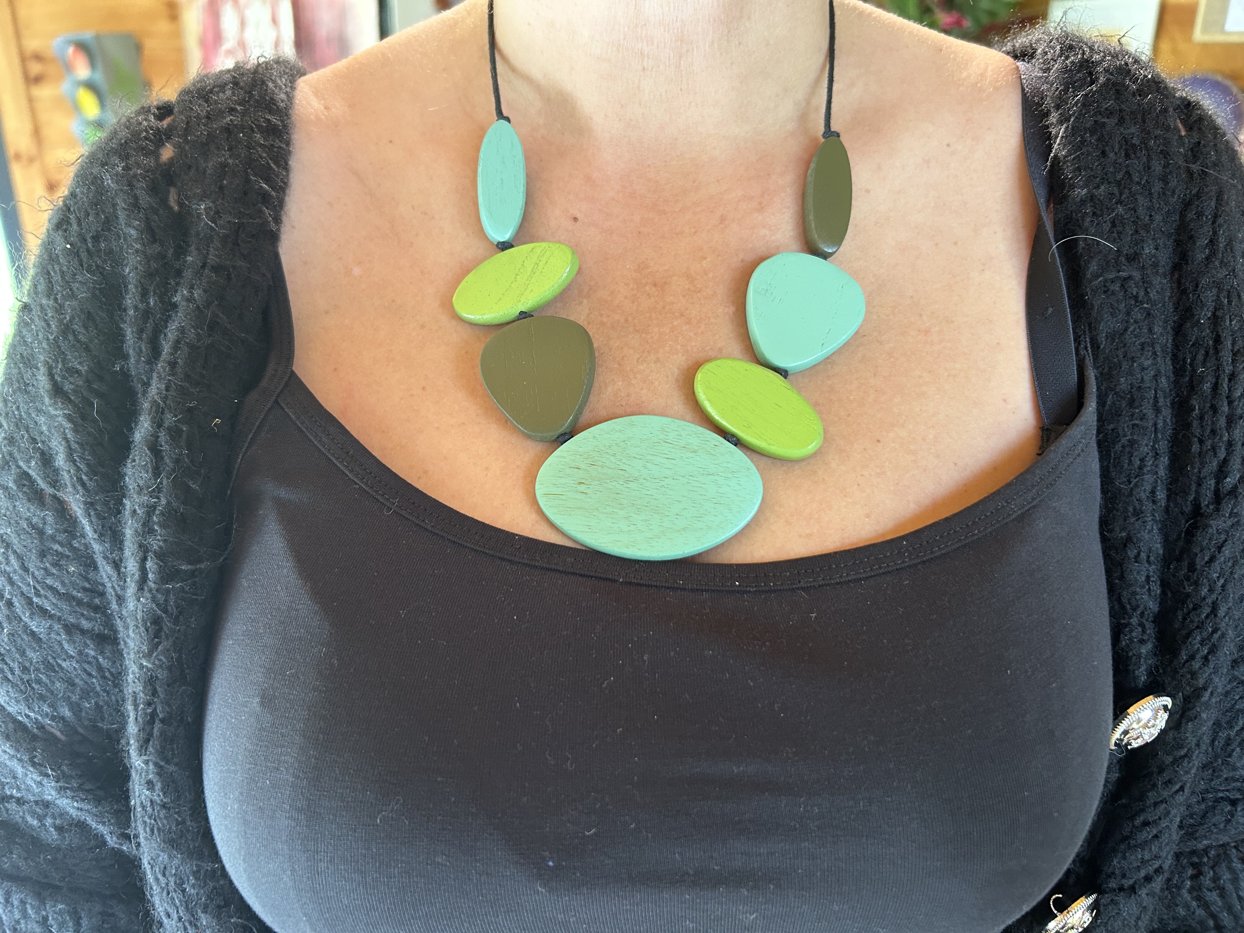 Ce collier met en valeur une composition harmonieuse de pièces en bois naturel d’Indonésie façonnées comme des galets. Chaque galet est taillé, poncé et teint à la main, offrant un superbe camaïeu de tons naturels et aquatiques : vert sauge, vert olive, bleu nuit et bleu lagon. Cette fabrication 100% artisanale garantit que chaque collier possède sa propre identité, le rendant unique, chaleureux et plein de caractère.