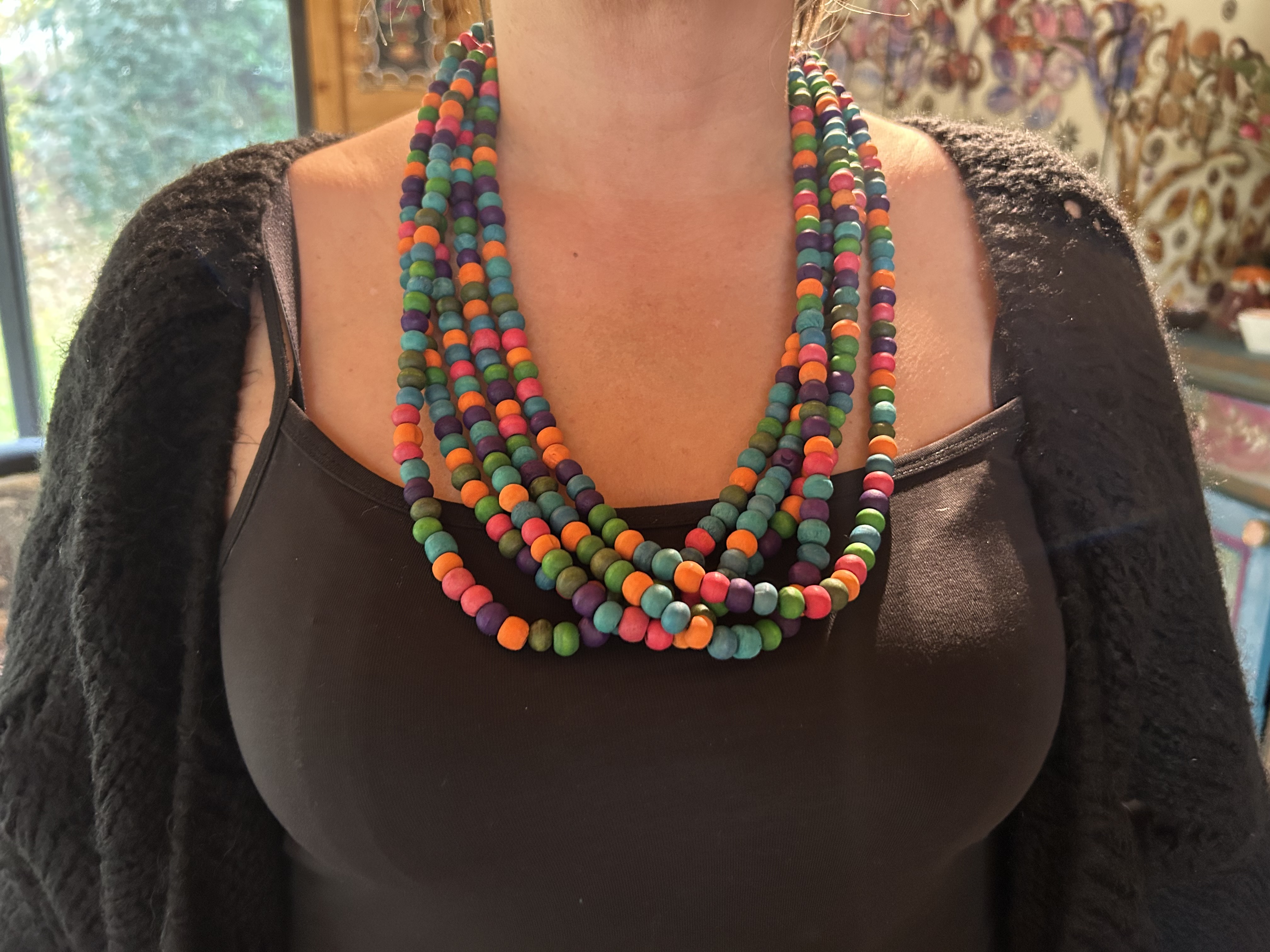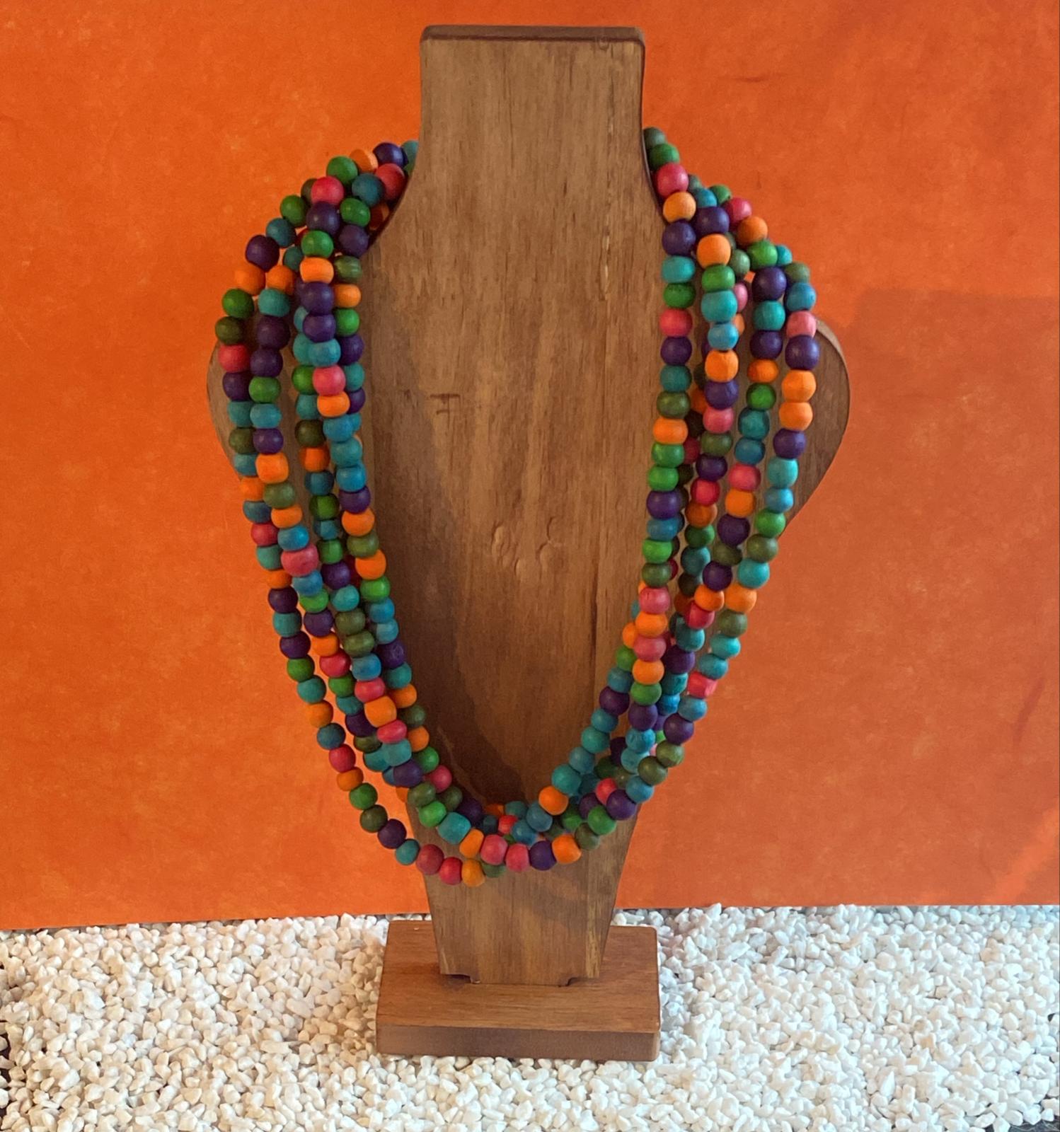 Découvrez le collier Multirangs Arc-en-Ciel, un bijou qui est une véritable explosion de couleurs et une promesse de joie. Ce collier multirangs apporte une luminosité inégalée grâce à ses 5 rangs de perles en bois minutieusement teintes à la main.