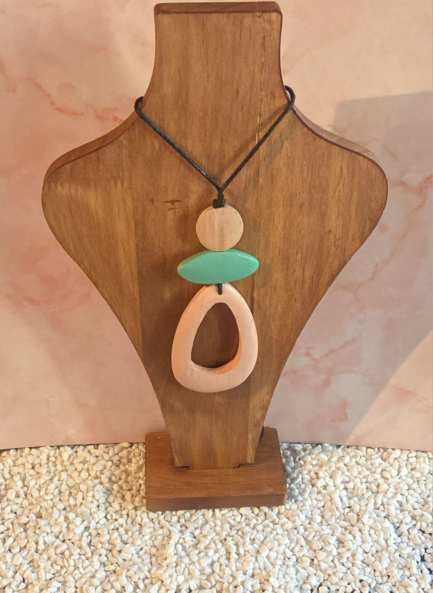 Le collier associe trois formes organiques sculptées dans du bois indonésien, travaillé artisanalement :