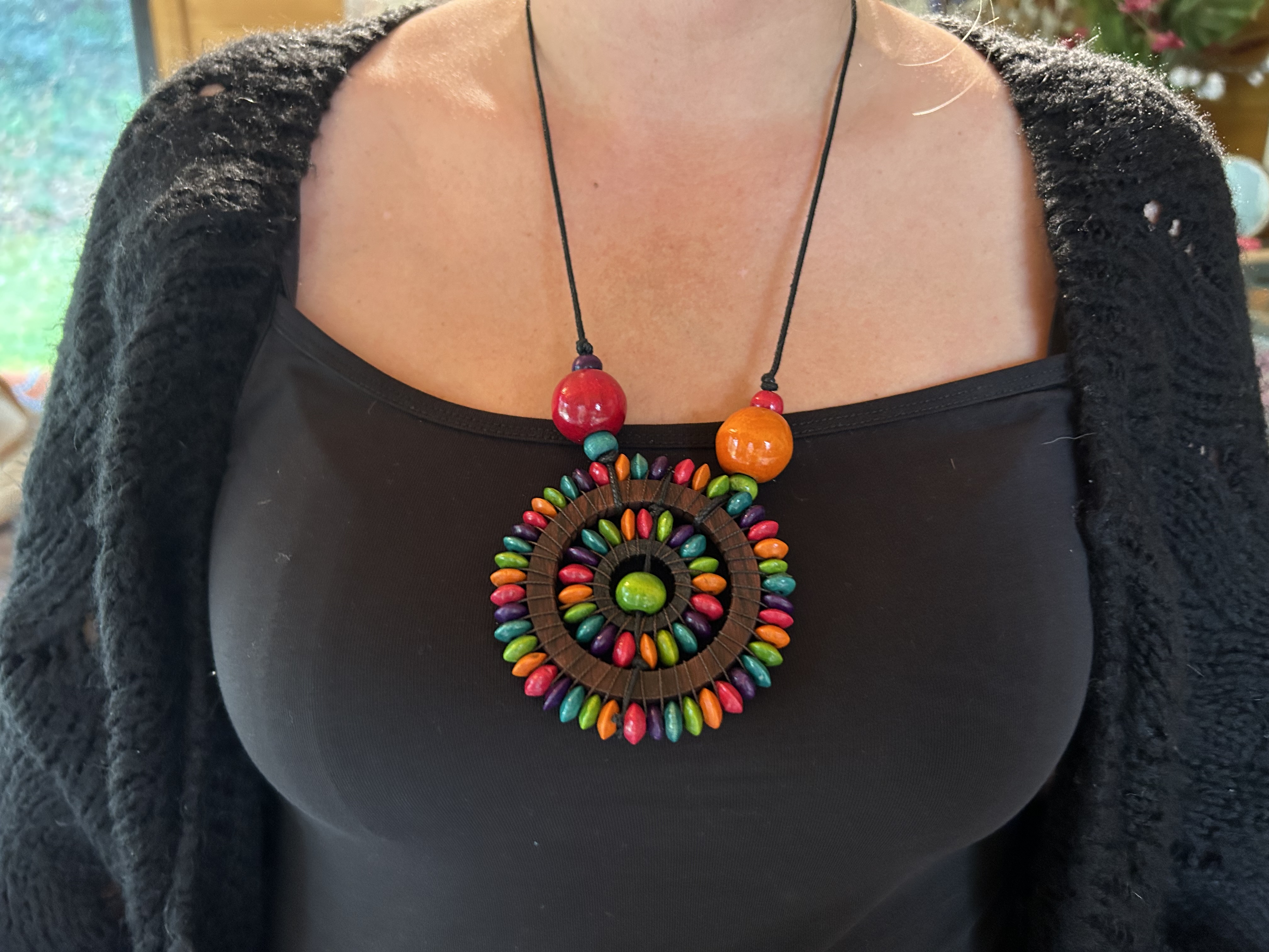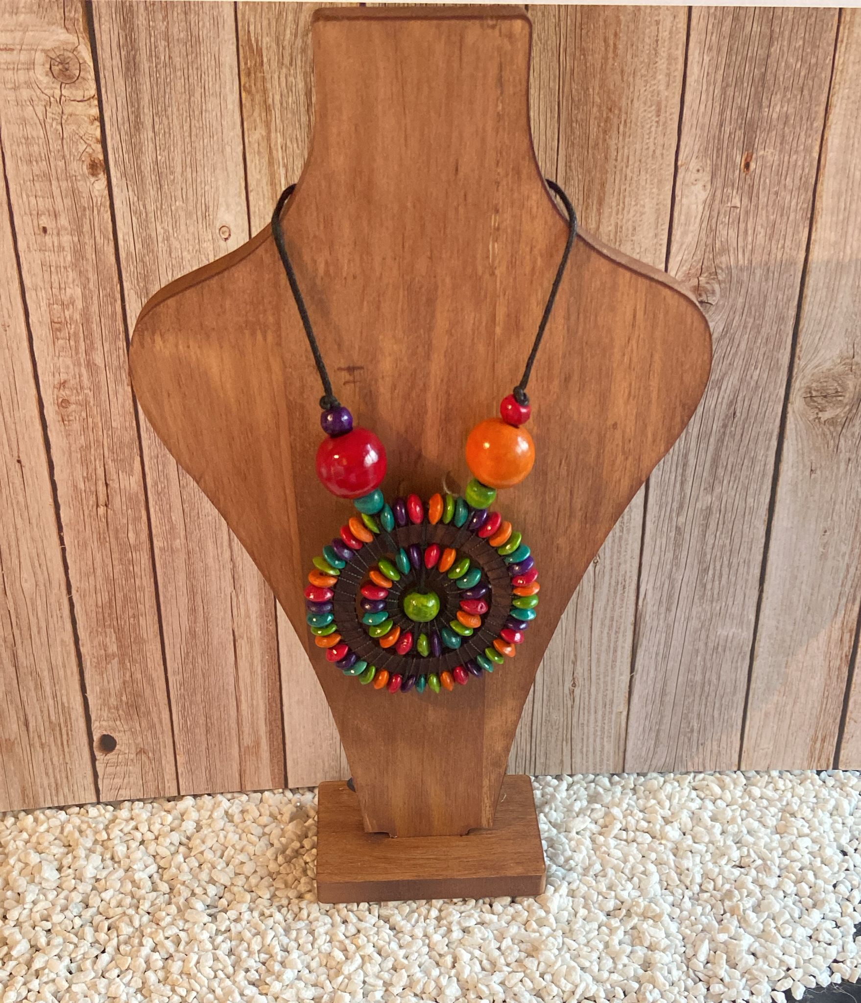 Découvrez le collier Spirale Bohème Multicolore, une pièce unique et audacieuse qui célèbre l'artisanat et la couleur. Ce modèle se distingue par son magnifique pendentif en spirale multicolore, composé de petites perles en bois teintes artisanalement.