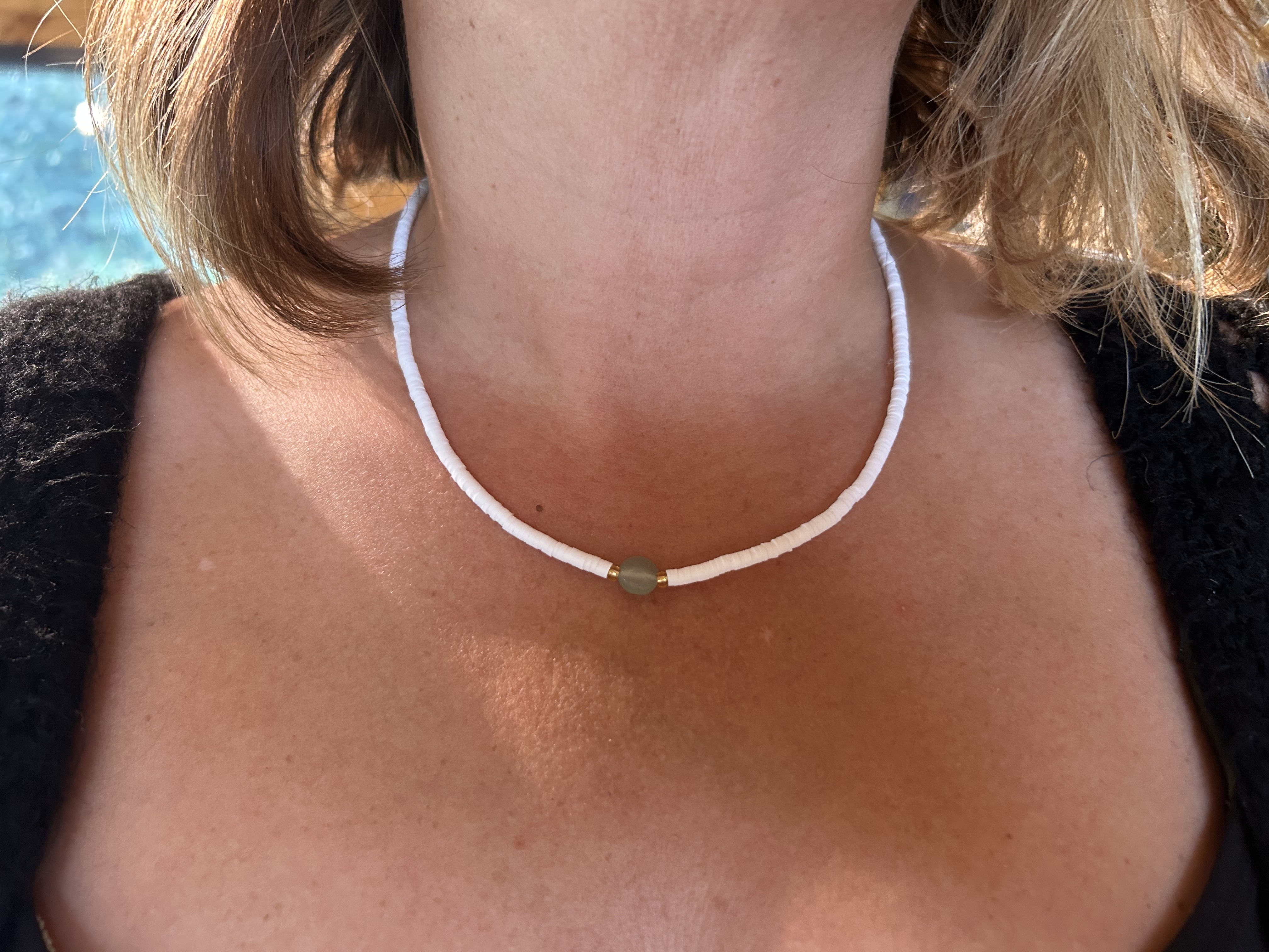 Le collier Douceur de Java est un bijou délicat et harmonieux qui unit la pureté du blanc à l’énergie apaisante de l’aventurine verte. Réalisé à la main par des artisans indonésiens, chaque pièce est une invitation à l’équilibre du cœur et à la confiance en la vie.