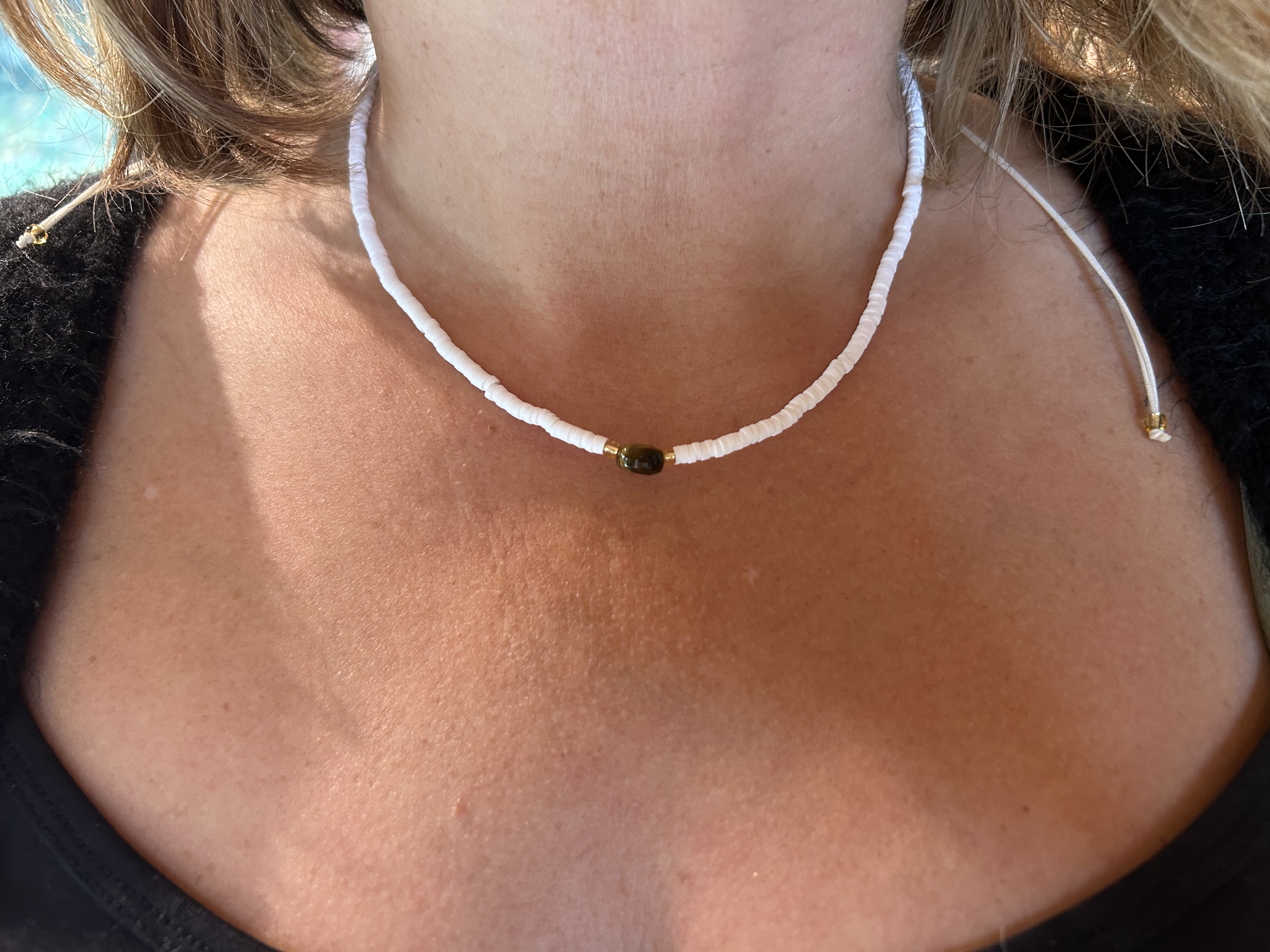 Le collier Force de Java est un bijou qui marie la pureté du blanc à la puissance de la pierre œil de tigre. Il est réalisé à la main par des artisans d’Indonésie et se distingue par son design minimaliste et son énergie équilibrante.