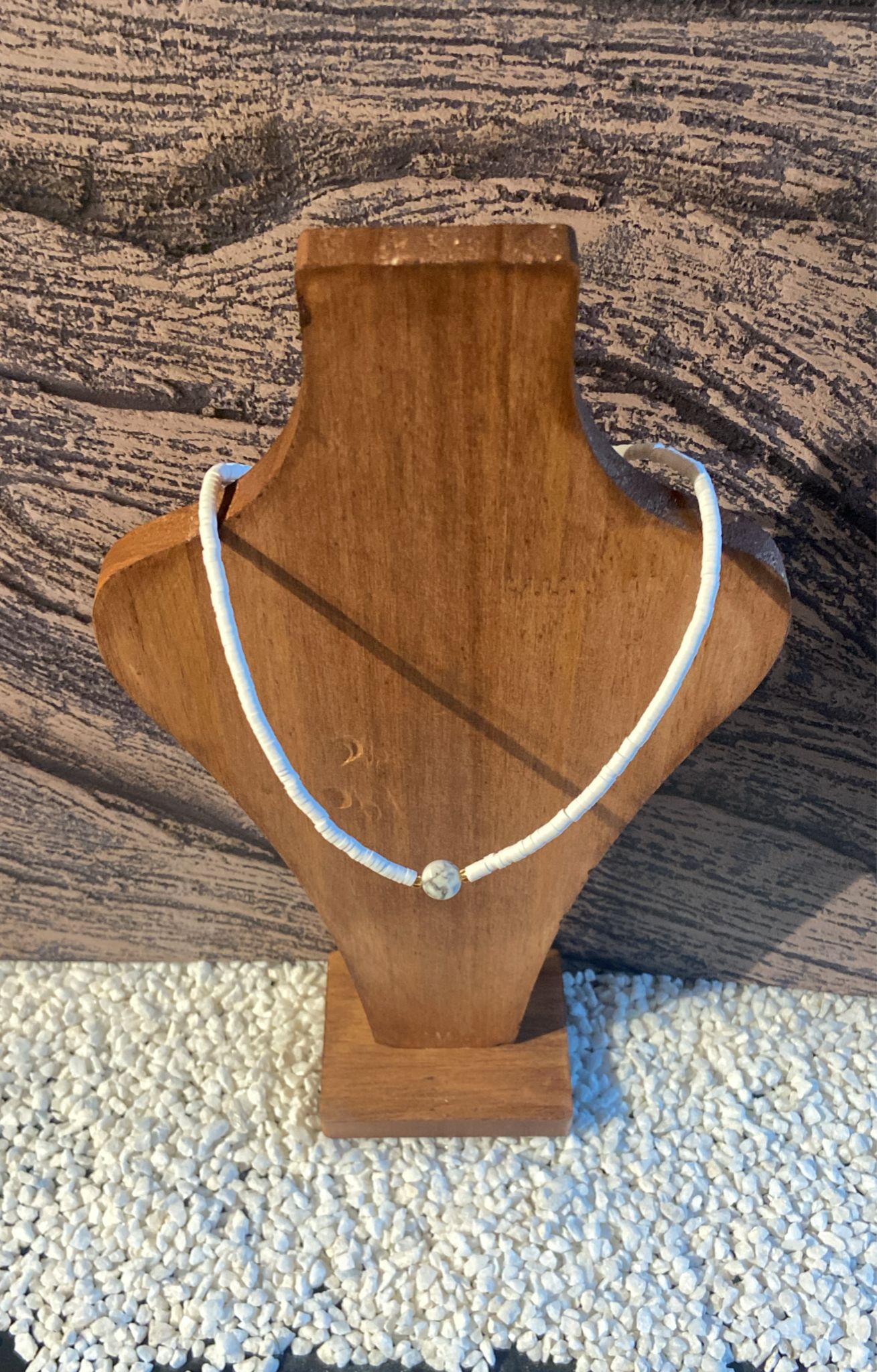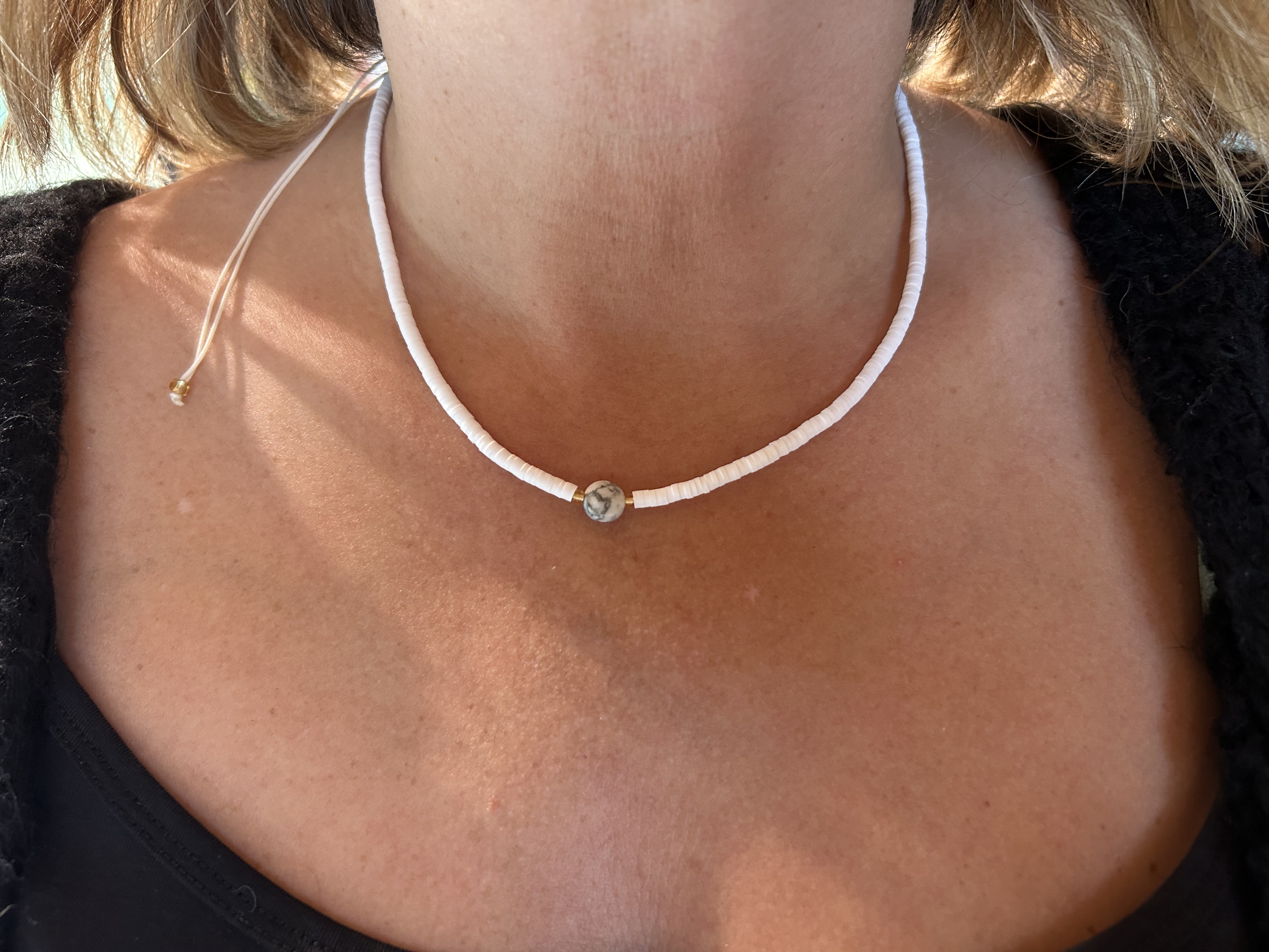 Ce ras du cou associe la légèreté des perles blanches plates à la noblesse d’une pierre naturelle d’howlite centrale.