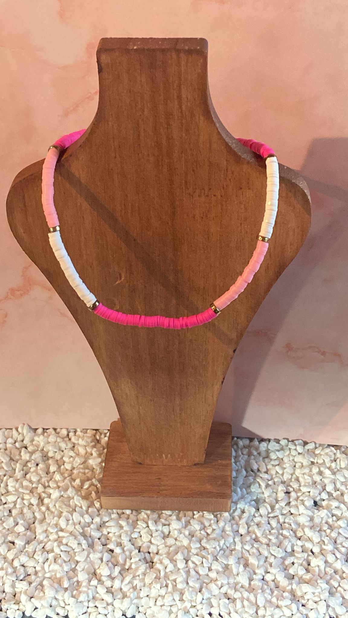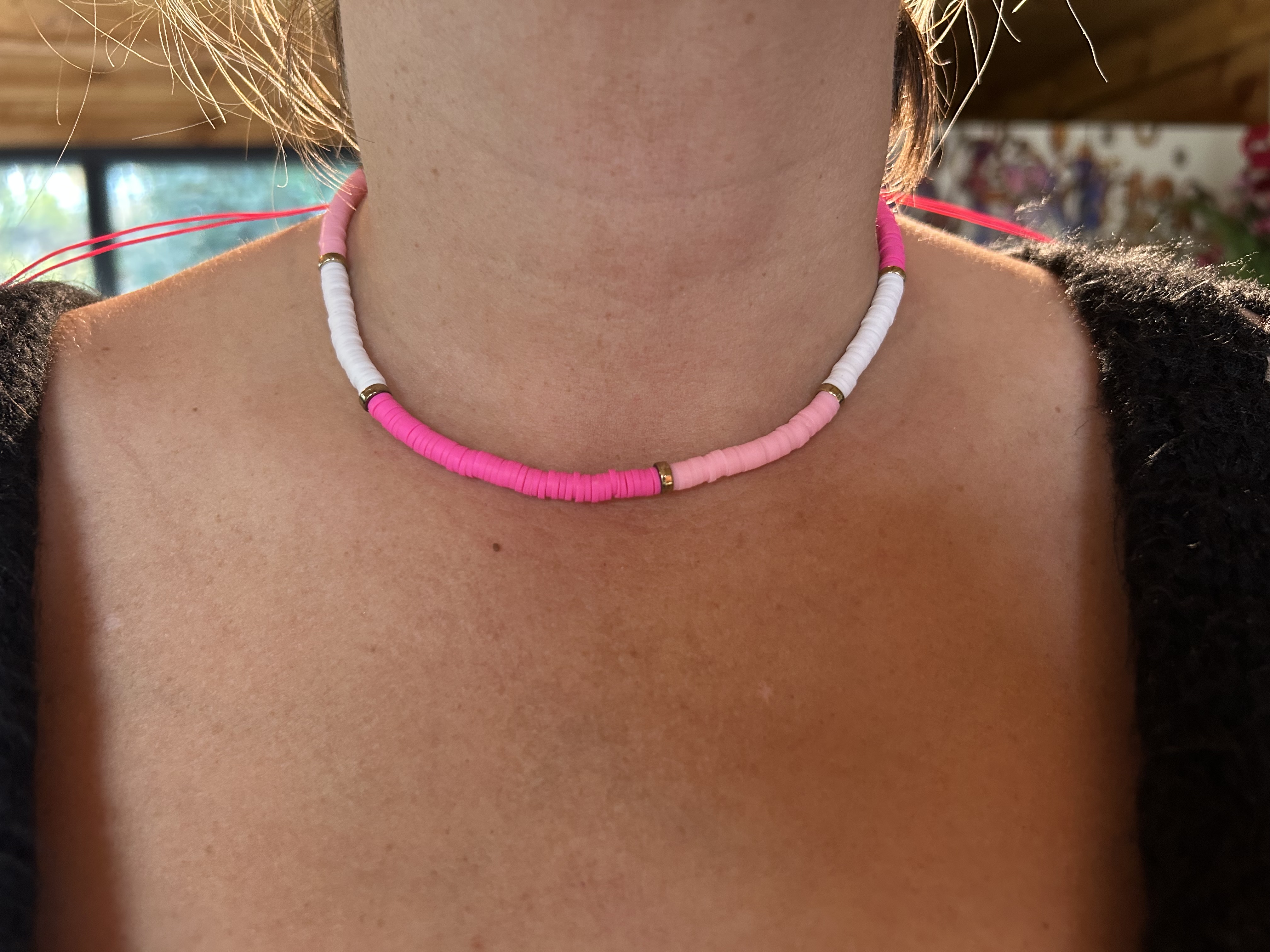 Nom : Collier Heishi “Pink Energy” – Fuchsia, Rose & Blanc