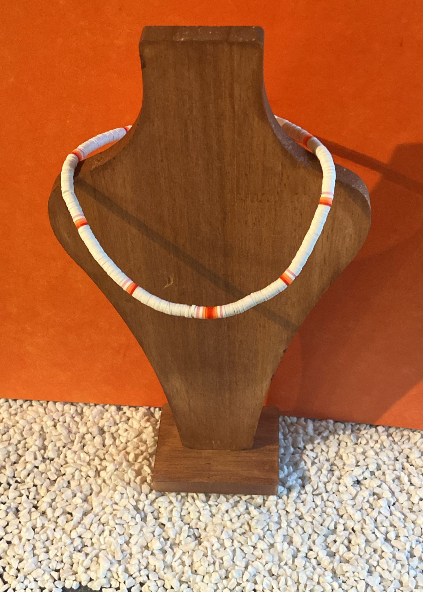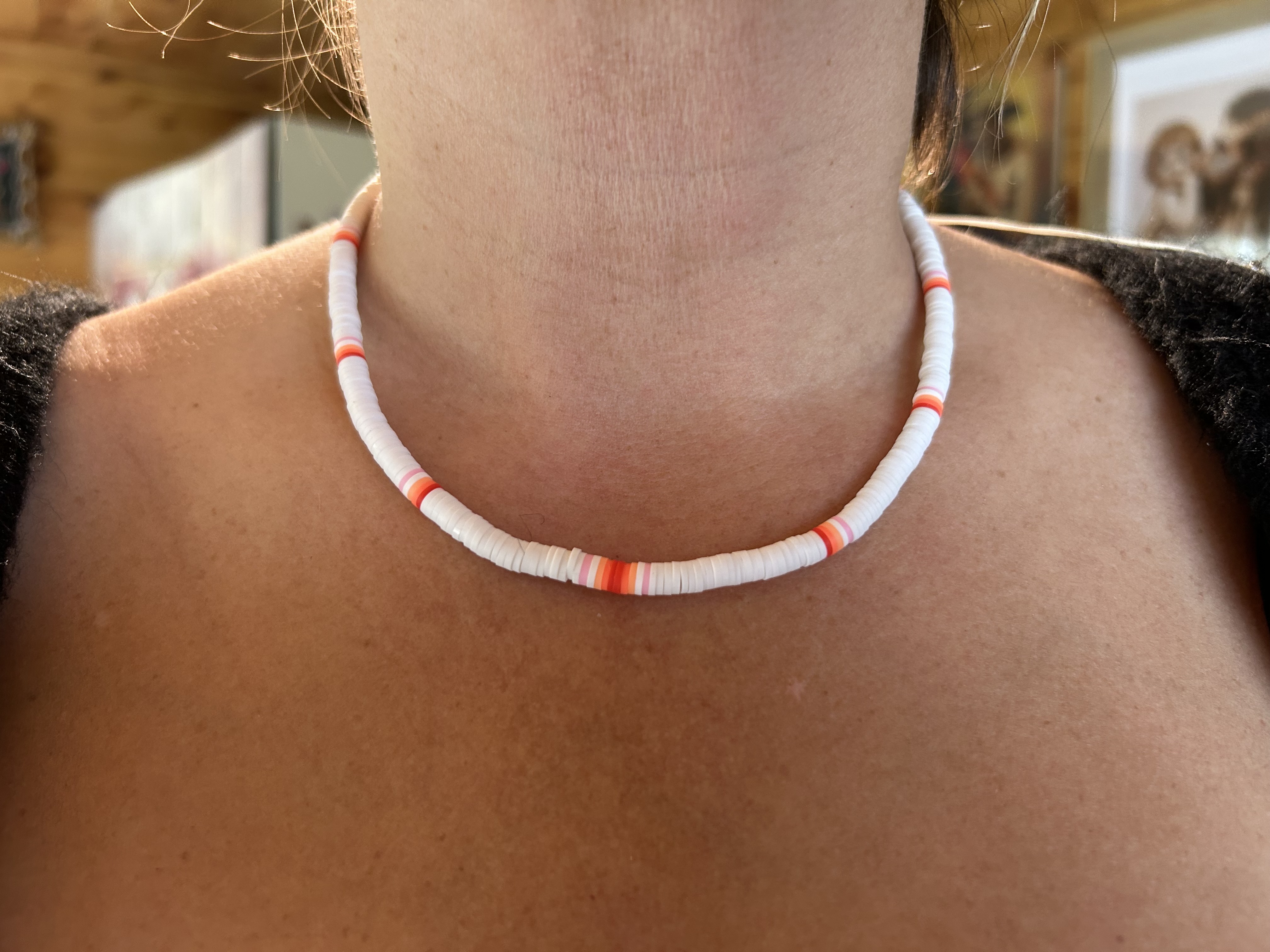 Nom : Collier Heishi “Pure Waves – White & Coral Lines”