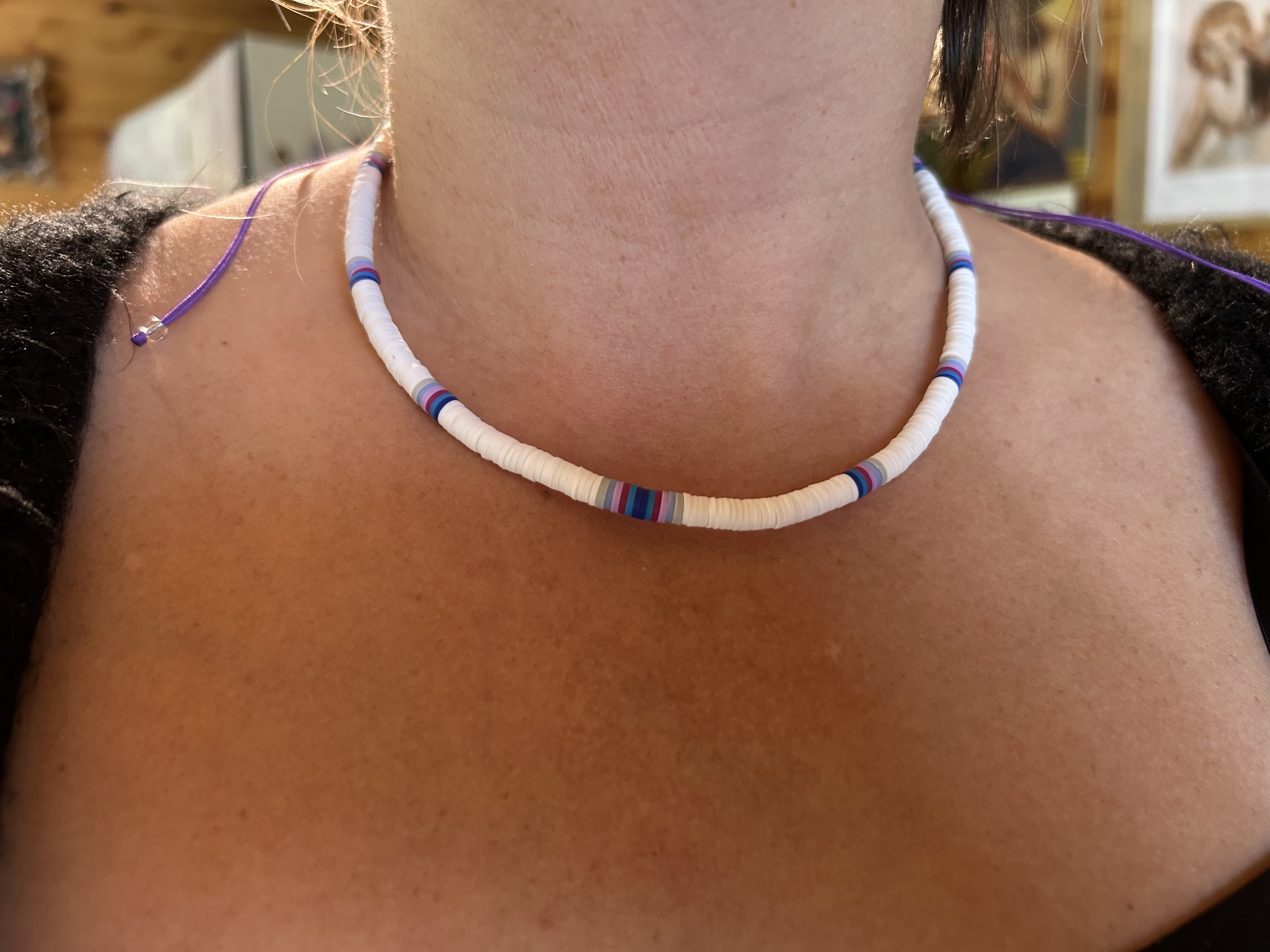 Nom : Collier Heishi “Pure Waves – White & Lavender Ocean Lines”