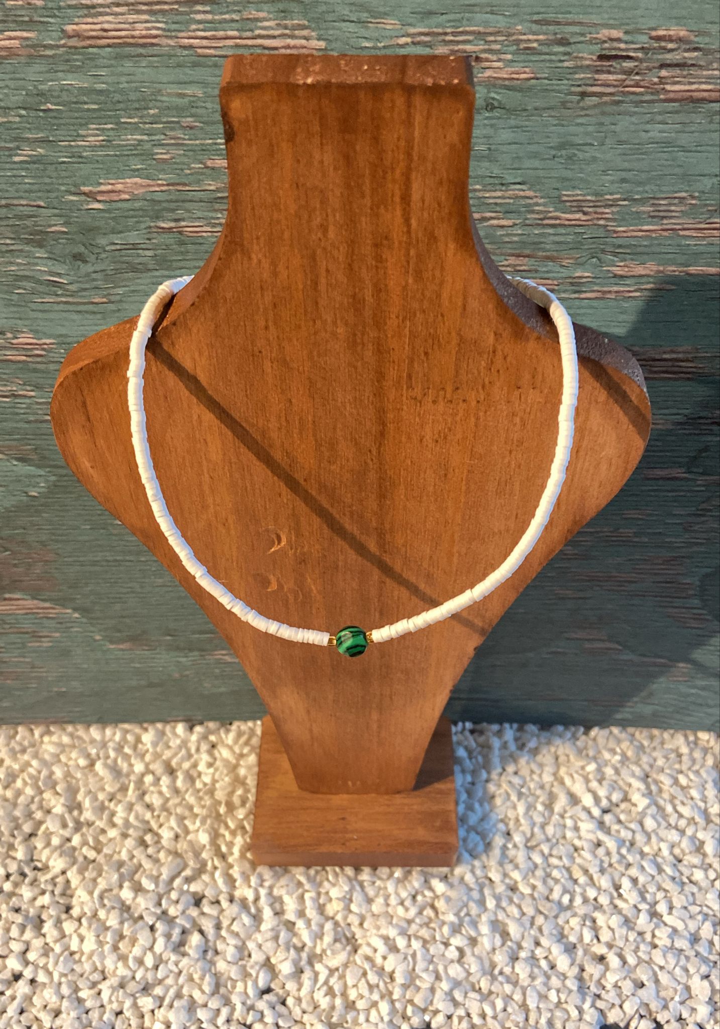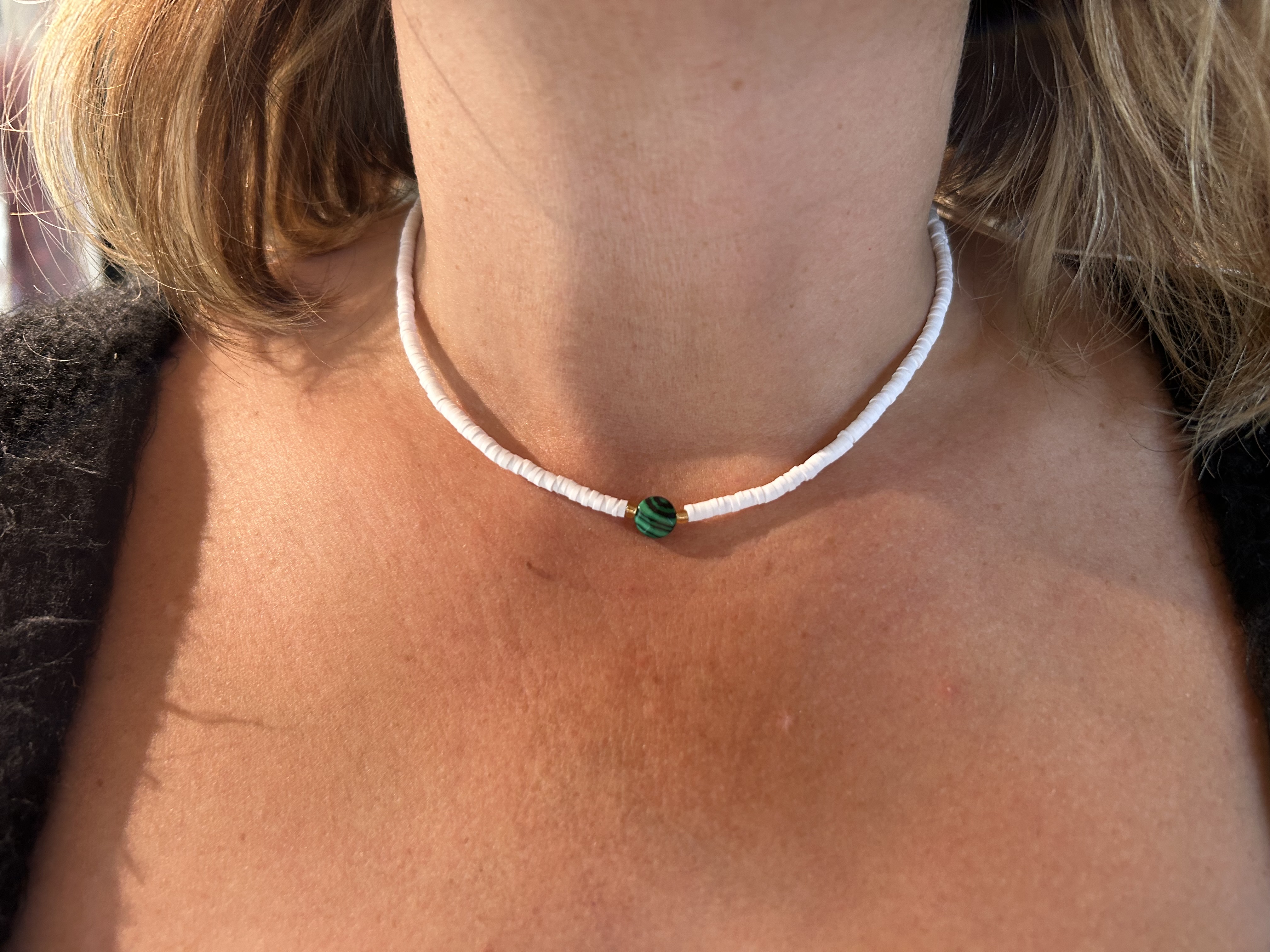 Le collier Protection de Sumatra est un bijou d'une grande symbolique, qui associe la pureté du blanc à la puissance protectrice de la malachite, pierre d’équilibre et de transformation.