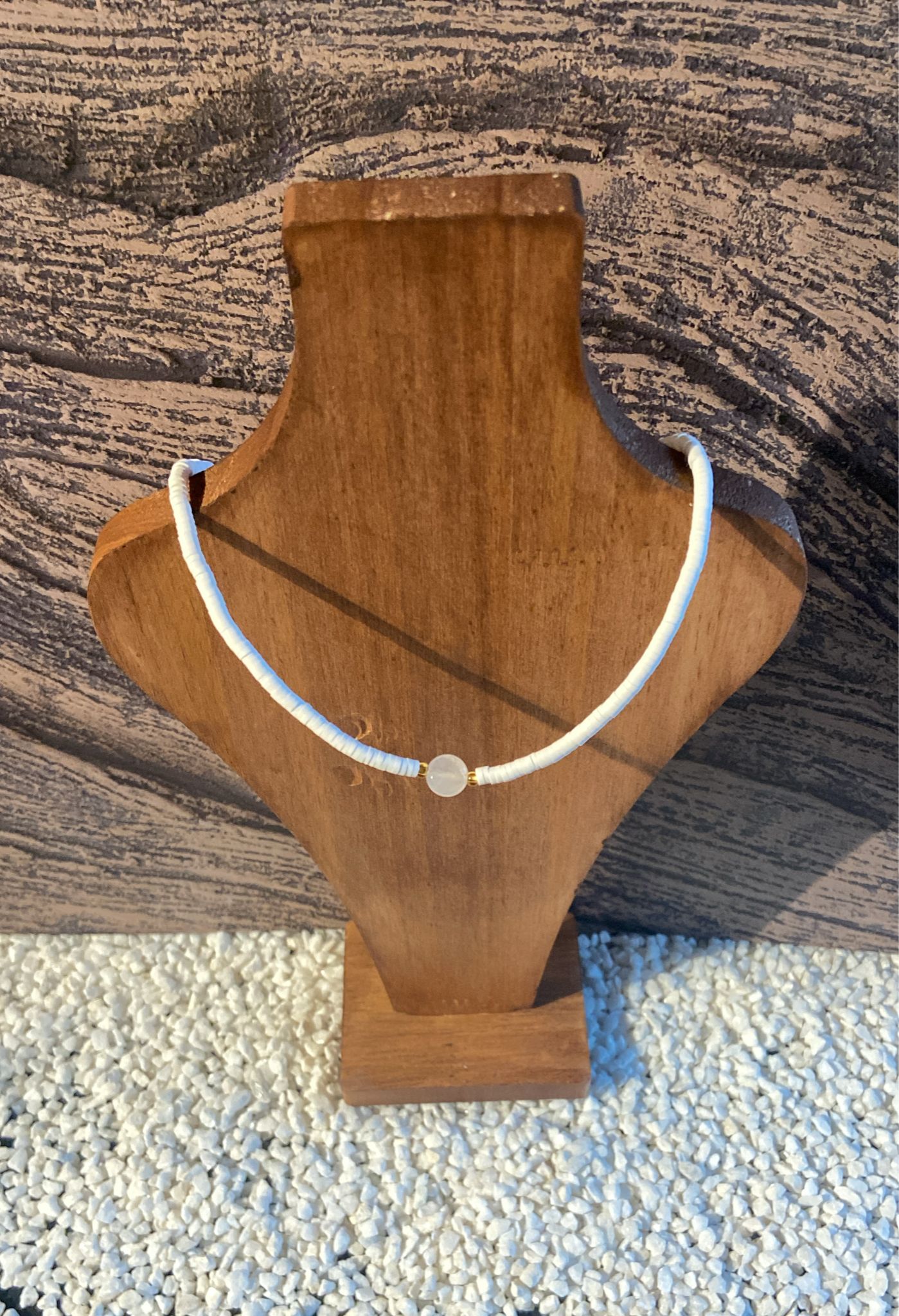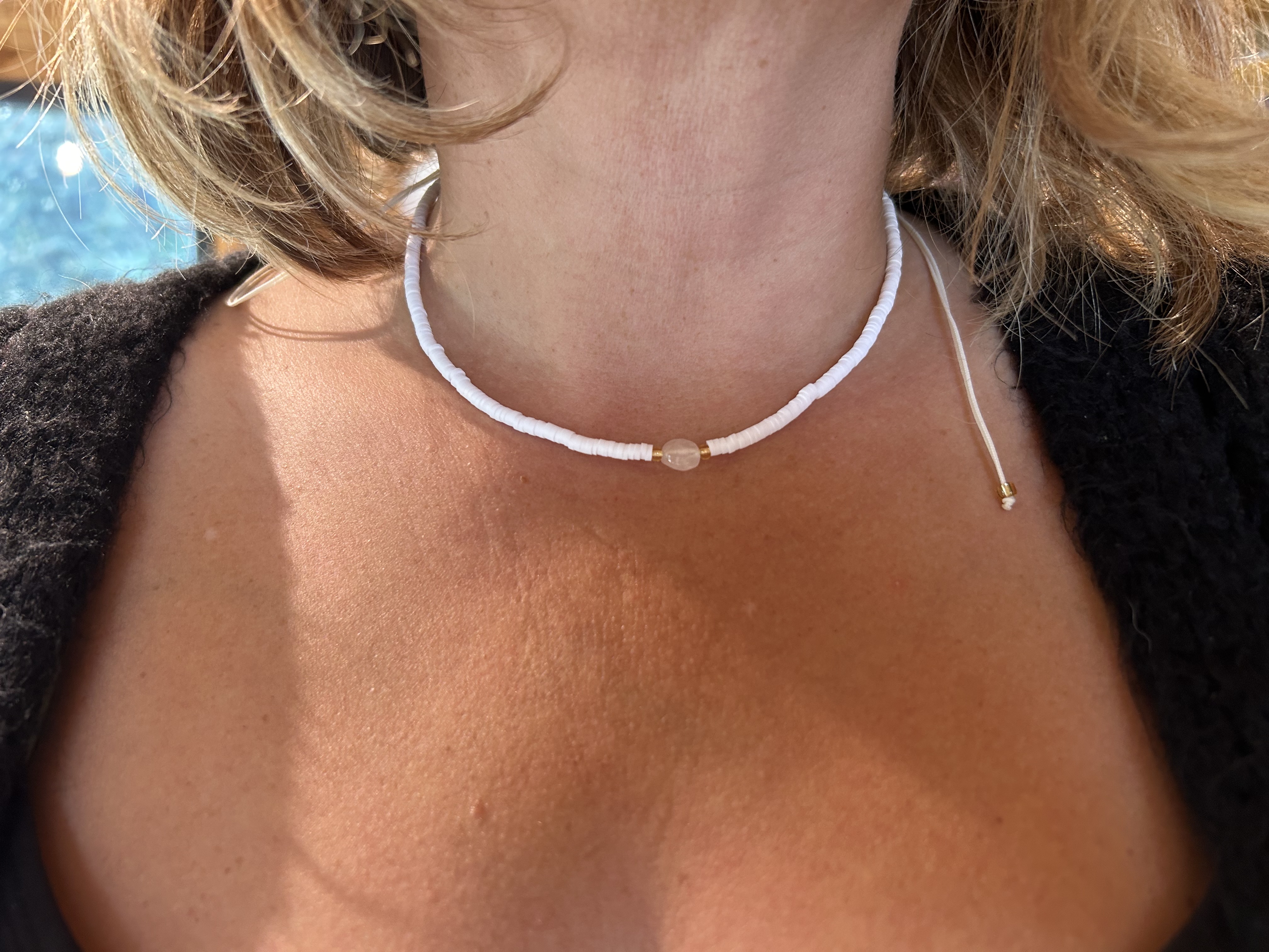Le collier est composé de perles plates blanches nacrées qui reflètent la lumière avec délicatesse, et se concentre sur une pierre centrale en quartz rose.