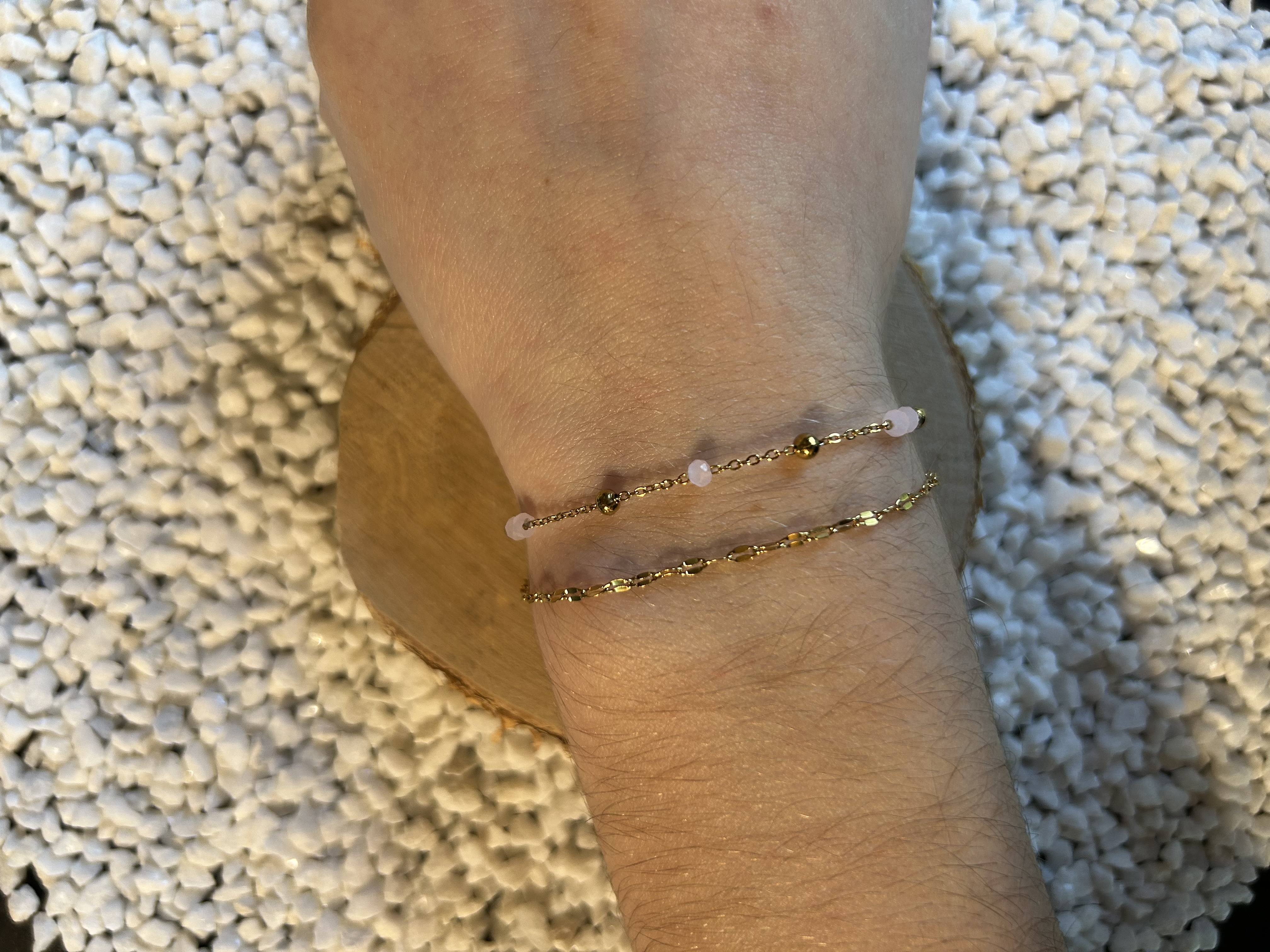 Ce bracelet offre l'esthétique d'une accumulation chic tout en restant léger et confortable. La présence du Quartz Rose (symbole d'amour et d'apaisement) en fait un accessoire idéal pour le quotidien, offrant élégance et bien-être.