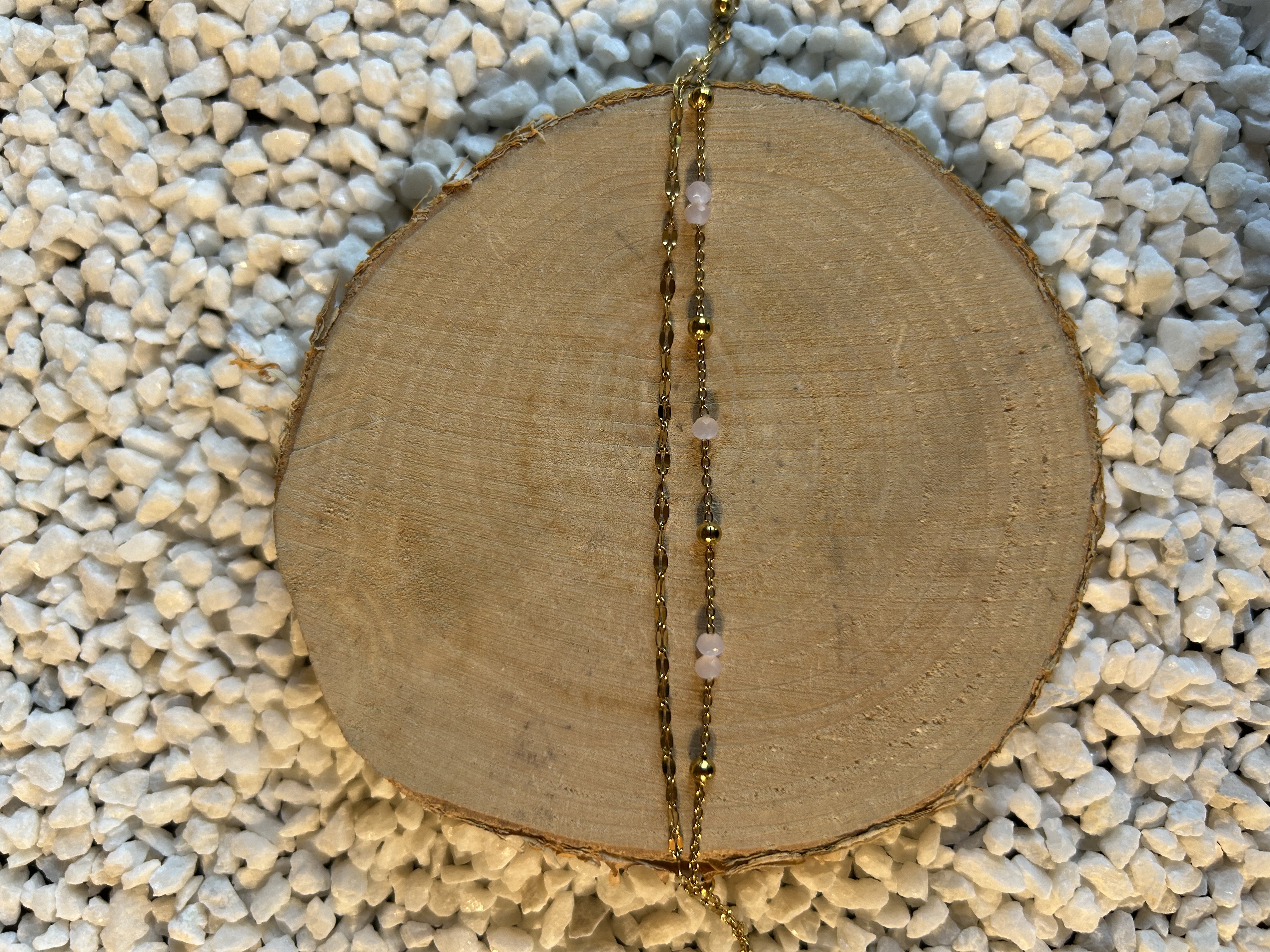 Le Bracelet "Anaïs" est une pièce élégante, conçue en un seul bijou à double rang intégré pour un effet de superposition sans effort. Il marie l'éclat des chaînes dorées à la tendresse des perles de Quartz Rose pour un look à la fois moderne et profondément féminin.