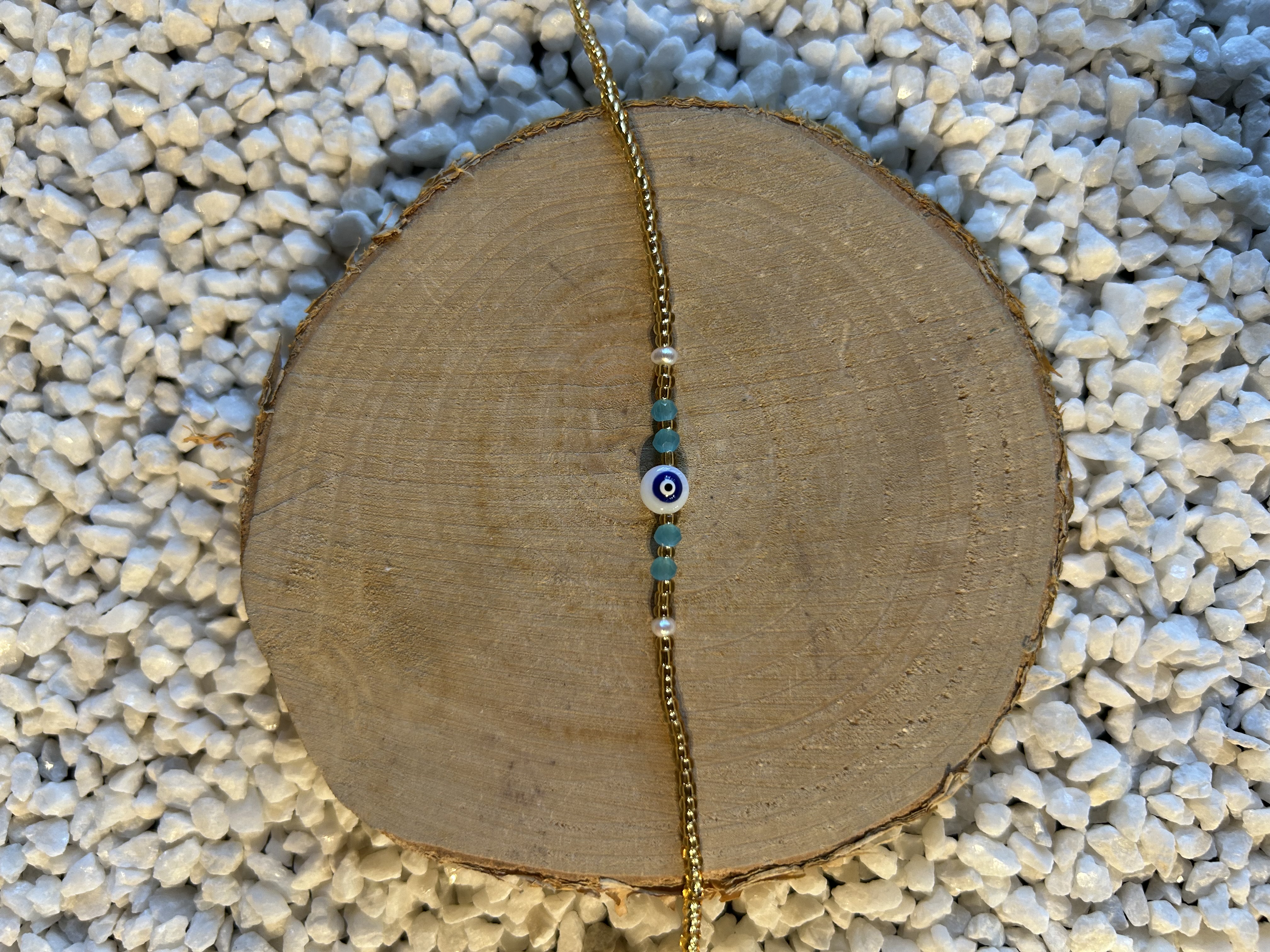 Matières : Chaîne fine dorée, micro-perles dorées, perles turquoise, œil protecteur noir & blanc, perles nacrées