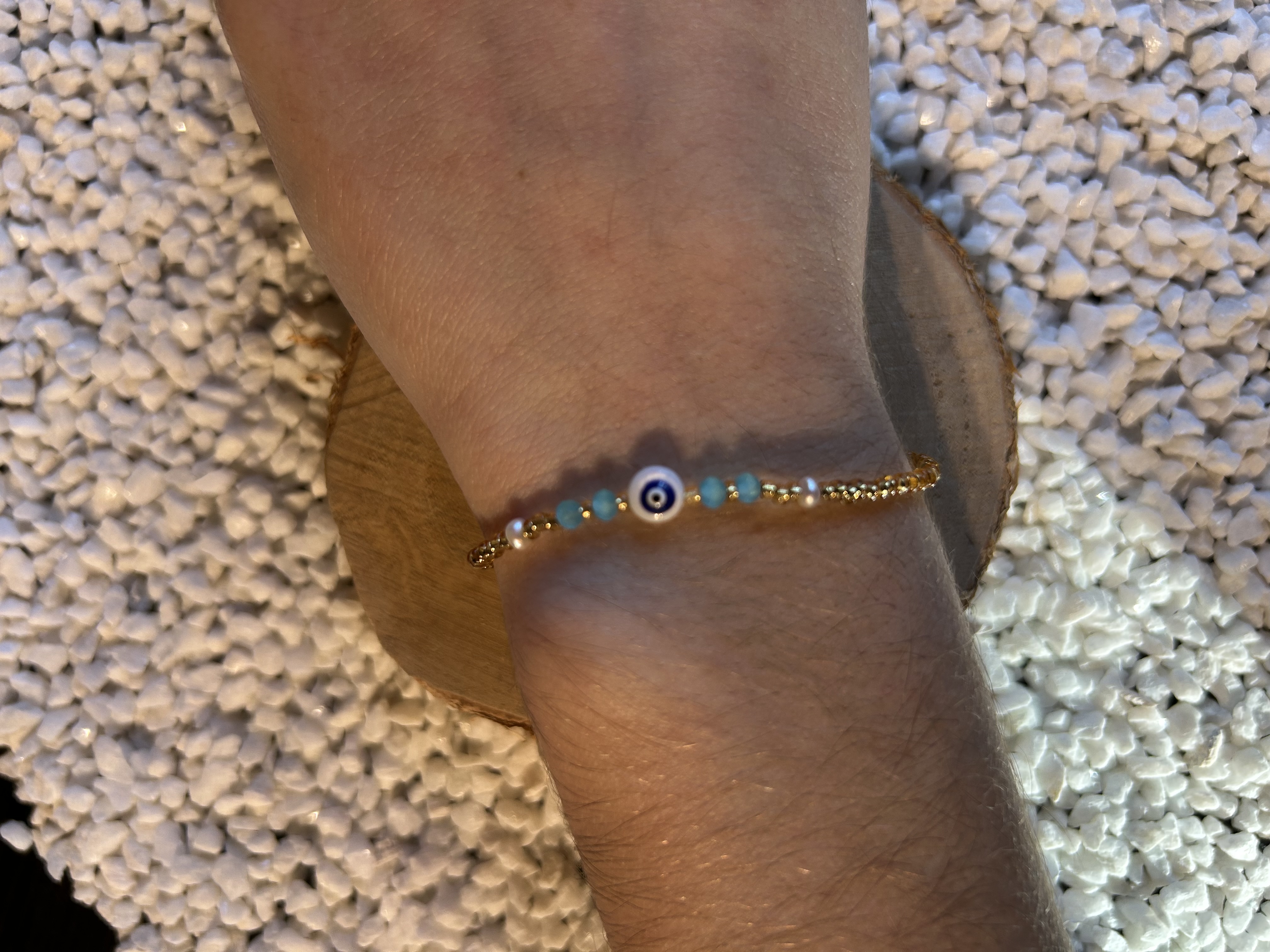 Inspiré par la douceur des brises méditerranéennes et la magie des porte-bonheurs ancestraux, le bracelet Anissa séduit par son élégance solaire et son énergie apaisante. Sa fine chaîne dorée est délicatement ponctuée de micro-perles dorées, de fines perles turquoise, ainsi que d'un œil porte-bonheur central et de deux petites perles nacrées, symboles universels de guidance, de pureté et de lumière intérieure.