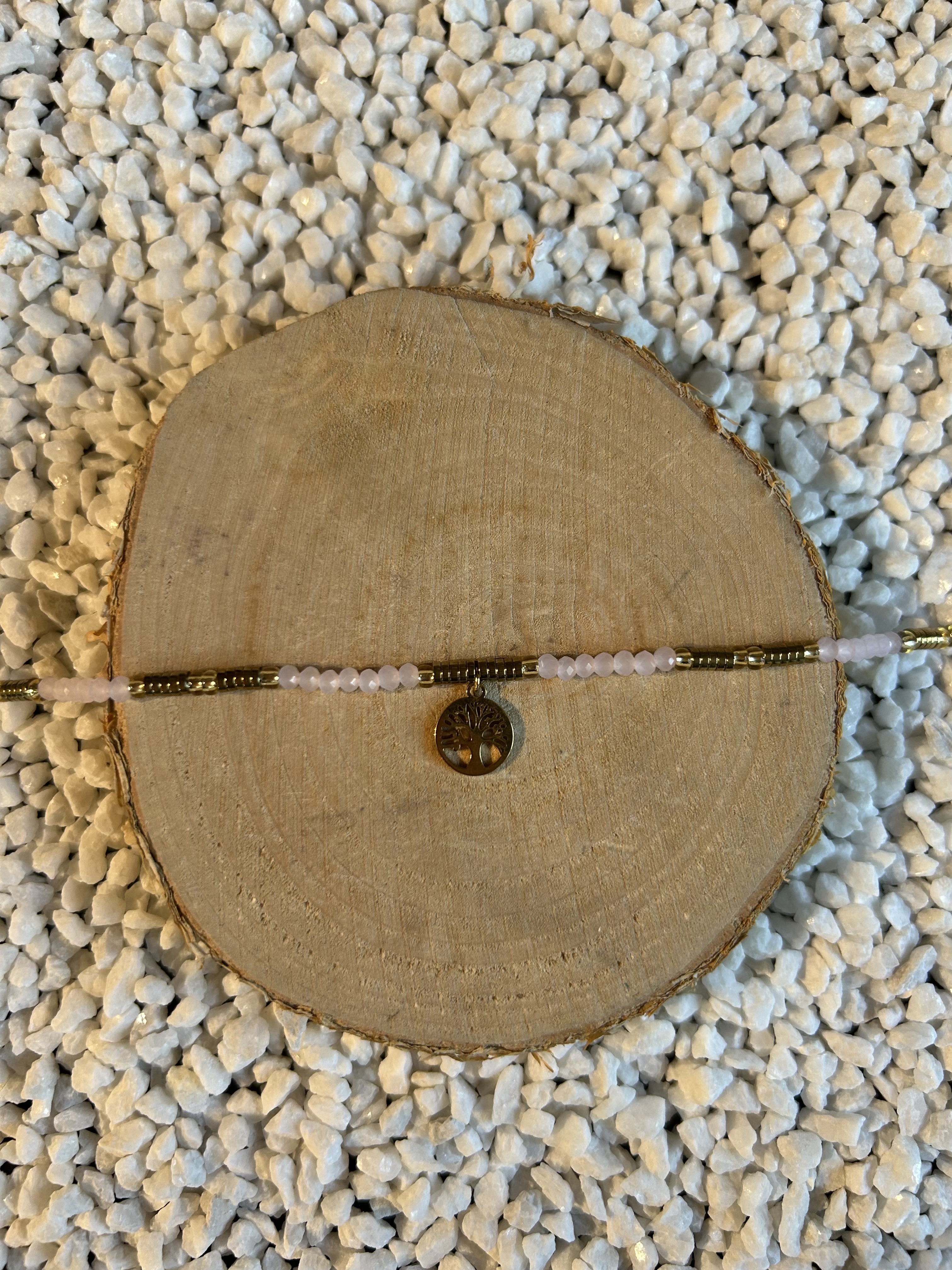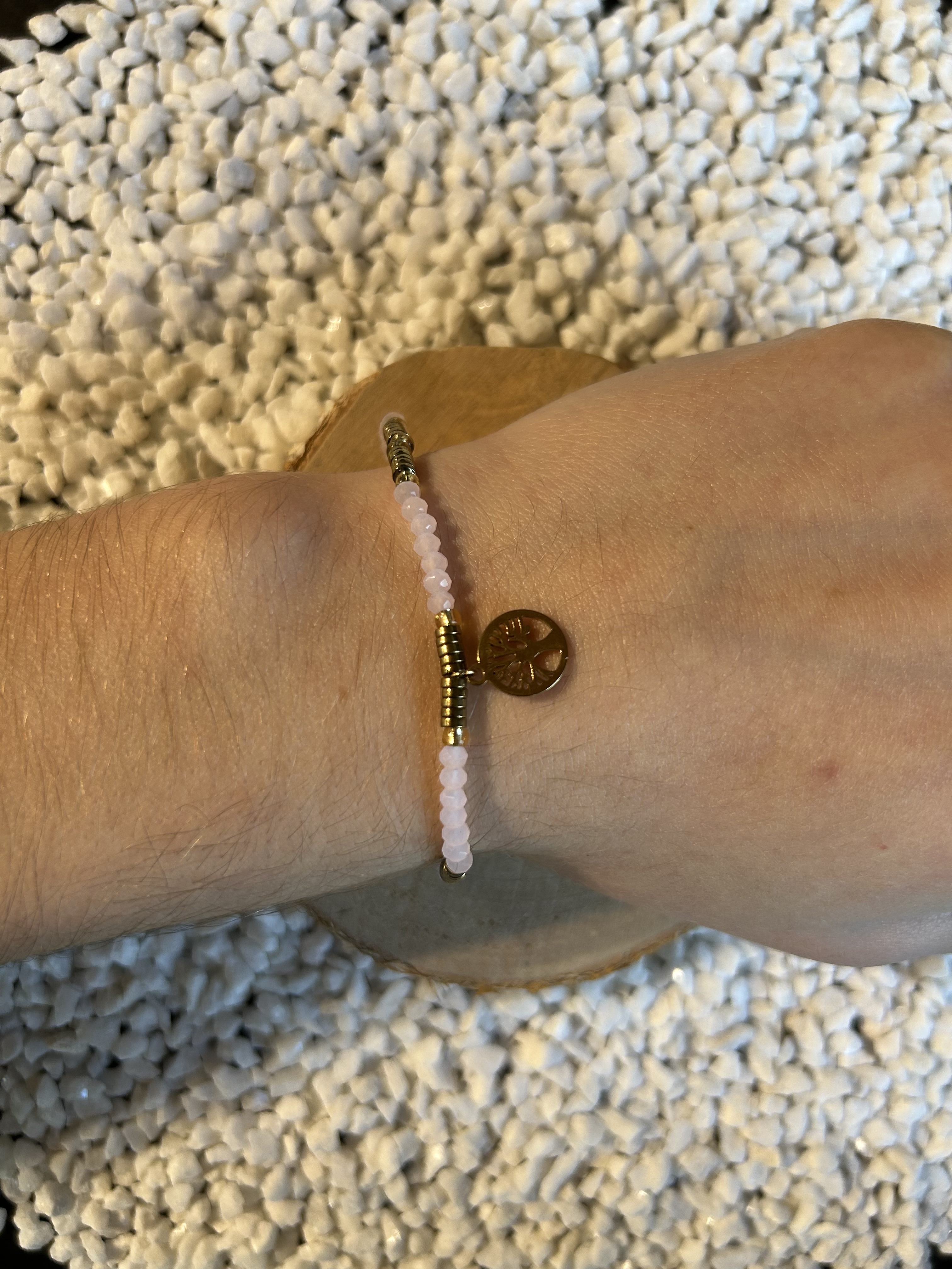 L'alliance du Quartz Rose, pierre de cœur, et de l'Arbre de Vie confère au bracelet une dimension de sérénité, d'ancrage et de positivité.