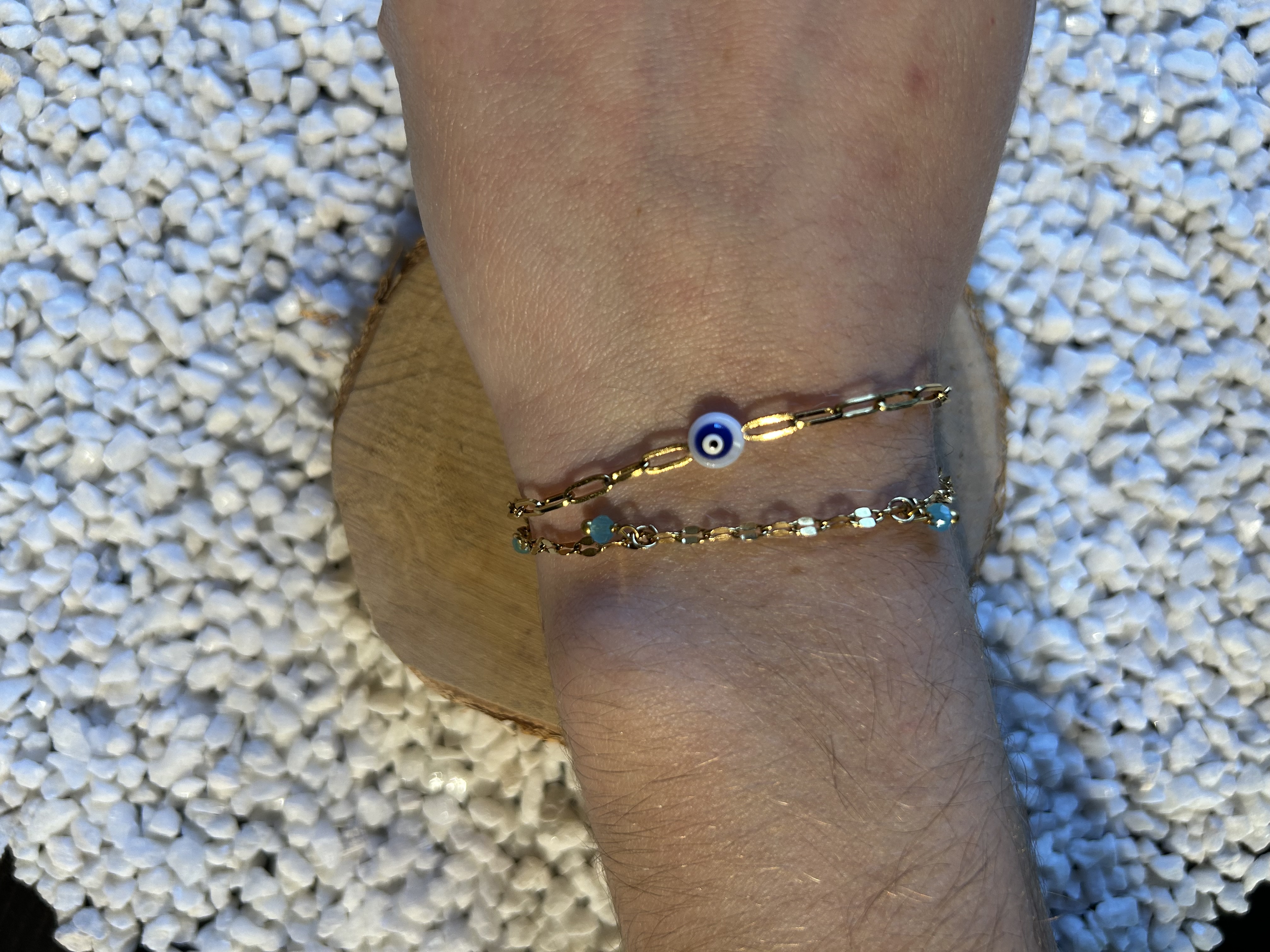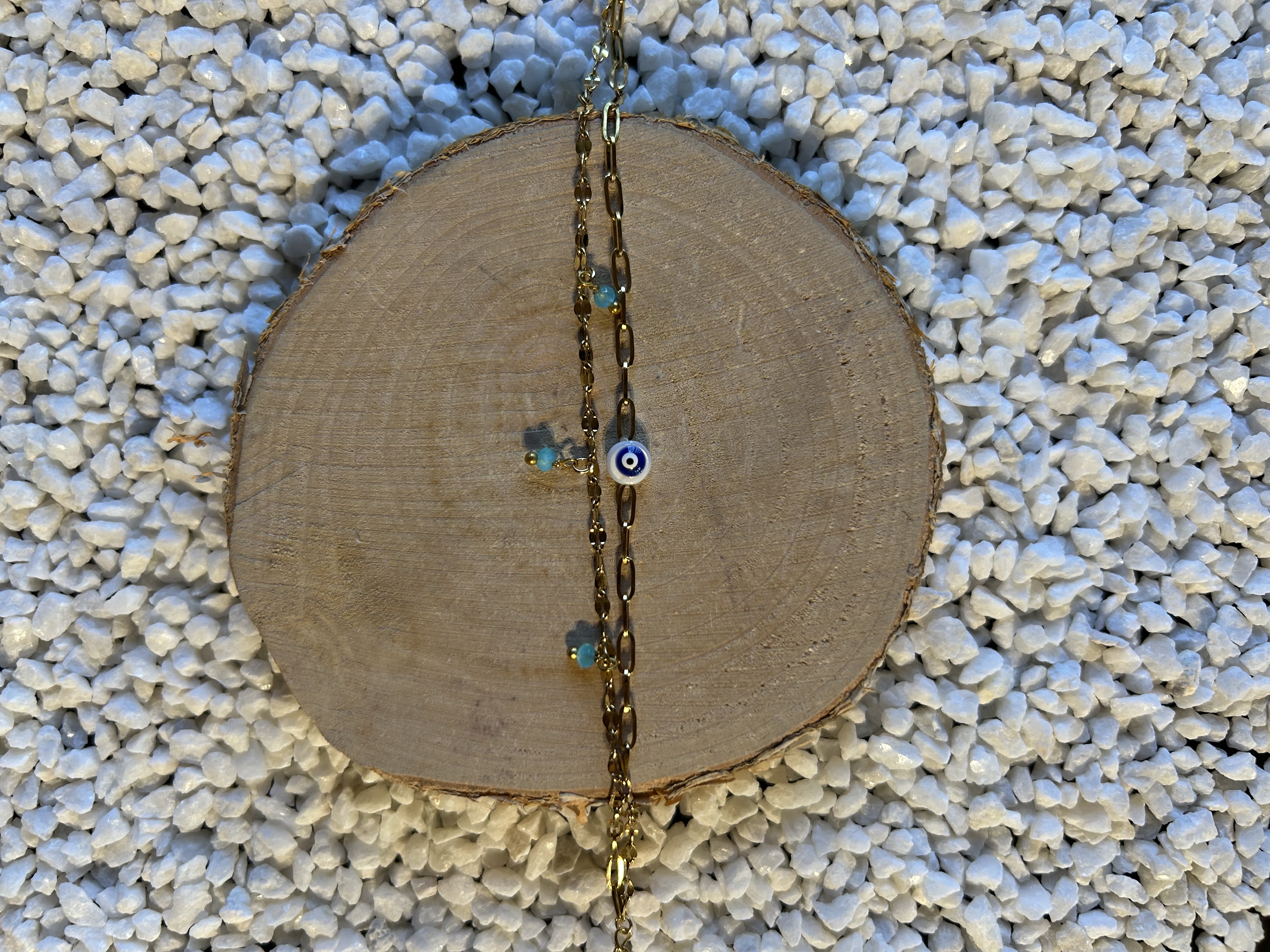 Matières : Chaîne fine dorée, perles turquoise, œil protecteur noir & blanc