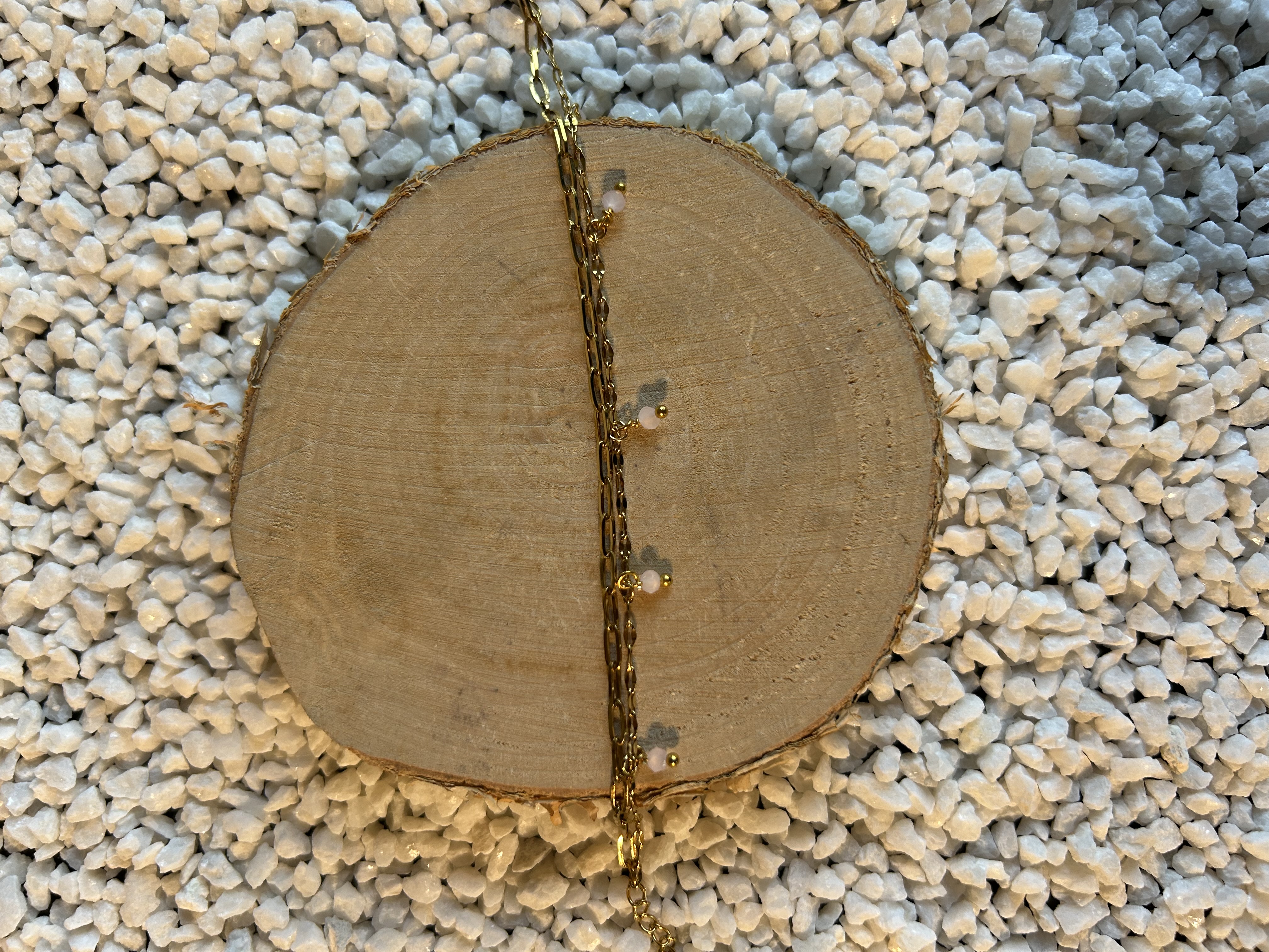 L'alliance de la chaîne dorée et des pépites roses est moderne et féminine, facile à assortir.
