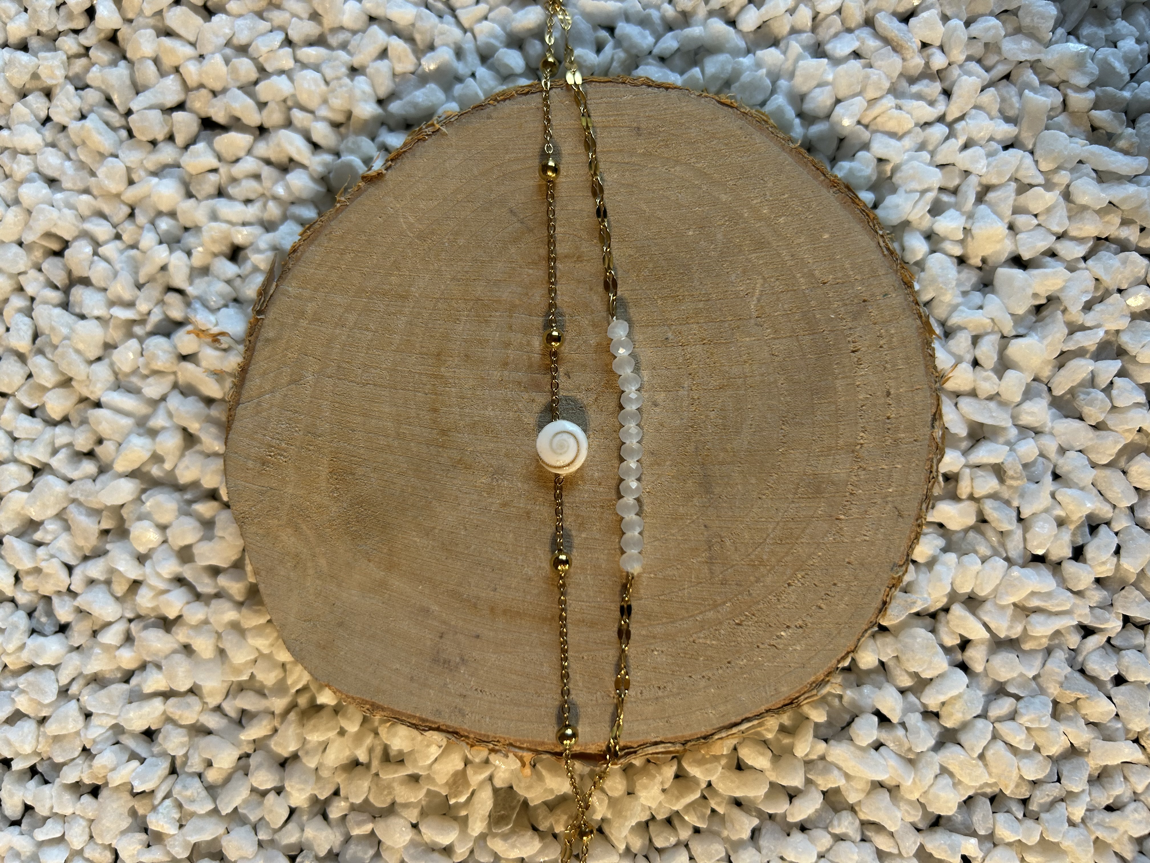 Le Bracelet "Stella" est une pièce élégante et polyvalente, offrant un effet de superposition délicat. Conçu en un seul bijou à double rang intégré, il marie la brillance de l'or à la pureté des perles blanches et au charme d'un talisman marin.