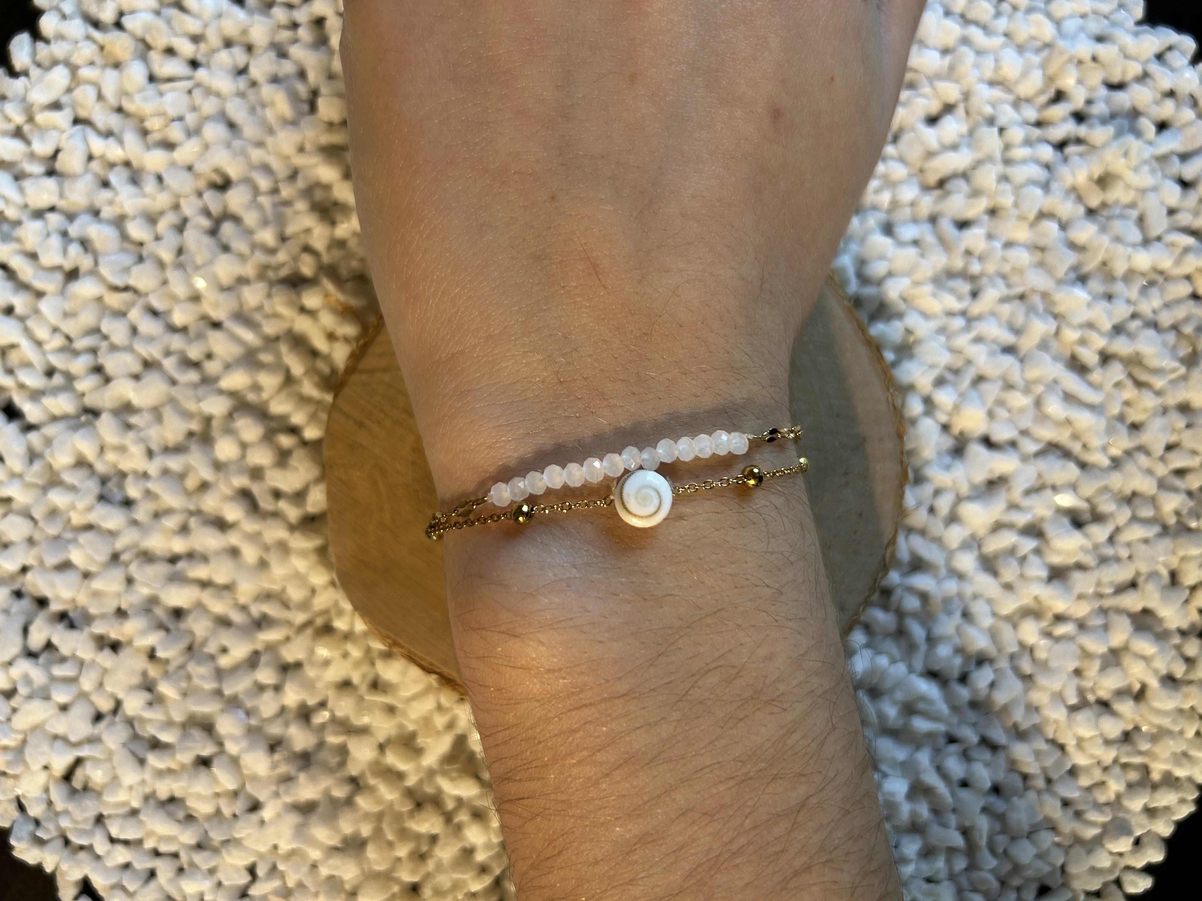 Ce bracelet unique offre l'esthétique d'une accumulation chic tout en restant léger et confortable. Sa palette de couleurs intemporelles (blanc et doré) en fait un accessoire idéal pour tous les jours, ajoutant une touche de raffinement et de signification positive.