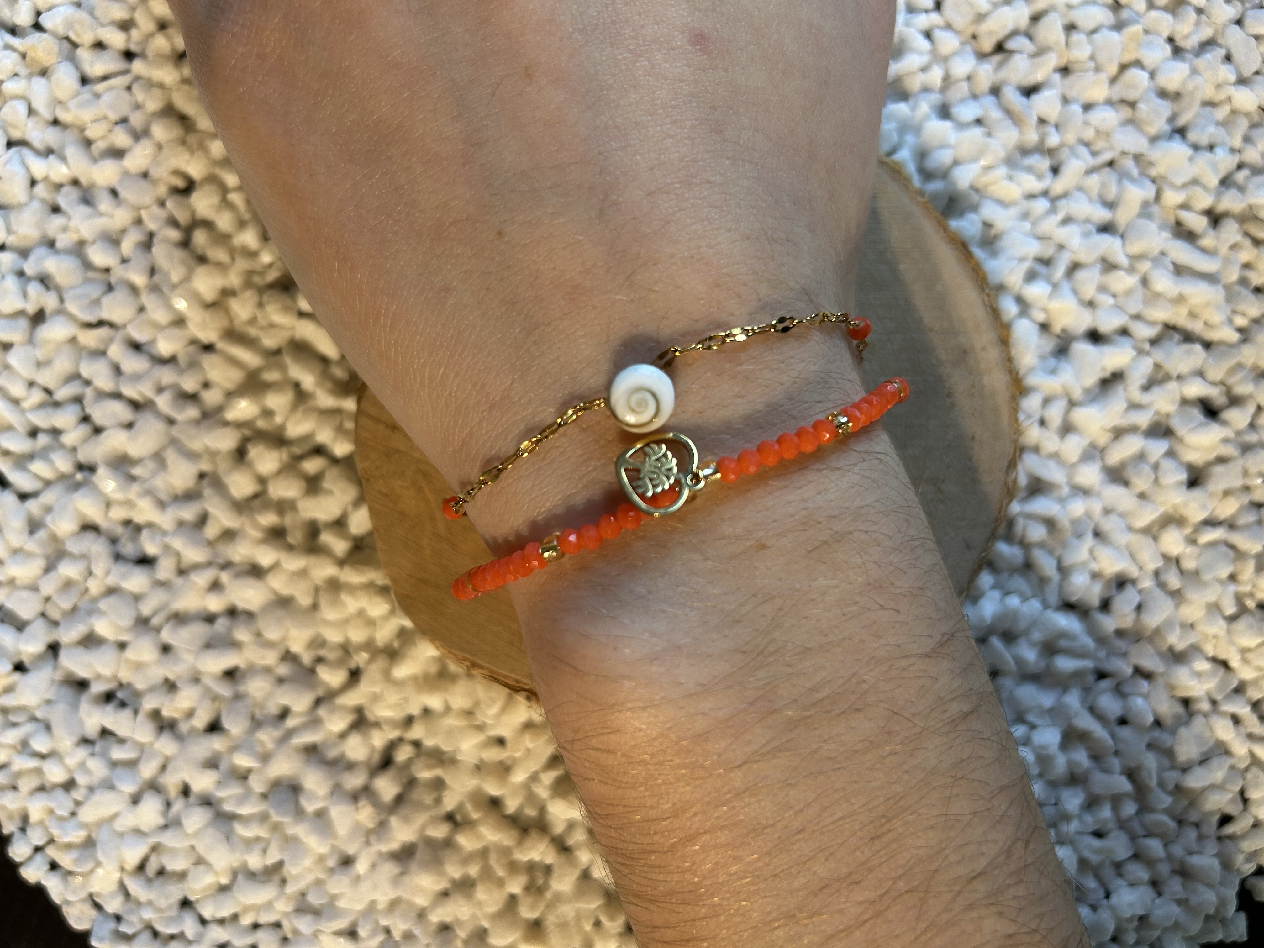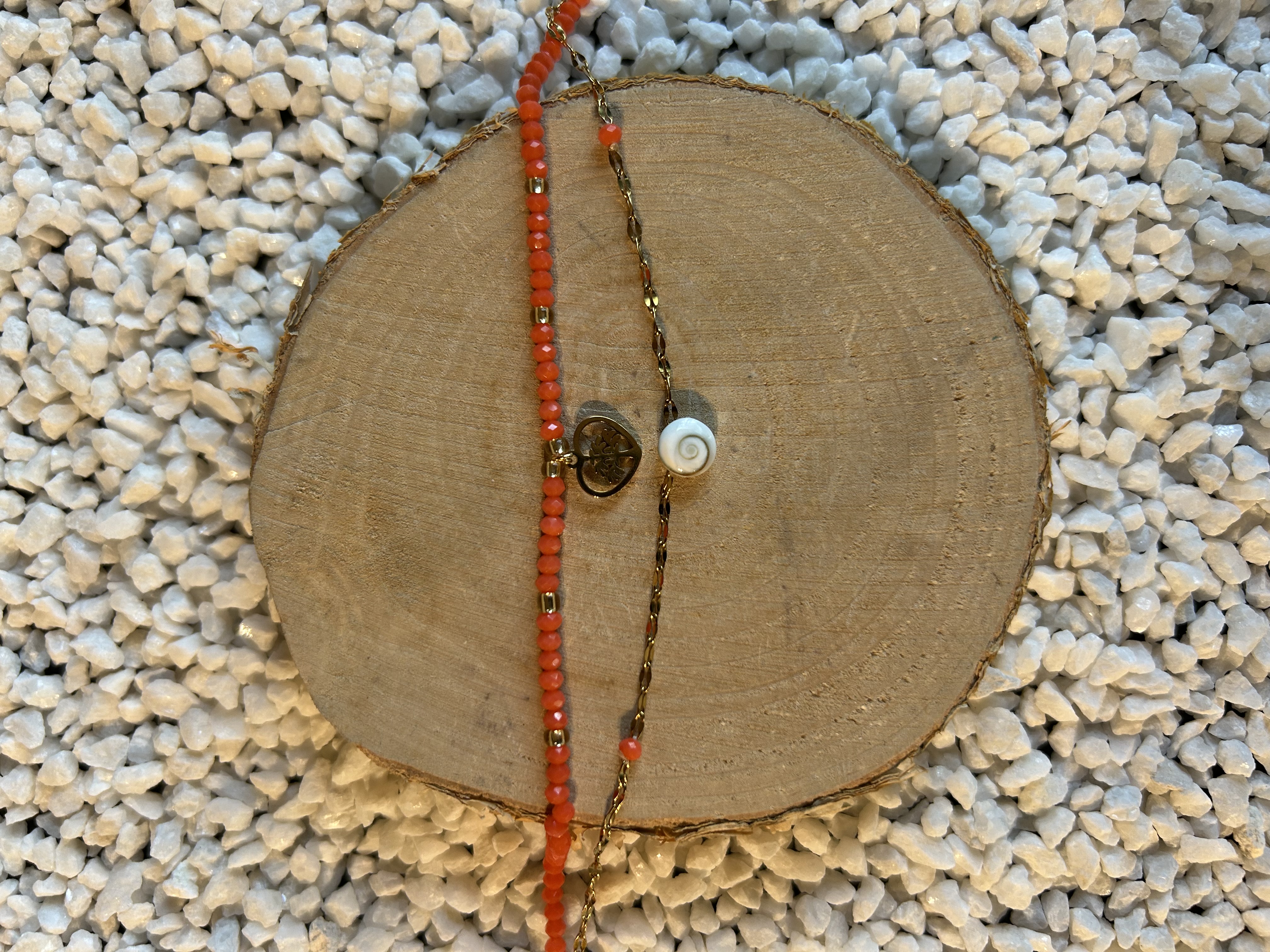 Le Bracelet "Vie Marine" est une création délicate à double rang intégré, célébrant la connexion entre la vitalité et la mer. Il associe l'énergie des perles corail à la puissante symbolique de l'Arbre de Vie et du coquillage porte-bonheur.