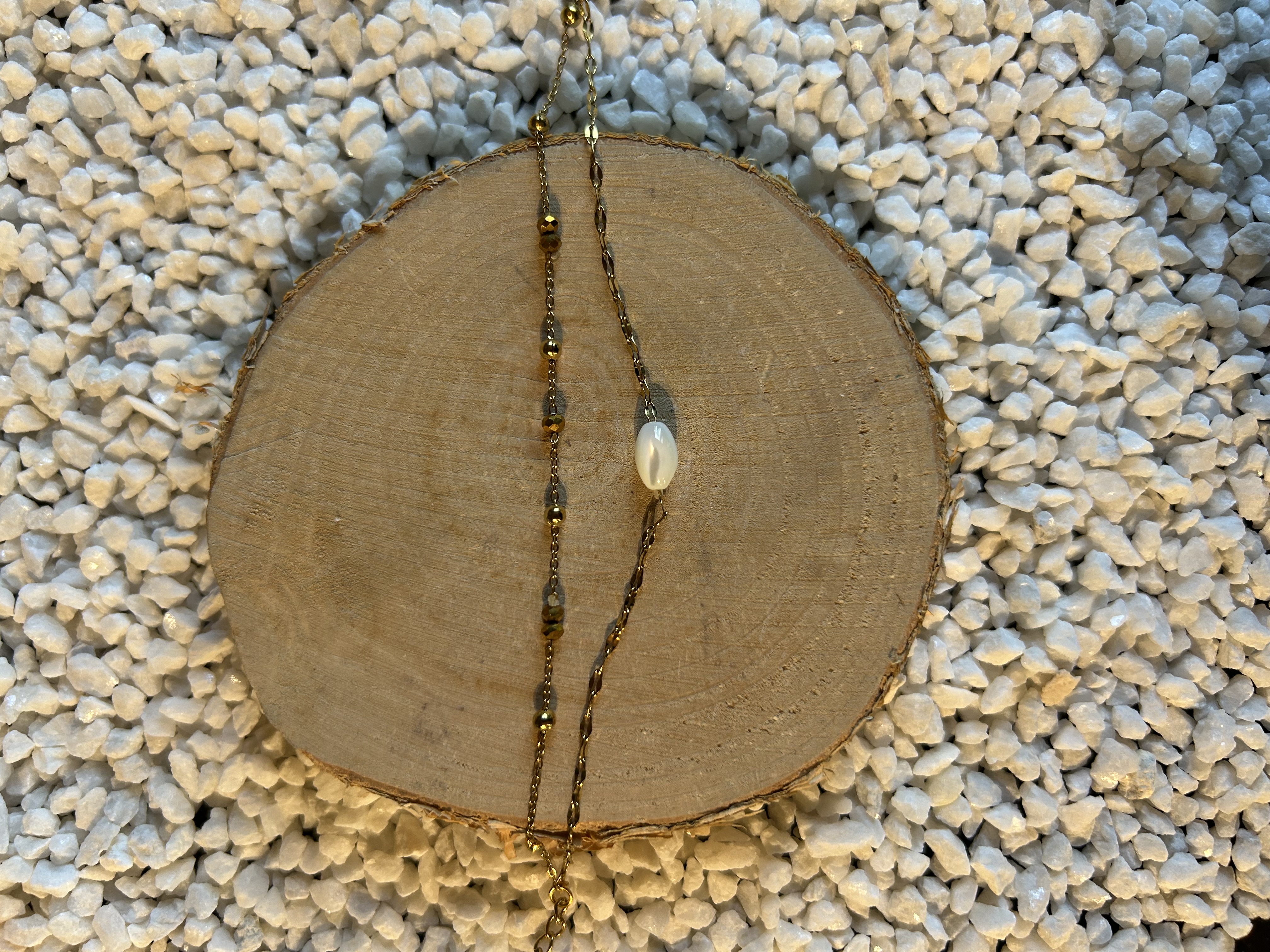 Pureté & Lumière mêlées La perle centrale, baignée par l'éclat des chaînes dorées, apporte un sentiment de calme, de sérénité et de beauté intemporelle. Un duo qui ne se contente pas de briller – il vous enveloppe de douceur.
