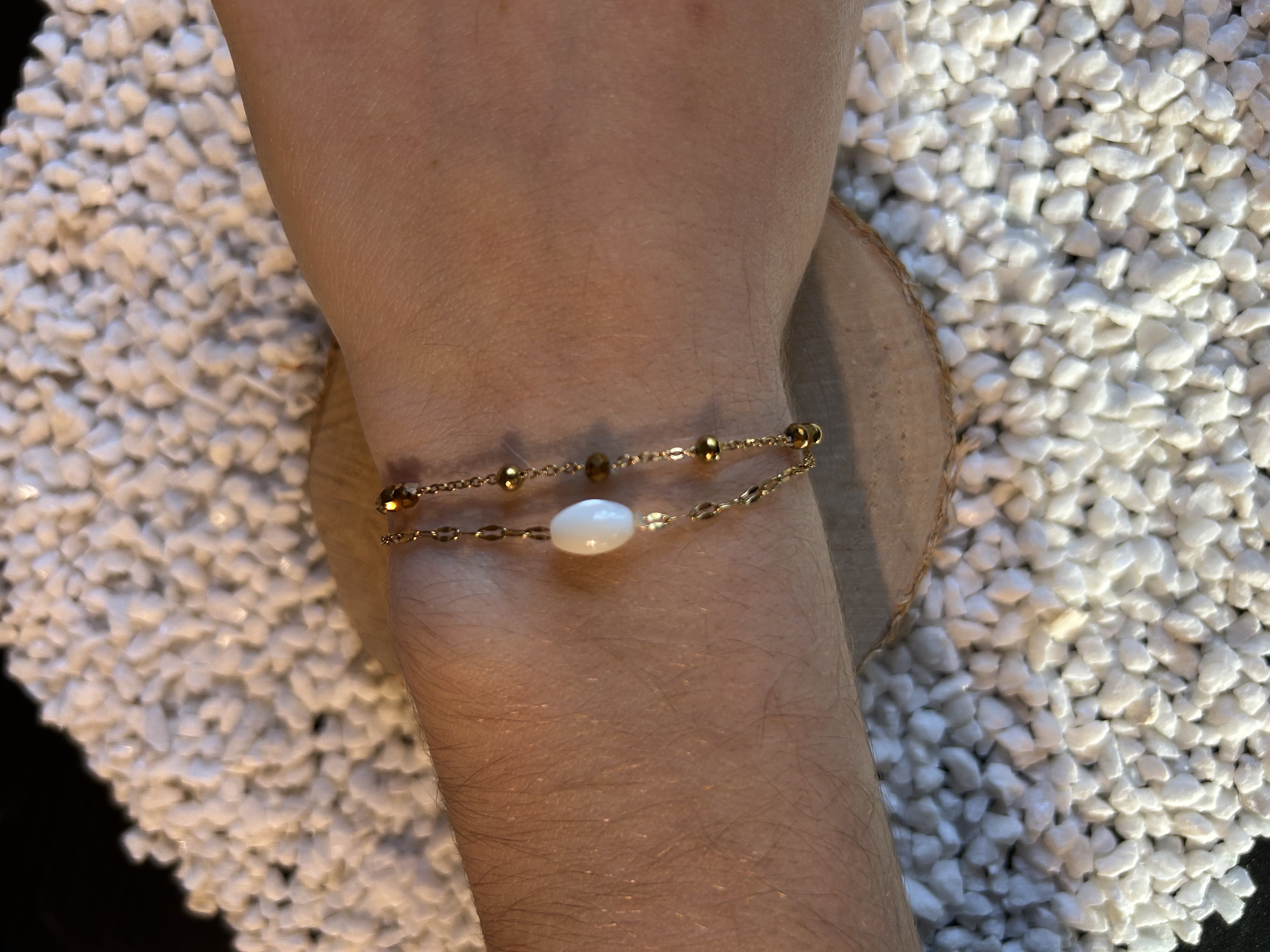 Inspiré par la noblesse des perles et l'éclat chaleureux de l'or, le bracelet Alya séduit par son accumulation sophistiquée et son énergie intemporelle. Son double rang doré est conçu pour célébrer la pureté et la féminité, offrant un contraste parfait entre :