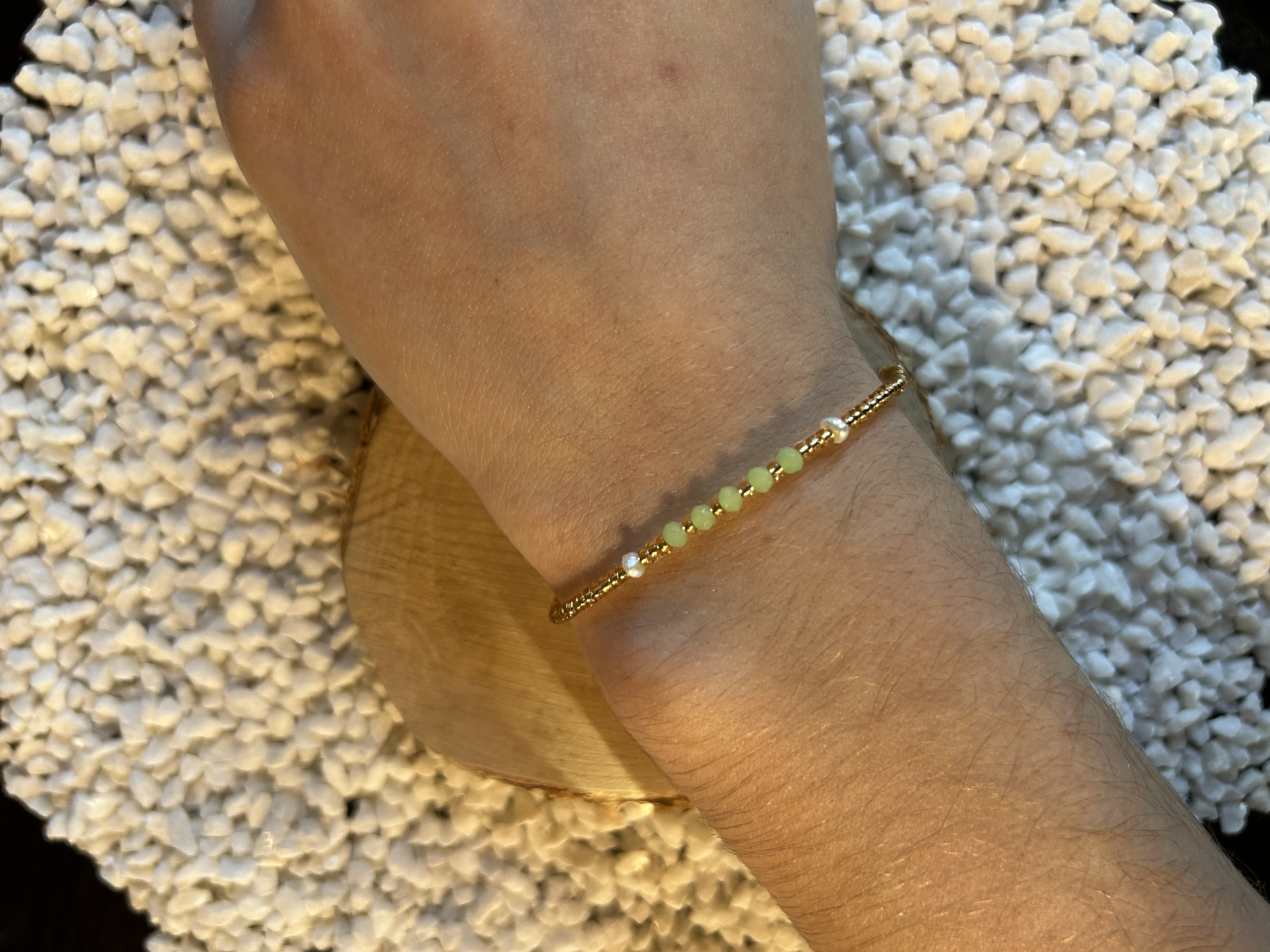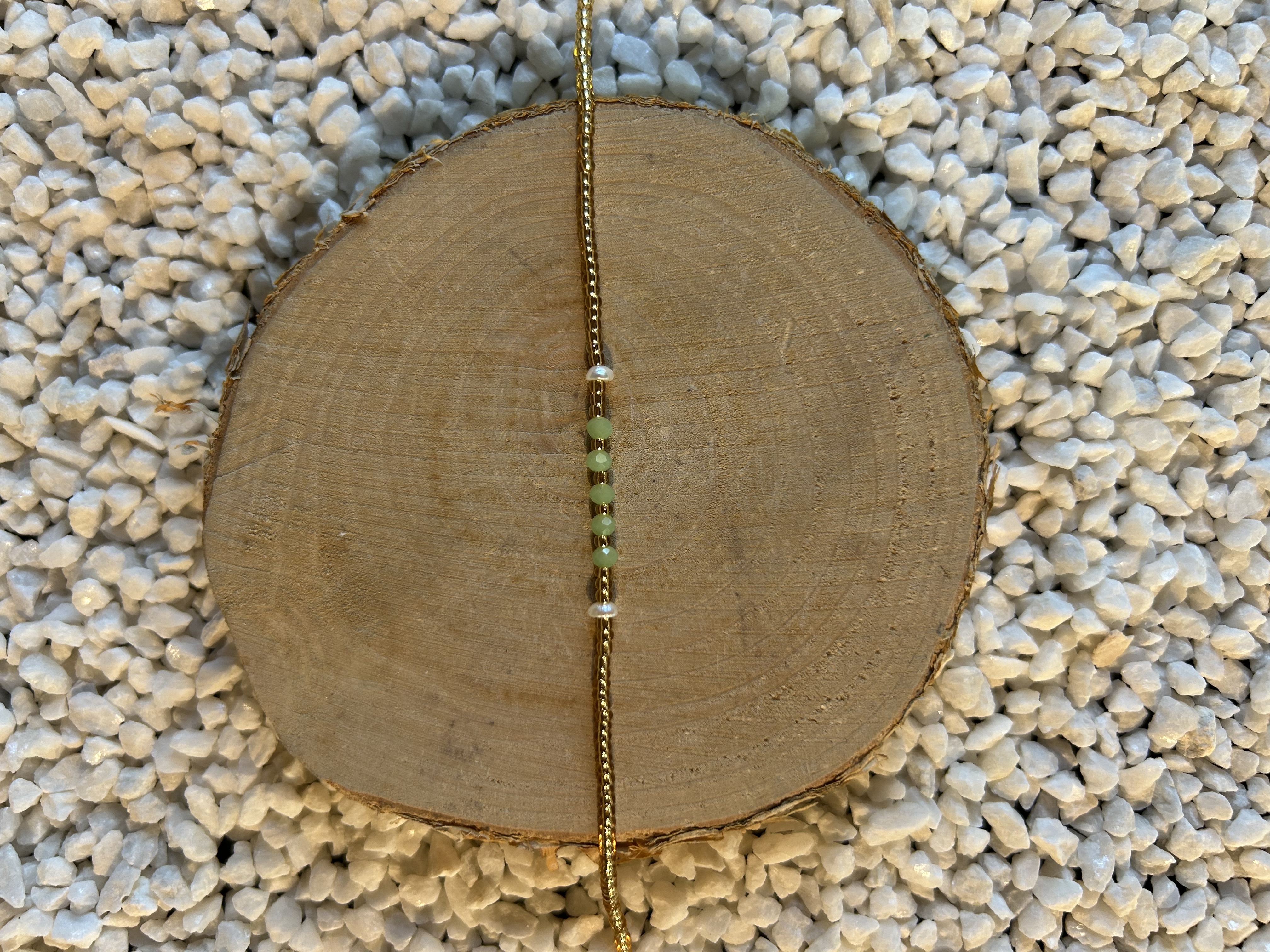 Inspiré par la douceur du printemps et la pureté des perles, le bracelet Apolline séduit par son élégance minimaliste et son énergie apaisante. Sa fine chaîne perlée dorée est sublimée par un segment central de perles vert pâle (ou céladon) et de deux micro-perles nacrées, offrant un contraste parfait entre l'éclat de l'or et la sérénité du végétal.