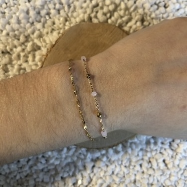 Le Bracelet "Anaïs" est une pièce élégante, conçue en un seul bijou à double rang intégré pour un effet de superposition sans effort. Il marie l'éclat des chaînes dorées à la tendresse des perles de Quartz Rose pour un look à la fois moderne et profondément féminin.