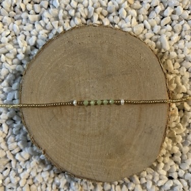Inspiré par la douceur du printemps et la pureté des perles, le bracelet Apolline séduit par son élégance minimaliste et son énergie apaisante. Sa fine chaîne perlée dorée est sublimée par un segment central de perles vert pâle (ou céladon) et de deux micro-perles nacrées, offrant un contraste parfait entre l'éclat de l'or et la sérénité du végétal.