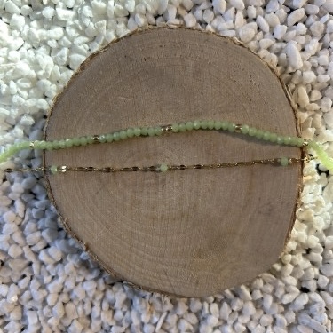 Une chaîne perlée vibrante de perles vert d'eau facetées (évoquant le calme et la sérénité).