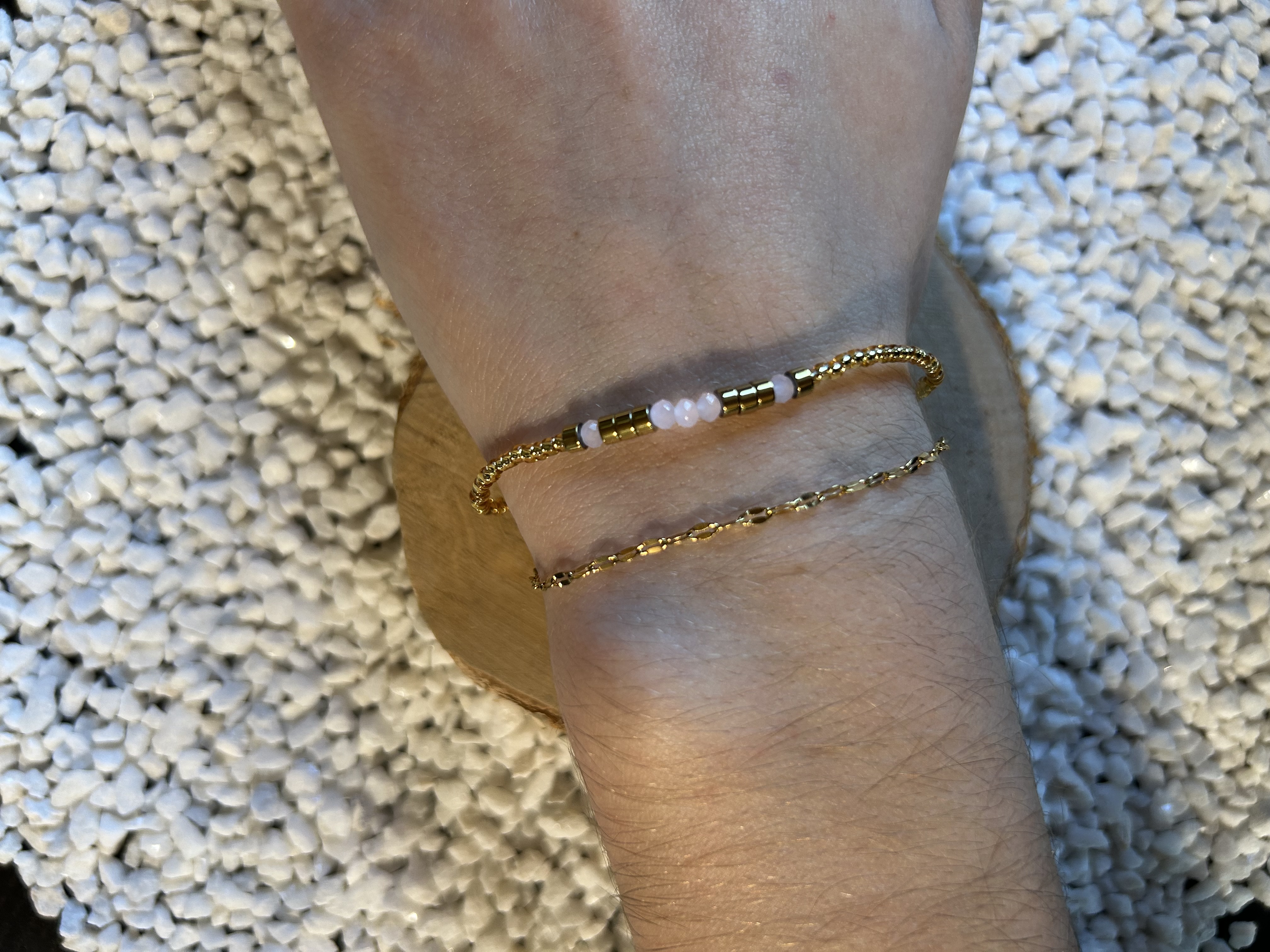 Le Bracelet "Louise" est une pièce élégante et polyvalente, offrant un effet de superposition raffiné. Il marie la brillance des chaînes dorées avec la tendresse des perles de Quartz Rose pour un look délicat et contemporain.