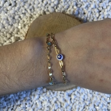 Matières : Chaîne fine dorée, perles turquoise, œil protecteur noir & blanc