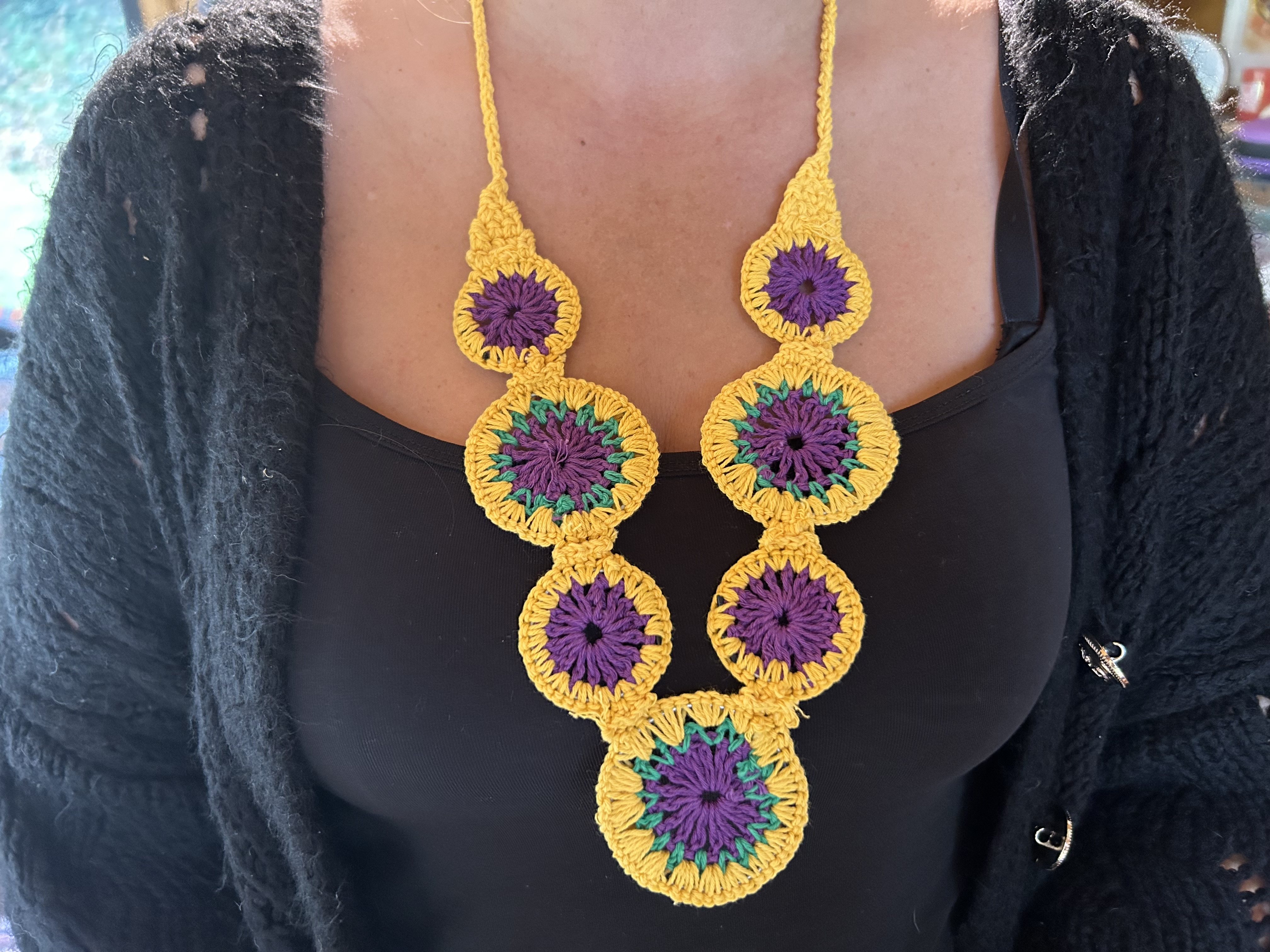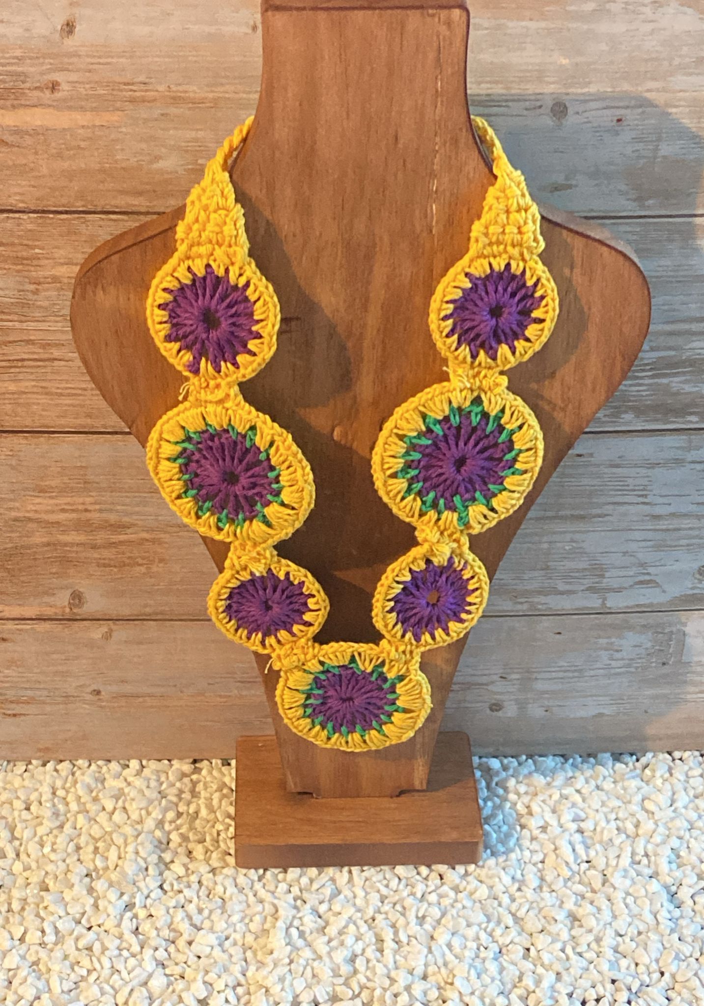 Le collier Arawa Jaune & Violet est une pièce vibrante et solaire, fruit du savoir-faire minutieux de nos artisanes indonésiennes. Ce bijou textile, entièrement crocheté à la main, est un concentré d'énergie et d'élégance.