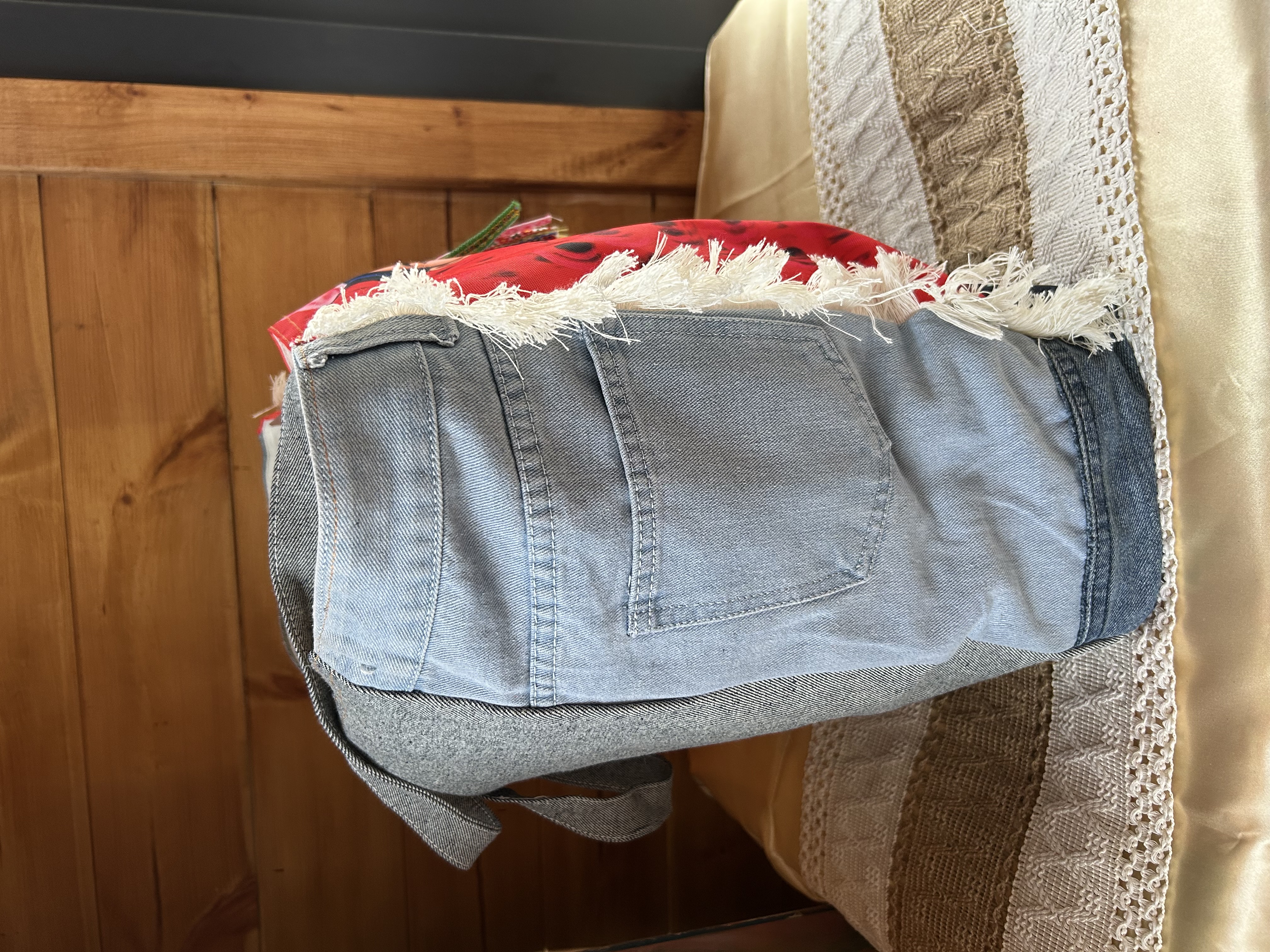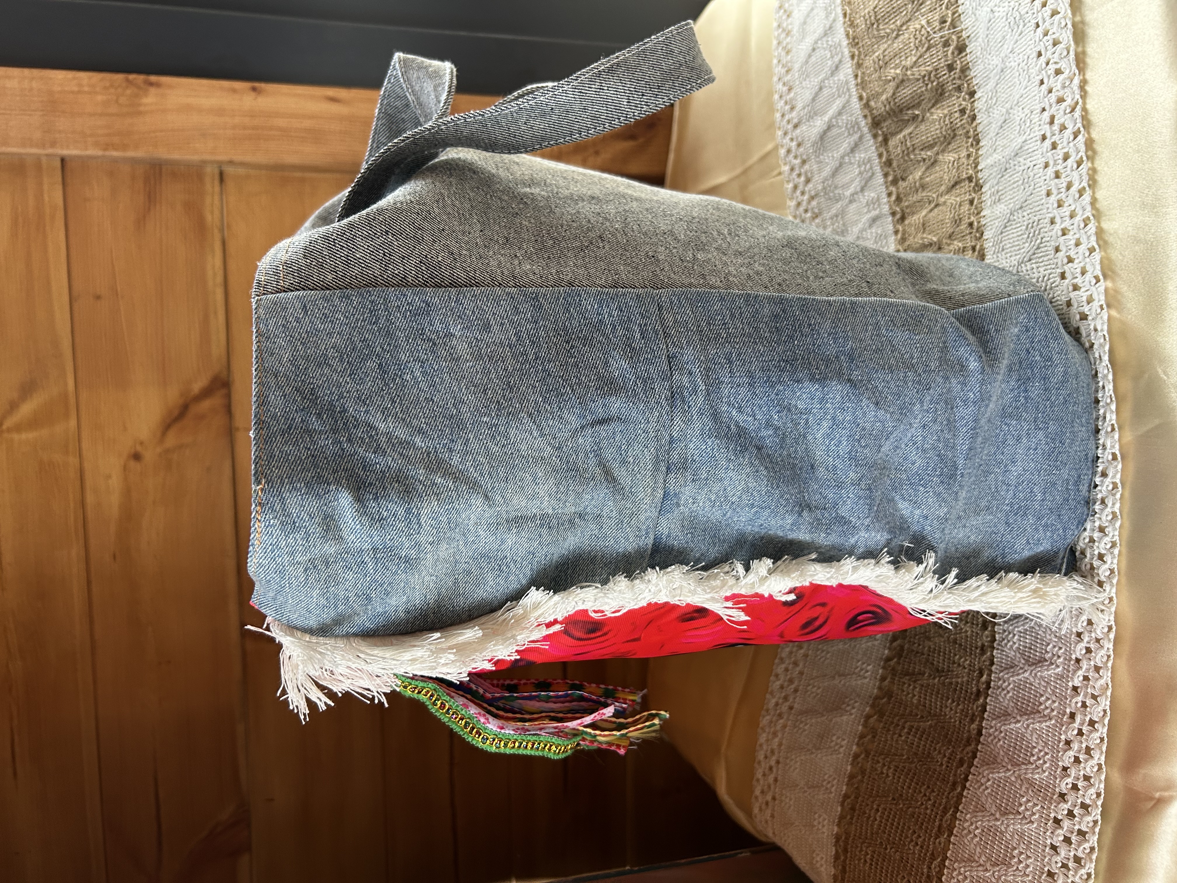 Matières : Jean recyclé, toile de coton imprimée, franges naturelles, rubans bohèmes.