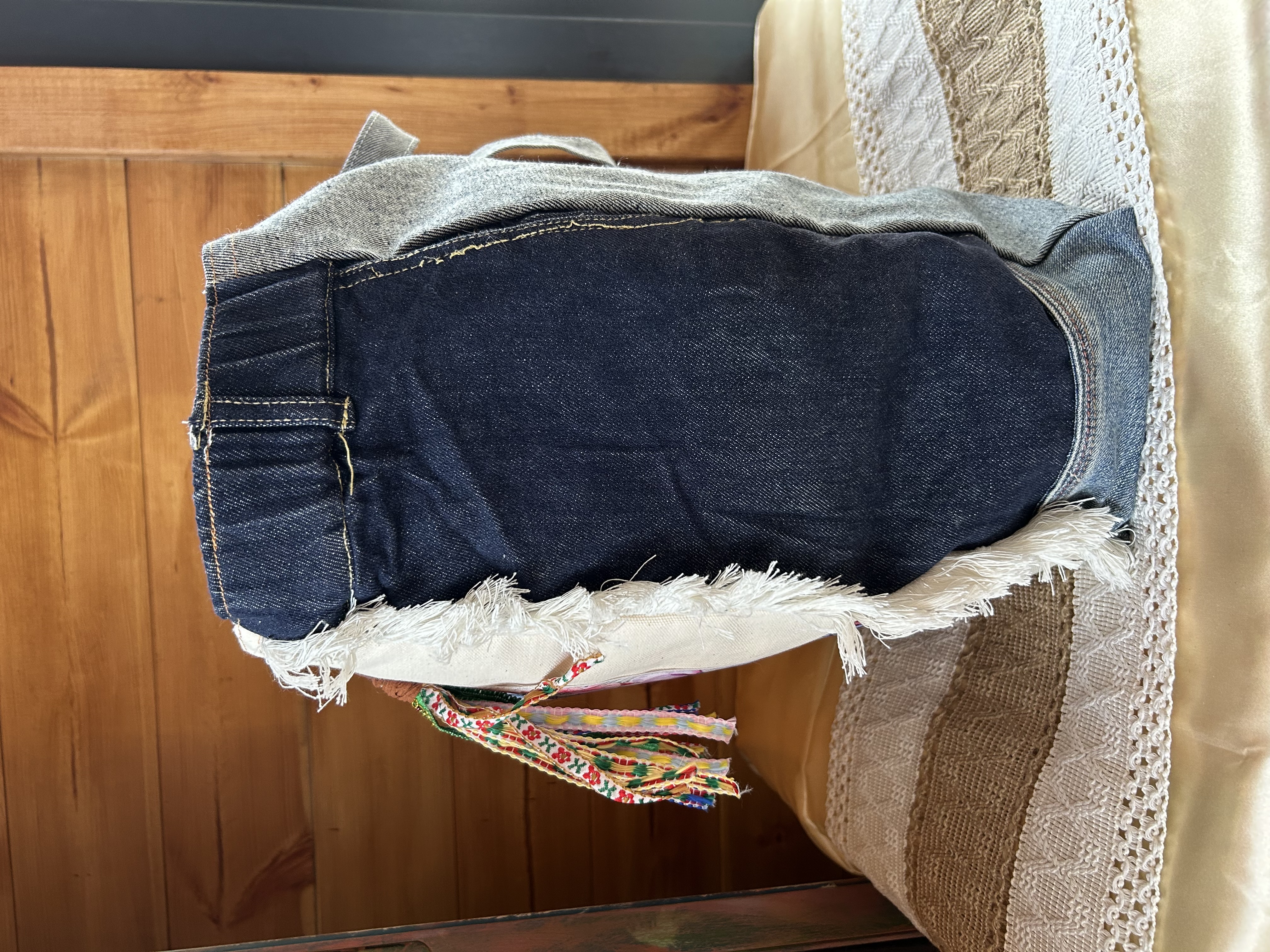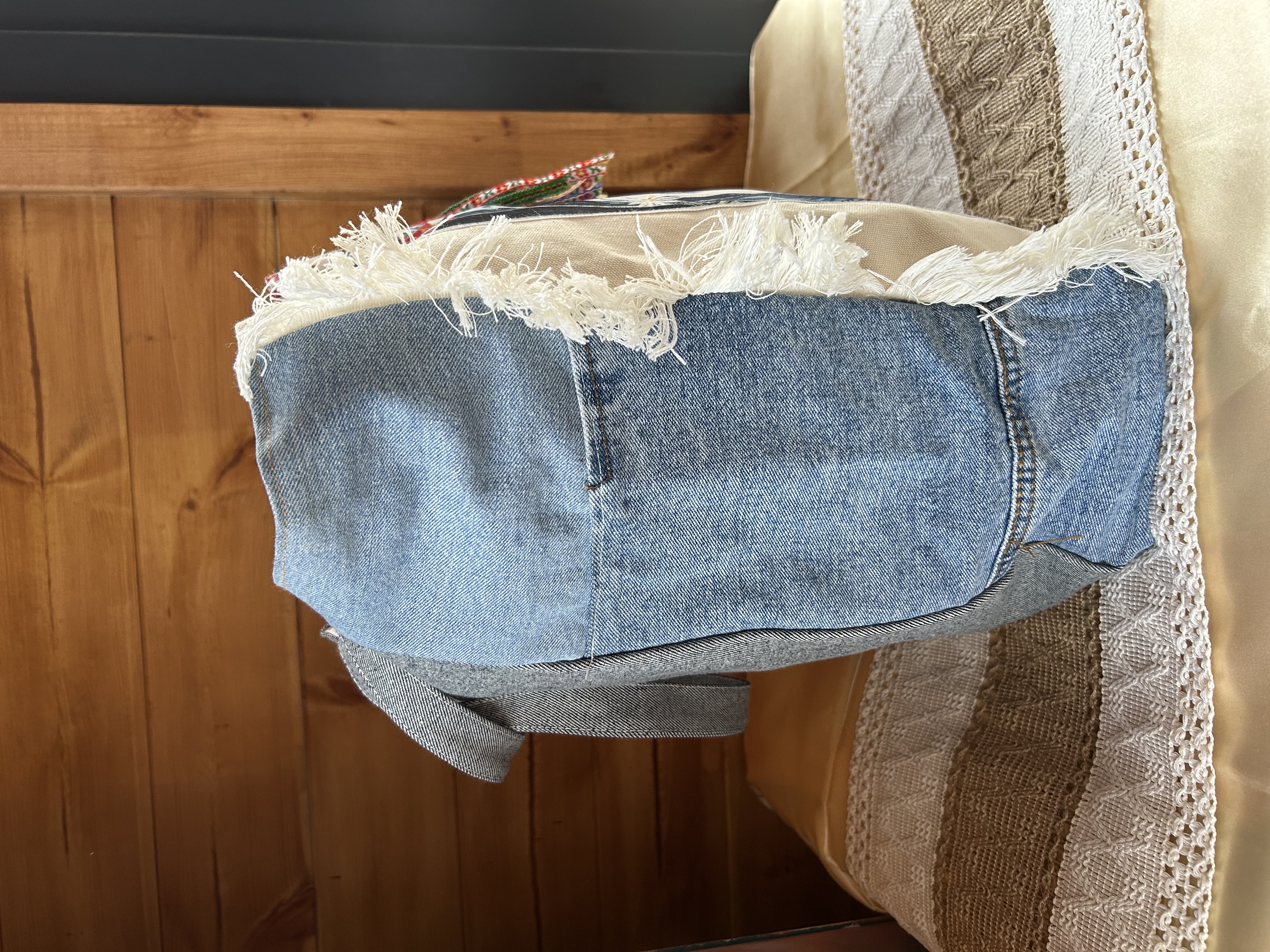 Matières : Toile naturelle, jean recyclé, franges tissées, breloques textiles.