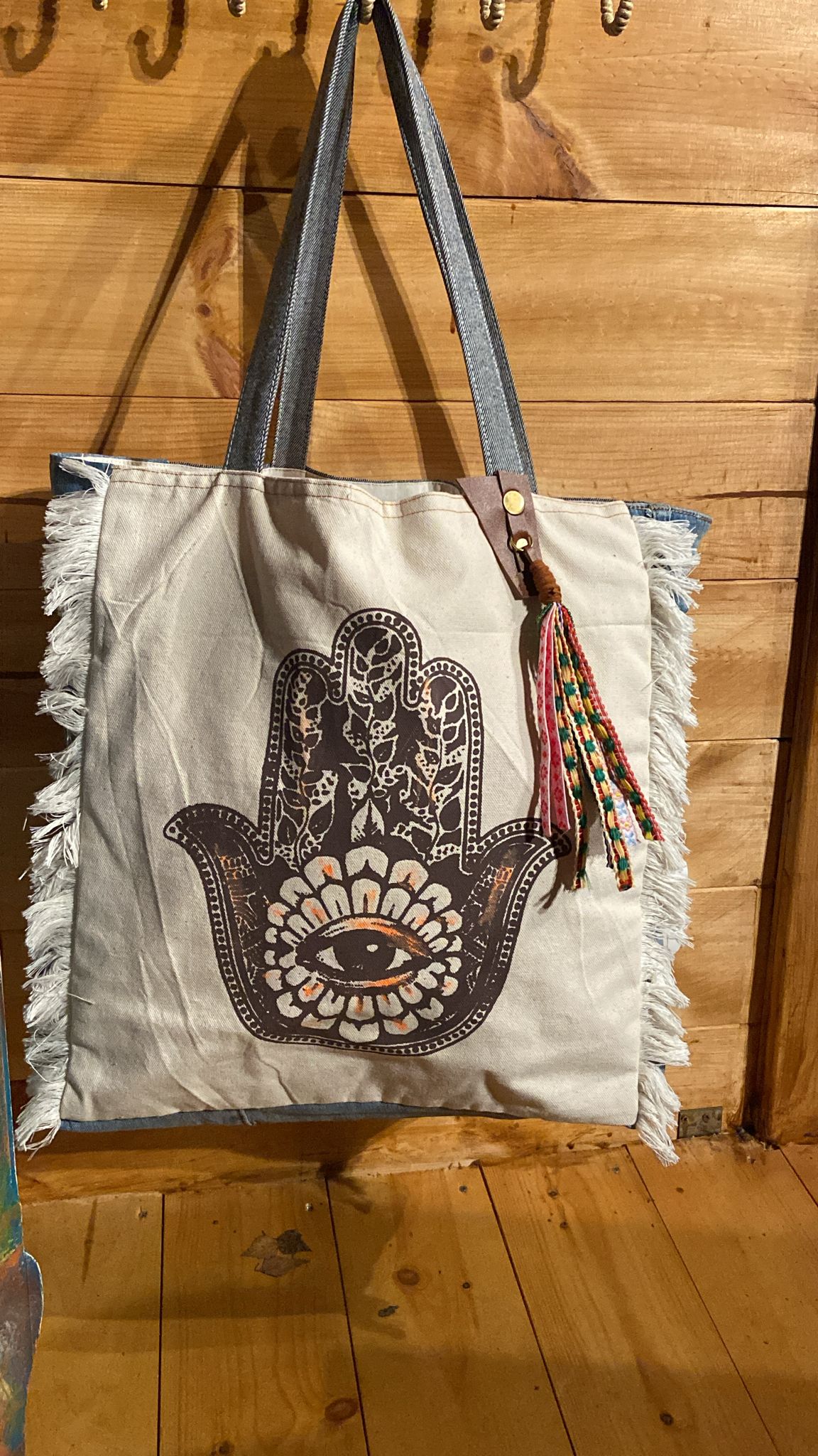 Ce sac unique, confectionné à la main à partir de jean recyclé et de toile naturelle, met en avant le symbole ancestral de la Main de Fatma (Hamsa).