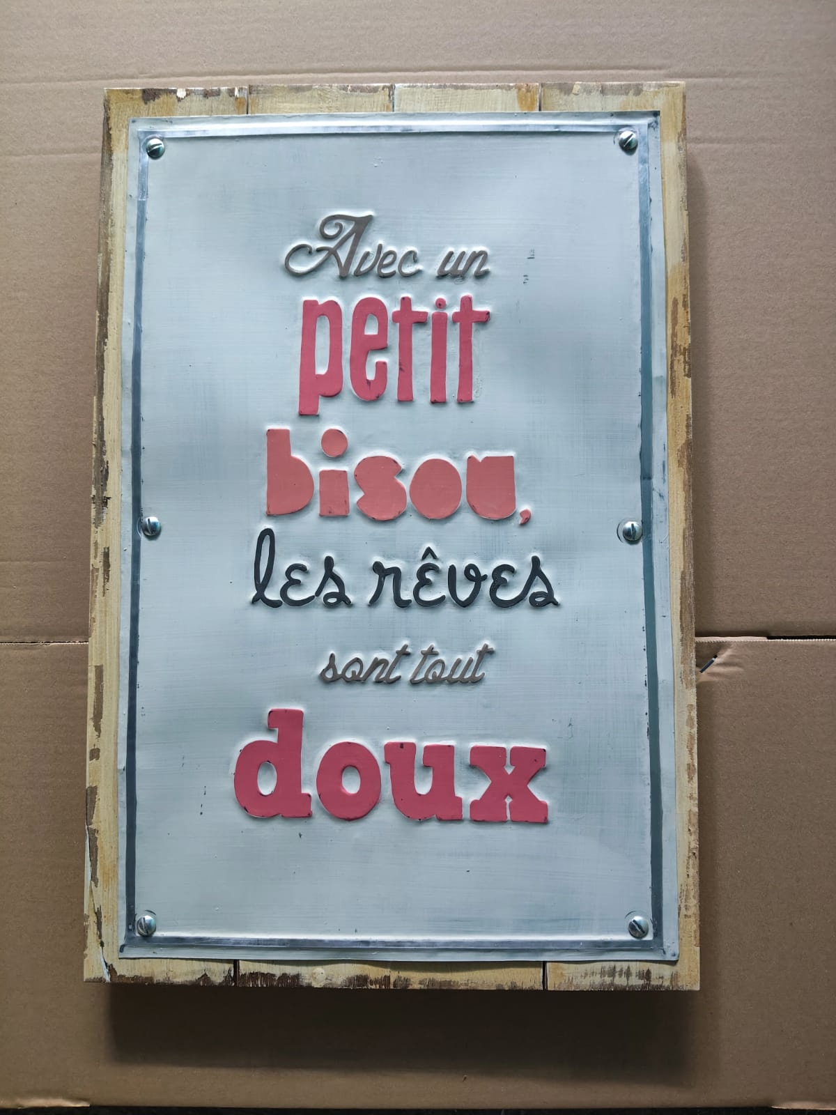 Apportez une note de douceur et de poésie à votre intérieur avec ce grand tableau intégralement conçu en métal de 40 x 60 cm. Son message affectueux — "Avec un petit bisou, les rêves sont tout doux" — est parfait pour créer une atmosphère chaleureuse dans une chambre ou un espace familial.