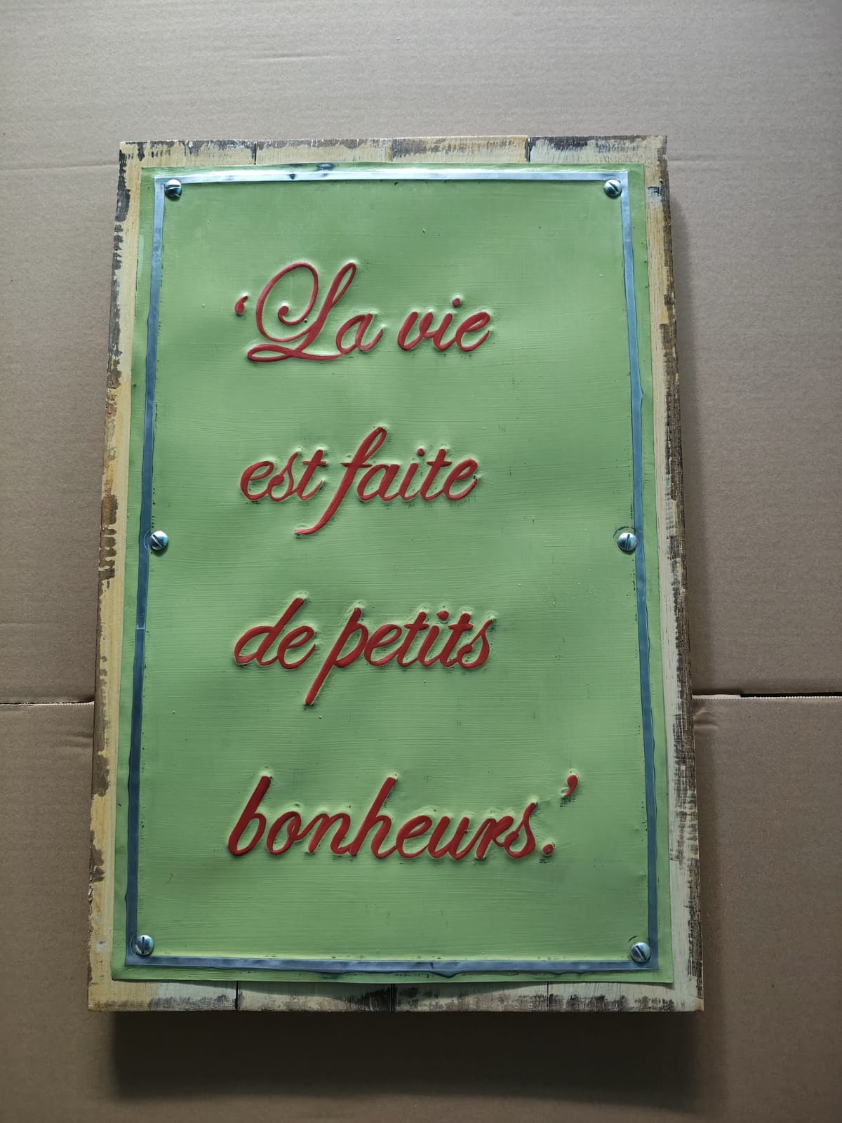 Affichez vos valeurs avec ce grand tableau intégralement conçu en métal de 40 x 60 cm. Son design industriel et son message positif — "La vie est faite de petits bonheurs" — en font une pièce maîtresse pour une décoration à la fois moderne et pleine de sens.