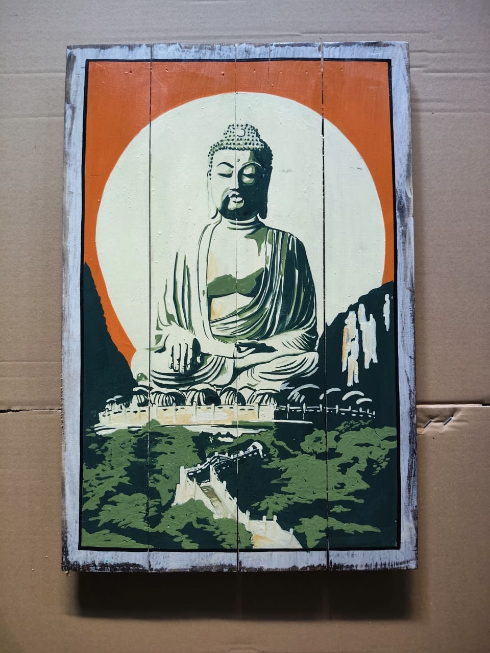 Prenez de la hauteur avec ce grand tableau sur bois véritable de 40 x 60 cm. Cette œuvre lumineuse et panoramique représente Bouddha assis en méditation, surplombant un paysage de montagnes sous un soleil levant, symbolisant l'harmonie et l'éveil.