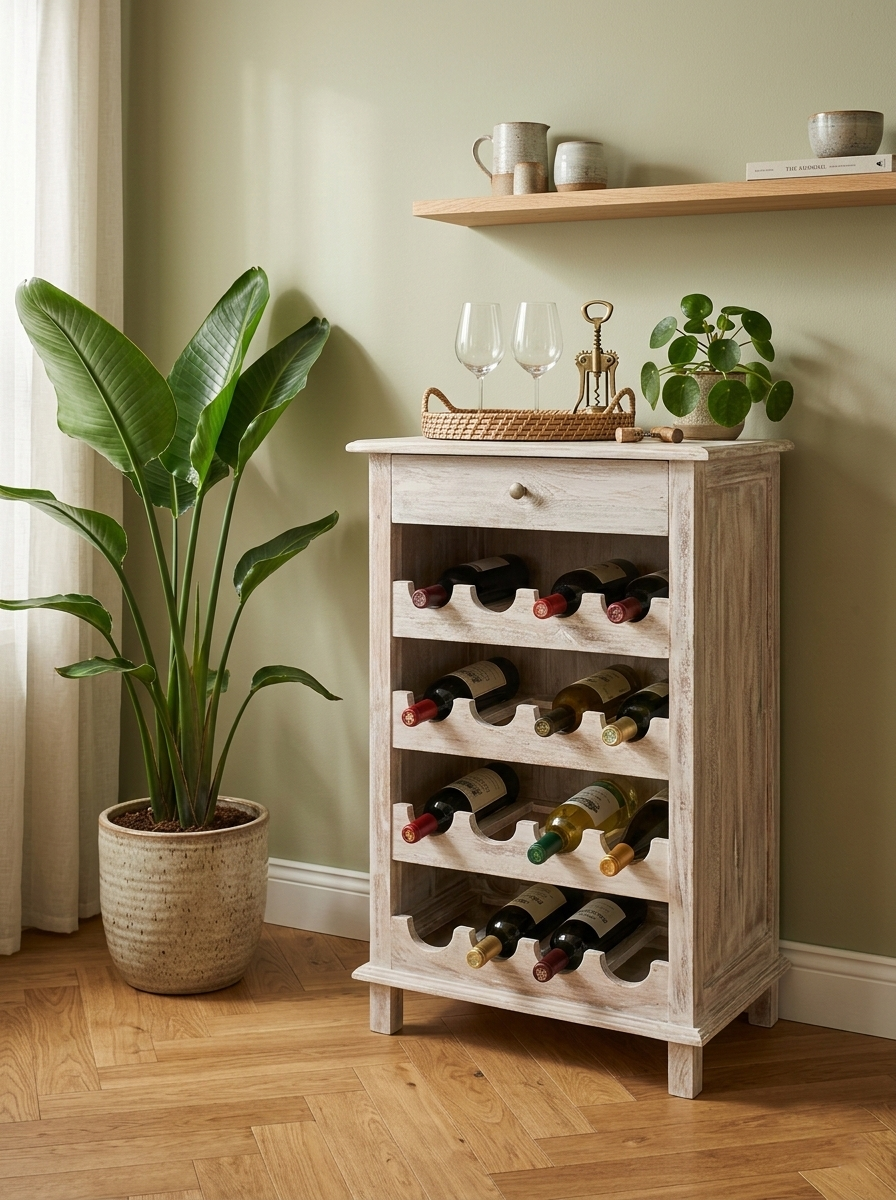 Sublimez votre cave ou votre salon avec ce meuble à bouteilles en teck massif. Alliant praticité et esthétique exotique, ce casier présente une finition blanche patinée qui apporte une touche de clarté et d'élégance à votre intérieur. Fabriqué artisanalement en Indonésie, il est bien plus qu’un simple rangement : c’est une pièce de décoration qui a une âme.