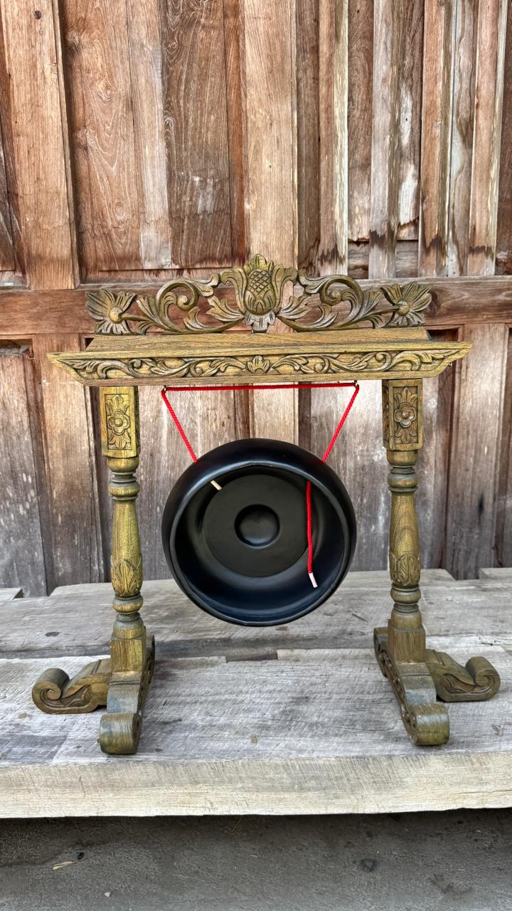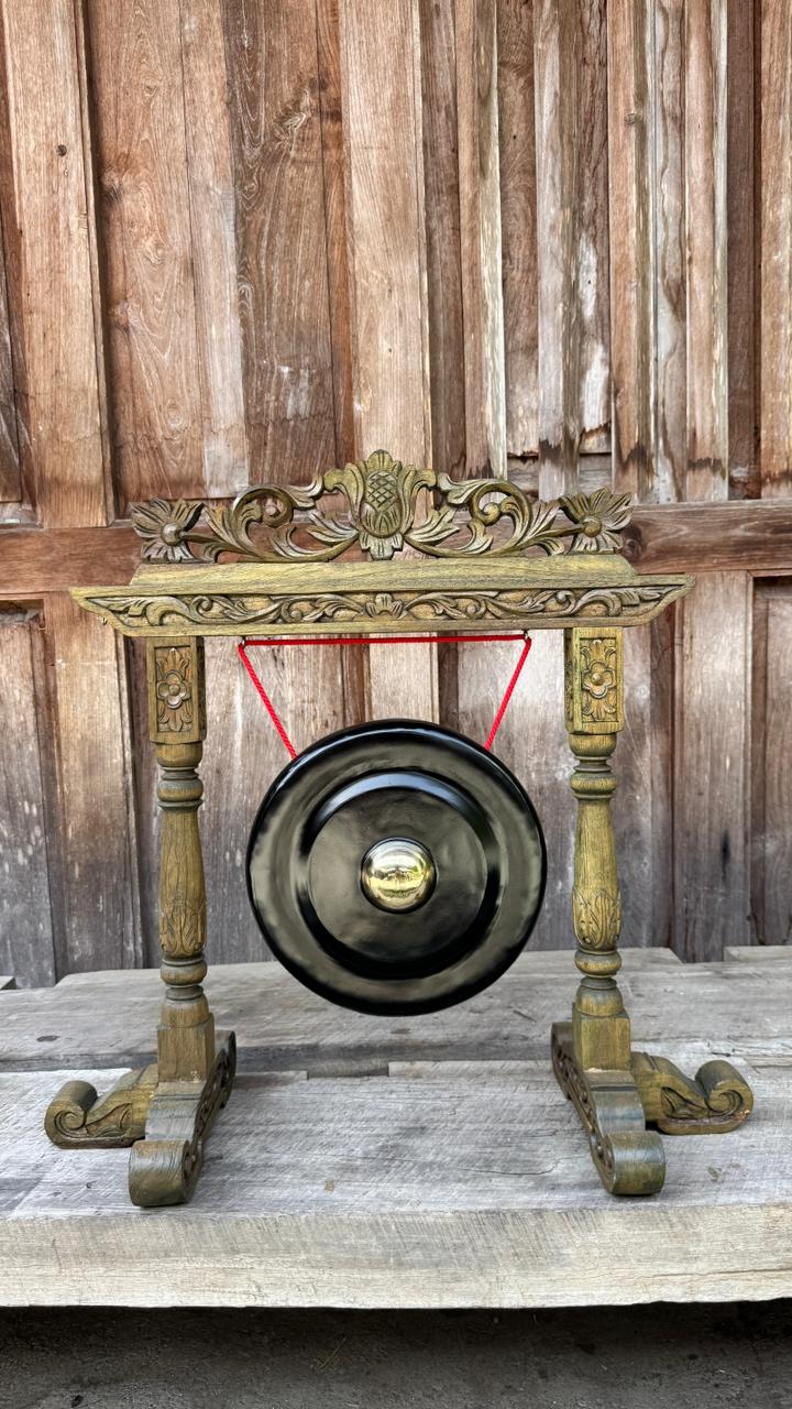 Retrouvez toute l'authenticité de l'artisanat indonésien dans un format condensé avec ce Petit Gong traditionnel. Sculpté à la main dans du teck massif, ce modèle arbore une patine unique aux nuances vert antique et bronze, lui conférant un aspect de pièce de collection ancienne. Sa taille optimisée permet d'apporter une touche spirituelle et raffinée à votre intérieur, même dans les espaces les plus restreints.