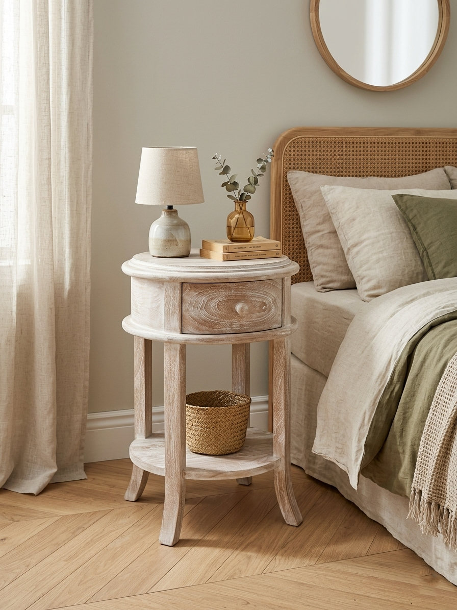 Sublimez votre espace de repos avec cette table de nuit ronde au charme intemporel. Fabriquée en teck massif, elle se distingue par sa silhouette galbée et sa finition patinée blanc qui apporte douceur et luminosité à votre chambre. Son design circulaire permet de casser les lignes droites de la pièce pour créer une atmosphère plus enveloppante, zen et élégante.